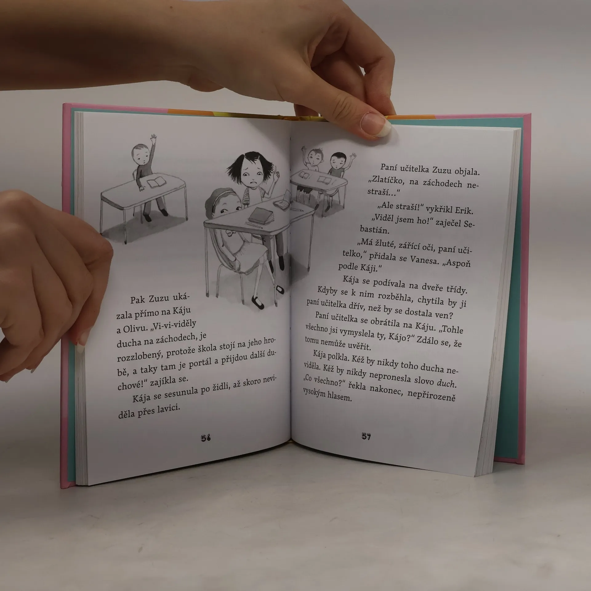 Nejlepší kamarádky Kája a Oliva spolu zažívají jedno dobrodružství za druhým. Tentokrát je čeká velká záhada, na školních záchodech totiž objeví ducha! Oči mu světélkují a vydává podivné zvuky. To je ta nejúžasnější věc, kterou kdy zažily! Po škole se zpráva šíří rychlostí blesku a Kája s Olivou jsou nadšené – alespoň do té doby, než na jejich tajemství přijde paní učitelka. Podle ní duchové do školy nepatří. Kája s Olivou teď budou muset vymyslet, jak ducha poslat pryč. Podaří se jim to? Možná. Bude to zábava a legrace? Jasně!