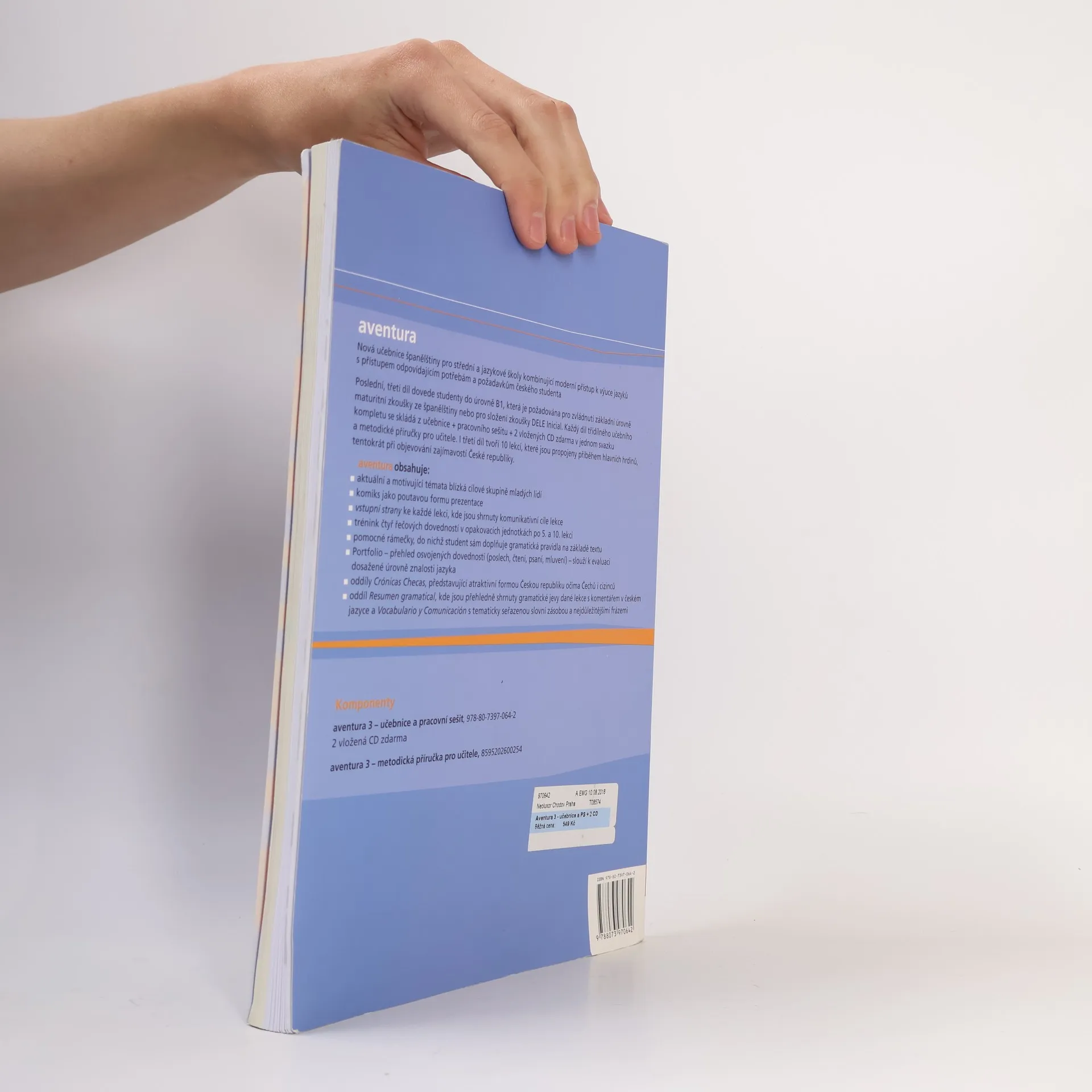 Nová učebnice španělštiny Aventura 3 je určená pro střední a jazykové školy kombinující moderní přístup k výuce jazyků s přístupem odpovídajícím potřebám a požadavkům českého studenta. Poslední, třetí díl dovede studenty do úrovně B1, která je požadována pro zvládnutí základní úrovně maturitní zkoušky ze španělštiny nebo pro složení zkoušky DELE Inicial. I třetí díl tvoří 10 lekcí, které jsou propojeny příběhem hlavních hrdinů, tentokrát při objevování zajímavostí České republiky.