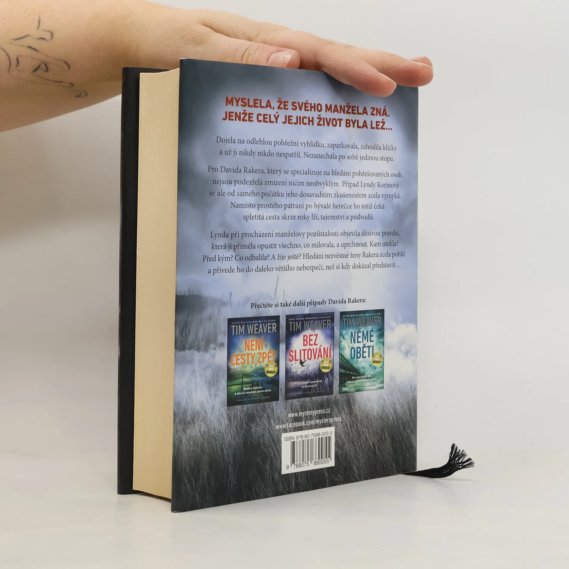 MYSLELA, ŽE SVÉHO MANŽELA ZNÁ. JENŽE CELÝ JEJICH ŽIVOT BYLA LEŽ… Dojela na odlehlou pobřežní vyhlídku, zaparkovala, zahodila klíčky a už ji nikdy nikdo nespatřil. Nezanechala po sobě jedinou stopu. Pro Davida Rakera, který se specializuje na hledání pohřešovaných osob, nejsou podezřelá zmizení ničím neobvyklým. Případ Lyndy Korinové se ale od samého počátku jeho dosavadním zkušenostem zcela vymyká. Namísto prostého pátrání po bývalé herečce ho totiž čeká spletitá cesta skrze roky lží, tajemství a podvodů. Lynda při procházení manželovy pozůstalosti objevila děsivou pravdu, která ji přiměla opustit všechno, co milovala, a uprchnout. Kam utekla? Před kým? Co odhalila? A žije ještě? Hledání nezvěstné ženy Rakera zcela pohltí a přivede ho do daleko většího nebezpečí, než si kdy dokázal představit…