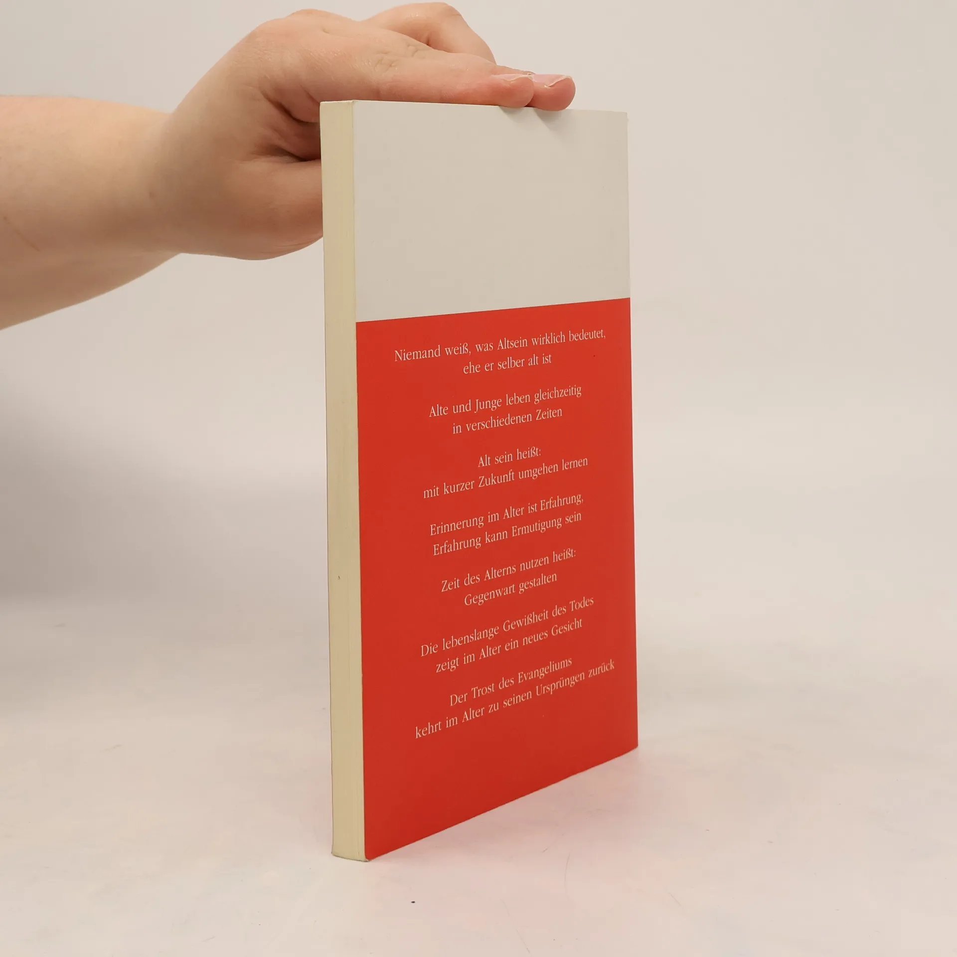 1. These: Niemand weiß, was Altsein wirklich bedeutet, ehe er selber alt ist 2. These: Alte und Junge leben gleichzeitig in verschiedenen Zeiten 3. These: Alt sein heißt: mit kurzer Zukunft umgehen lernen 4. These: Erinnerung im Alter ist Erfahrung, Erfahrung kann Ermutigung sein 5. These: Zeit des Alterns nutzen heißt: Gegenwart gestalten 6. These: Die lebenslange Gewißheit des Todes zeigt im Alter ein neues Gesicht 7. These: Der Trost des Evangeliums kehrt im Alter zu seinen Ursprüngen zurück