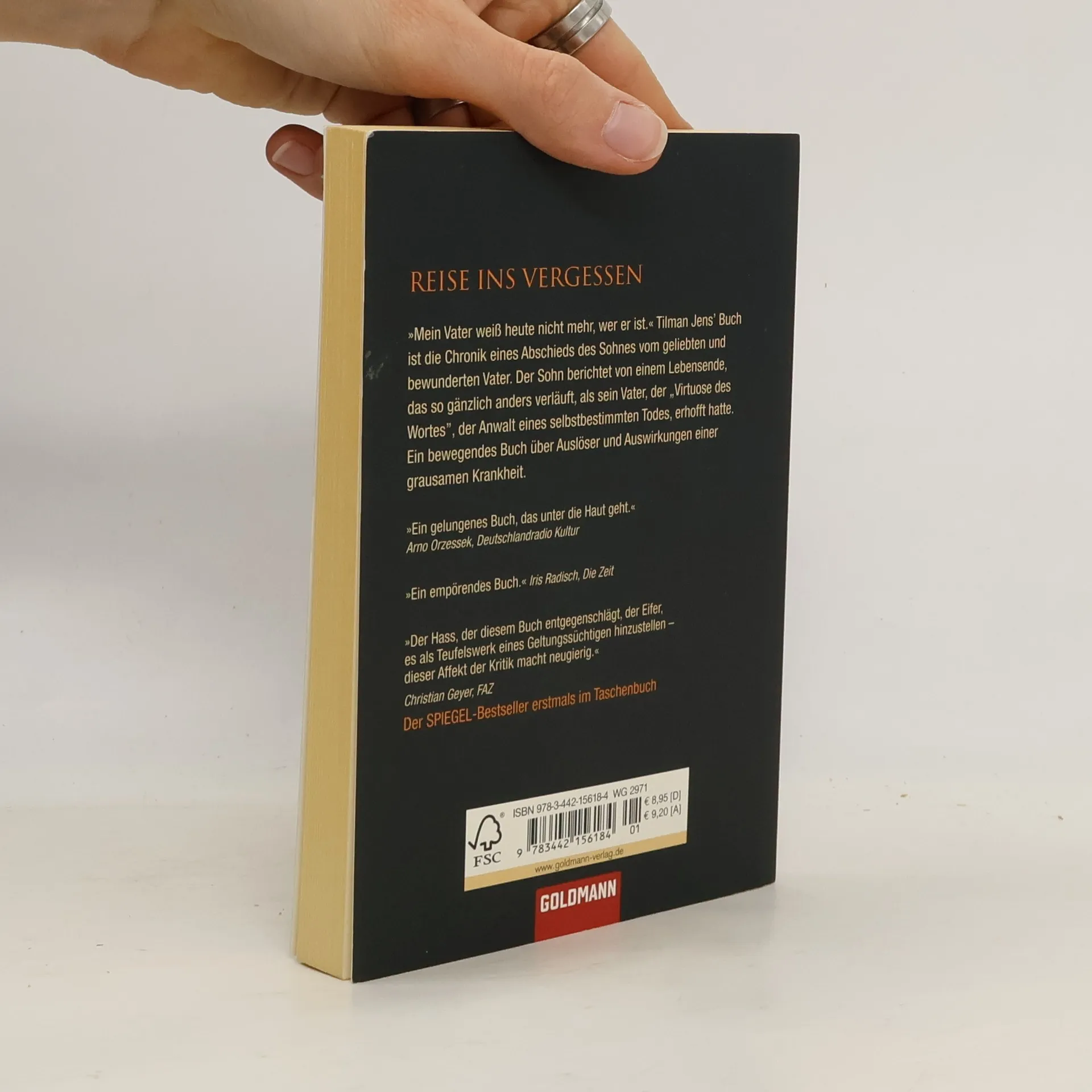 „Mein Vater weiß heute nicht mehr, wer er ist.“ Walter Jens und die Reise ins Vergessen. Tilman Jens’ Buch ist die Chronik eines langsamen Abschieds des Sohnes vom geliebten und bewunderten Vater. Der Sohn berichtet von einem Lebensende, das so gänzlich anders verläuft, als sein Vater, der „Virtuose des Wortes”, der Anwalt eines selbstbestimmten Todes, erhofft hatte. Ein bewegendes Buch über Auslöser und Auswirkungen einer grausamen Krankheit.