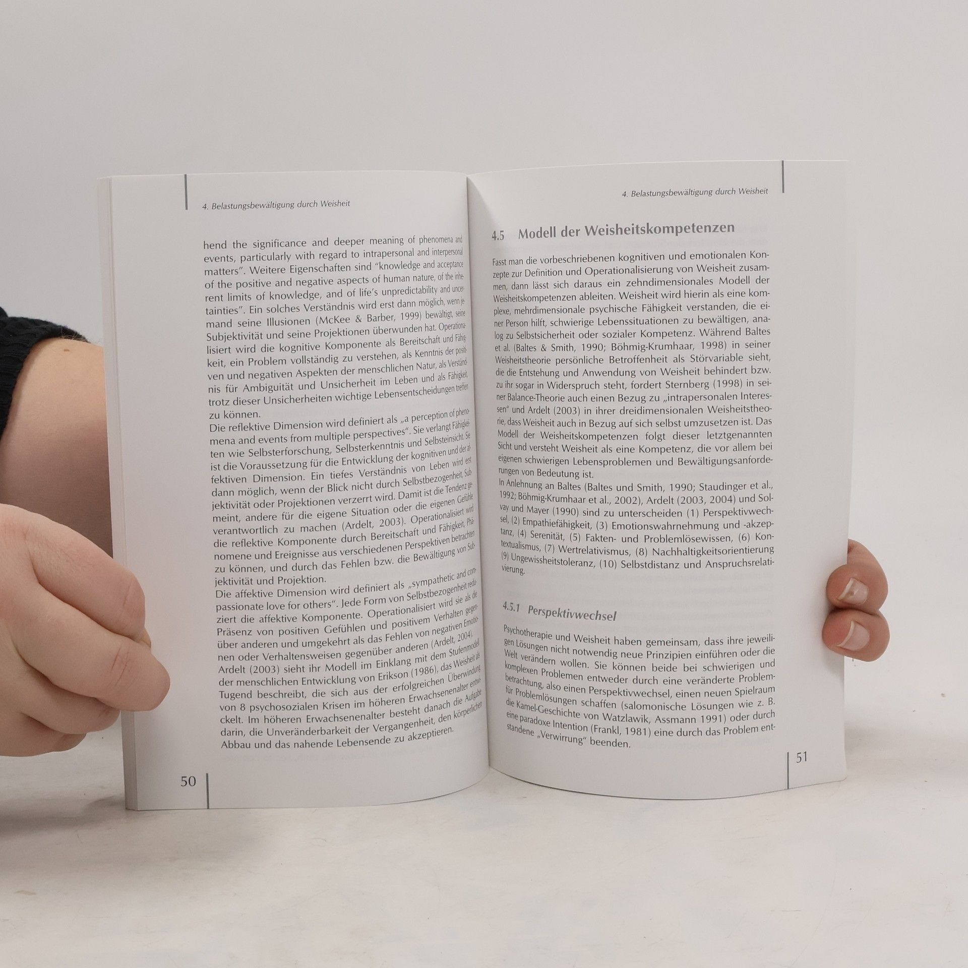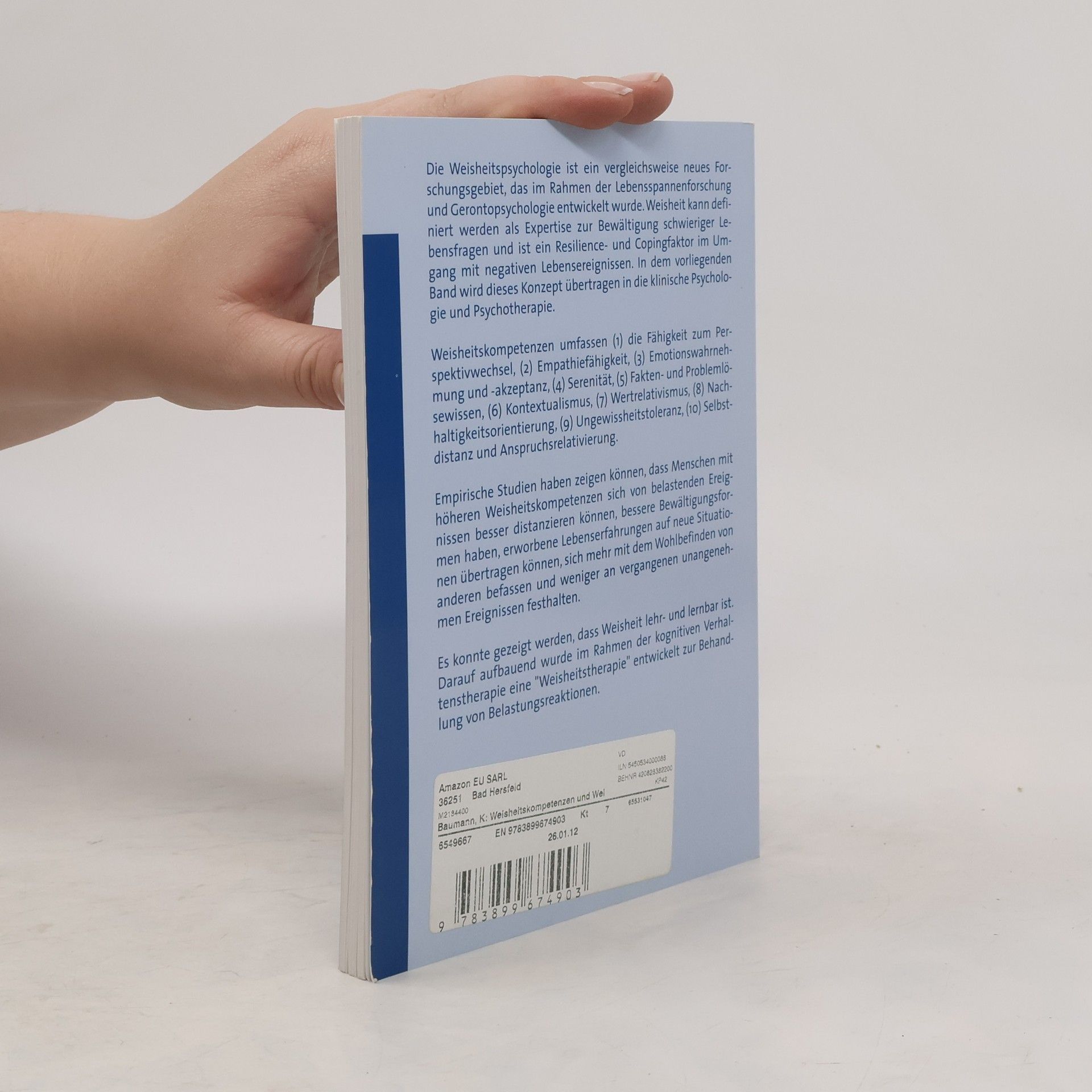 Die Weisheitspsychologie ist ein vergleichsweise neues Forschungsgebiet, das im Rahmen der Lebensspannenforschung und Gerontopsychologie entwickelt wurde. Weisheit kann definiert werden als Expertise zur Bewältigung schwieriger Lebensfragen und ist ein Resilience- und Copingfaktor im Umgang mit negativen Lebensereignissen. In dem vorliegenden Band wird dieses Konzept übertragen in die klinische Psychologie und Psychotherapie. Weisheitskompetenzen umfassen (1) die Fähigkeit zum Perspektivwechsel, (2) Empathiefähigkeit, (3) Emotionswahrnehmung und -akzeptanz, (4) Serenität, (5) Fakten- und Problemlösewissen, (6) Kontextualismus, (7) Wertrelativismus, (8) Nachhaltigkeitsorientierung, (9) Ungewissheitstoleranz, (10) Selbstdistanz und Anspruchsrelativierung. Empirische Studien haben zeigen können, dass Menschen mit höheren Weisheitskompetenzen sich von belastenden Ereignissen besser distanzieren können, bessere Bewältigungsformen haben, erworbene Lebenserfahrungen auf neue Situationen übertragen können, sich mehr mit dem Wohlbefinden von anderen befassen und weniger an vergangenen unangenehmen Ereignissen festhalten. Es konnte gezeigt werden, dass Weisheit lehr- und lernbar ist. Darauf aufbauend wurde im Rahmen der kognitiven Verhaltenstherapie eine „Weisheitstherapie“ entwickelt zur Behandlung von Belastungsreaktionen.