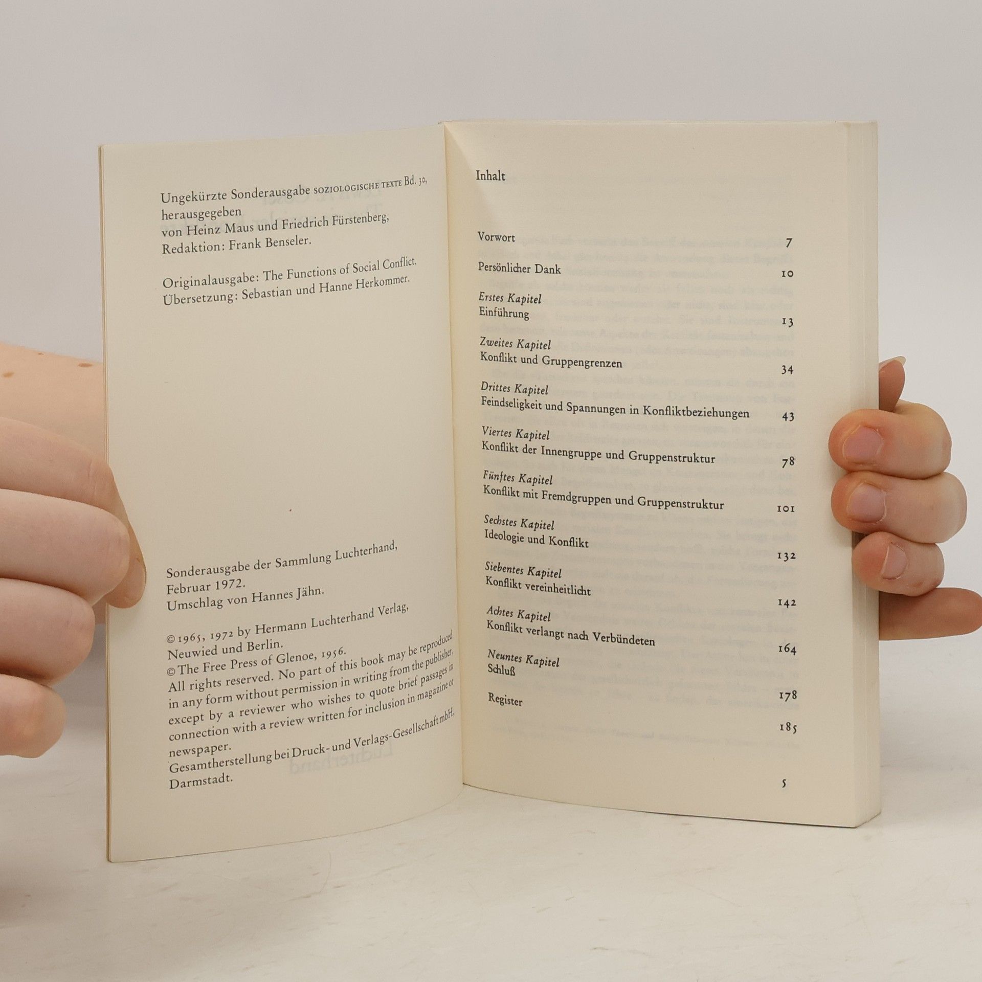 Lewis A. Coser versucht in diesem Klassiker der modernen Sozialwissenschaften im Anschluß an Georg Simmels berühmter Untersuchung über den „Streit“ den Begriff des sozialen Konfliktes zu klären und dessen empirische Anwendungsmöglichkeiten aufzuzeigen. Als eines der wichtigsten Bücher der neueren Konfliktforschung hat es in der zweiten Hälfte des 20. Jahrhunderts die in diesem Zusammenhang geführten theoretischen Kontroversen maßgeblich bestimmt und eine Vielzahl von empirischen Untersuchungen angeregt.
