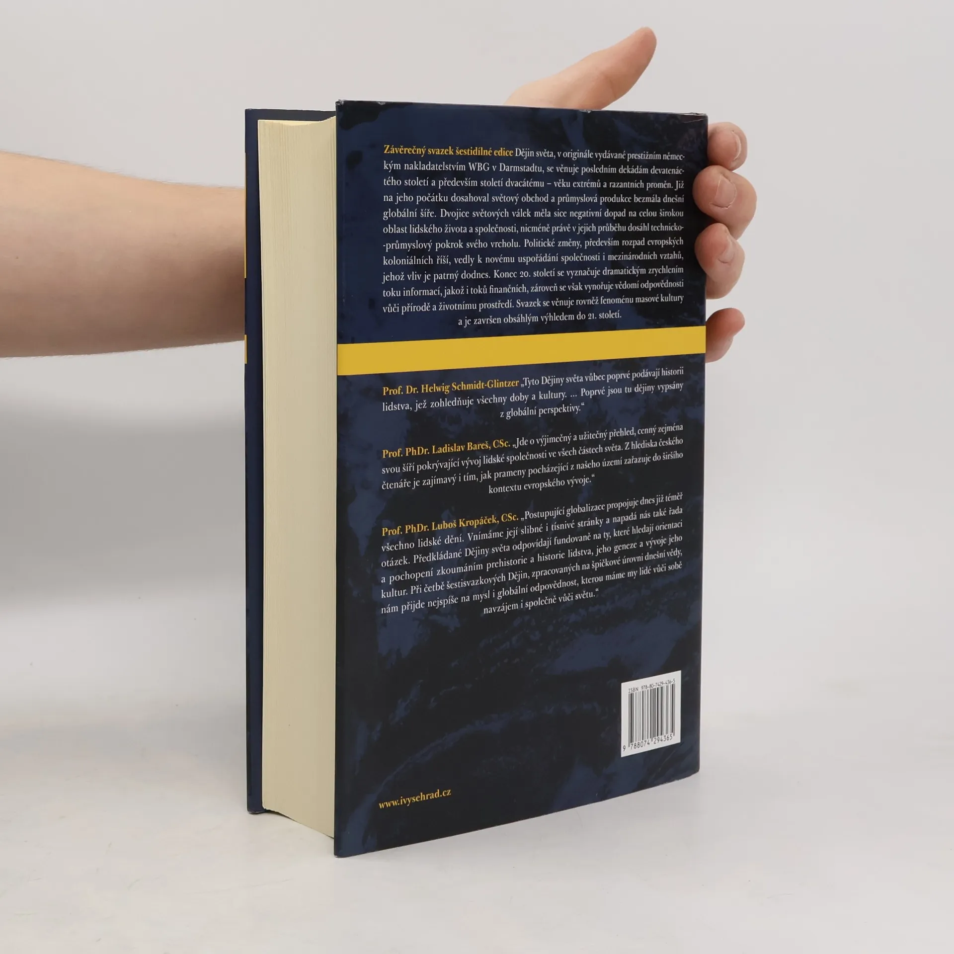 Globální dějiny od počátků do 21. století. Sv. 6 - Globalizace od roku 1880 do dneška. Závěrečný svazek šestidílné edice Dějin světa, v originále vydávané prestižním německým nakladatelstvím WBG v Darmstadtu, se věnuje dvacátému století – století razantních proměn. Již na jeho počátku dosahoval obchod a průmyslová produkce bezmála dnešní globální šíře. Dvojice světových válek měla sice negativní dopad na celou širokou oblast lidského života a společnosti, nicméně právě v jejich průběhu dosáhl technicko-průmyslový pokrok svého vrcholu. Politické změny vedly k novému uspořádání společnosti i mezinárodních vztahů, jehož vliv je patrný dodnes. Konec 20. století se vyznačuje dramatickým zrychlením toku informací, jakož i toků finančních, zároveň se však vynořuje vědomí odpovědnosti vůči přírodě a životnímu prostředí. Svazek se věnuje rovněž fenoménu masové kultury a je završen obsáhlým výhledem do 21. století.