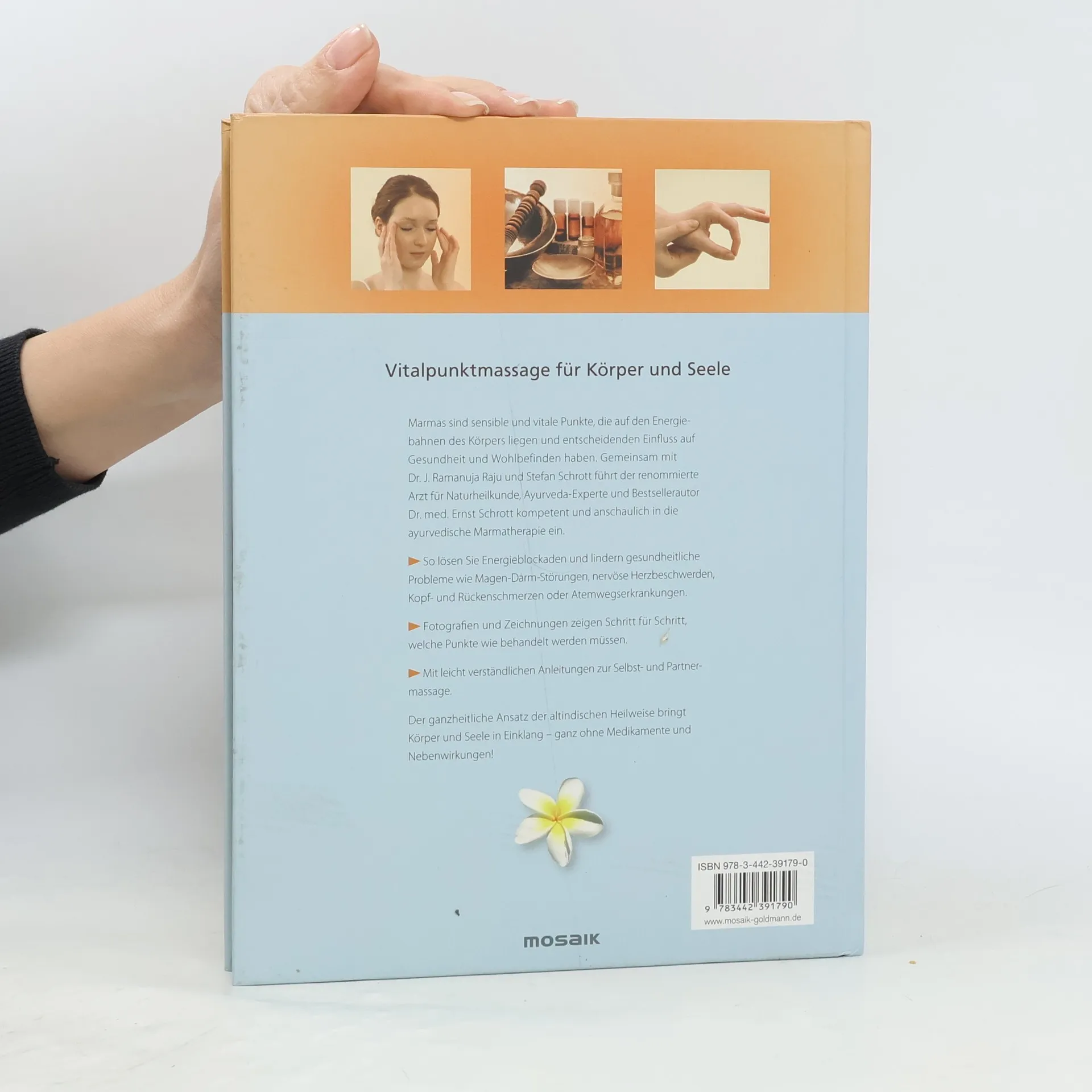 Mit der Marmatherapie gesund durch’s Leben Durch die Massage der sensiblen Marma-Punkte, die auf den Energiebahnen des Körpers liegen, lassen sich Energieblockaden lösen. Schmerzen und Krankheiten wie nervöse Herzbeschwerden, Kopf- und Rückenschmerzen, Schlafstörungen, Erkältung, Prüfungsangst oder Hautprobleme u. v. m. werden dadurch gelindert.Kompetent und leicht verständlich stellt der Bestsellerautor und Ayurveda-Experte Dr. med. Ernst Schrott die ayurvedische Marmatherapie mit Selbst- und Partnerbehandlung vor: Der ganzheitliche Ansatz der altindischen Marmatherapie bringt Körper und Seele auf sanfte Weise in Einklang – ganz ohne Medikamente und Nebenwirkungen.Fotografien und Zeichnungen zeigen Schritt für Schritt, welche Punkte wie behandelt werden müssen, um bestimmte Beschwerden zu heilen und das Wohlbefinden zu steigern.Marmatherapie – das indische Pendant zur chinesischen Akupressur. Ausstattung: durchgehend 4-farbig, 100 farbige Abbildungen