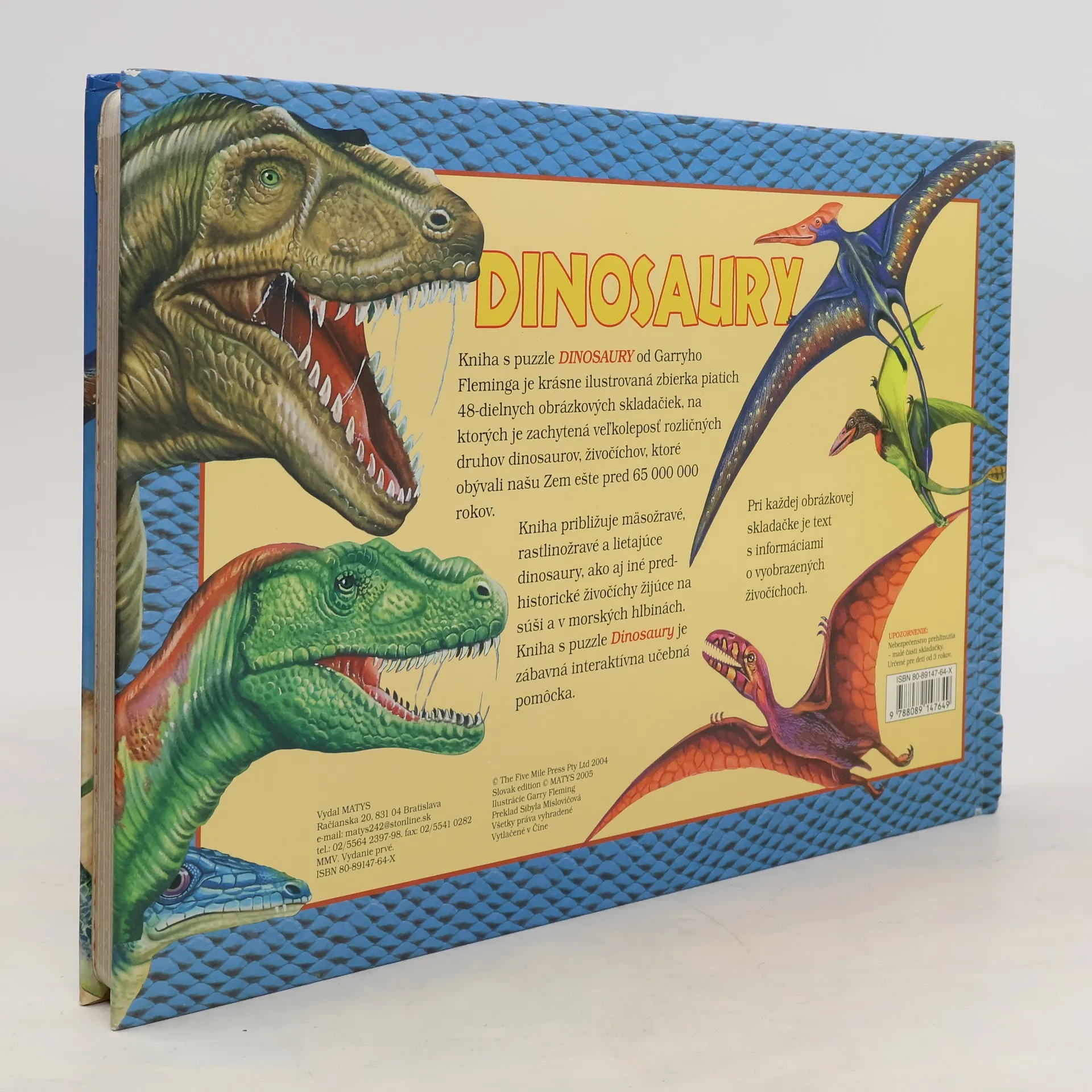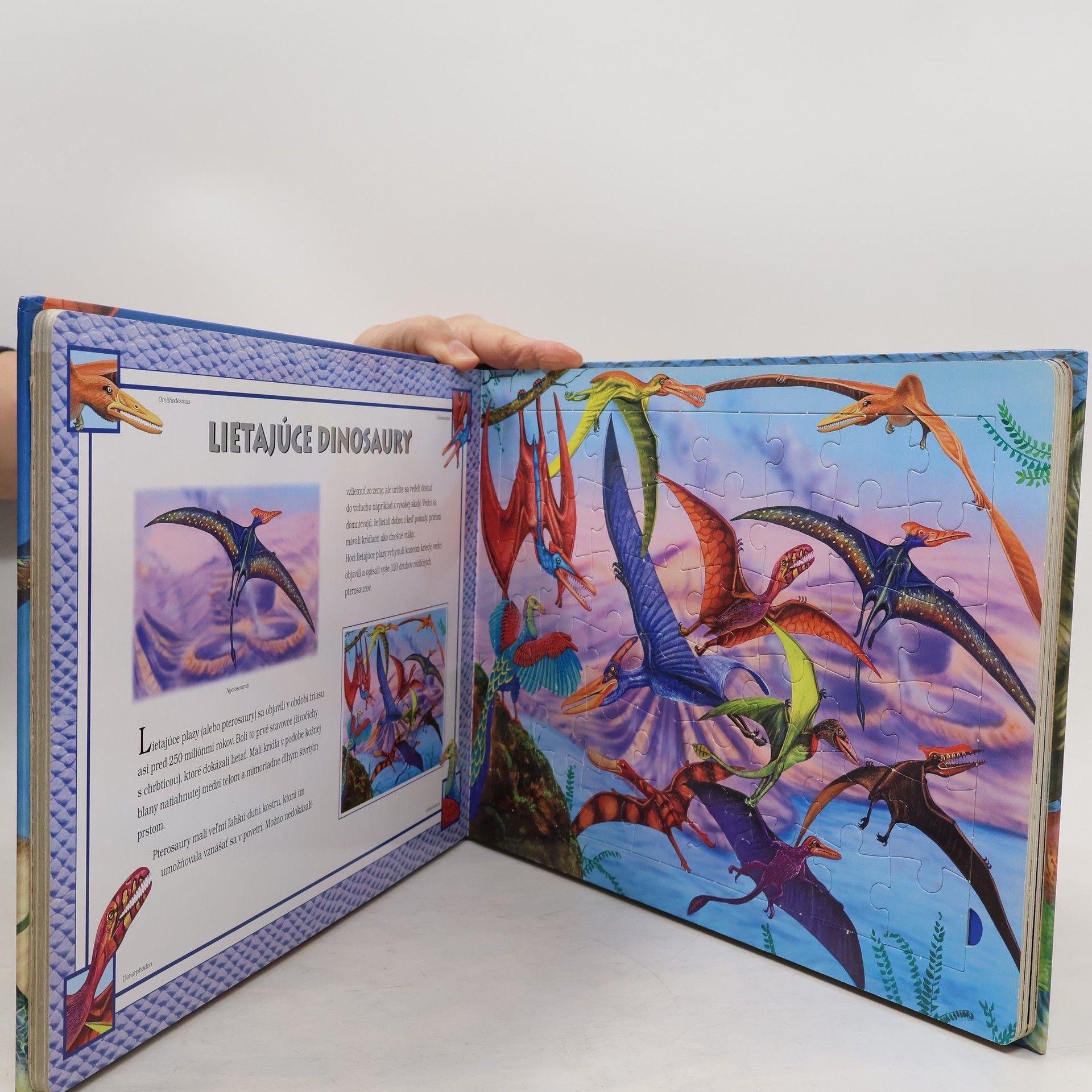 Kniha s puzzle je krásne ilustrovaná zbierka piatich 48-dielnych obrázkových skladačiek, na ktorých je zachytená veľkoleposť rozličných druhov dinosaurov.