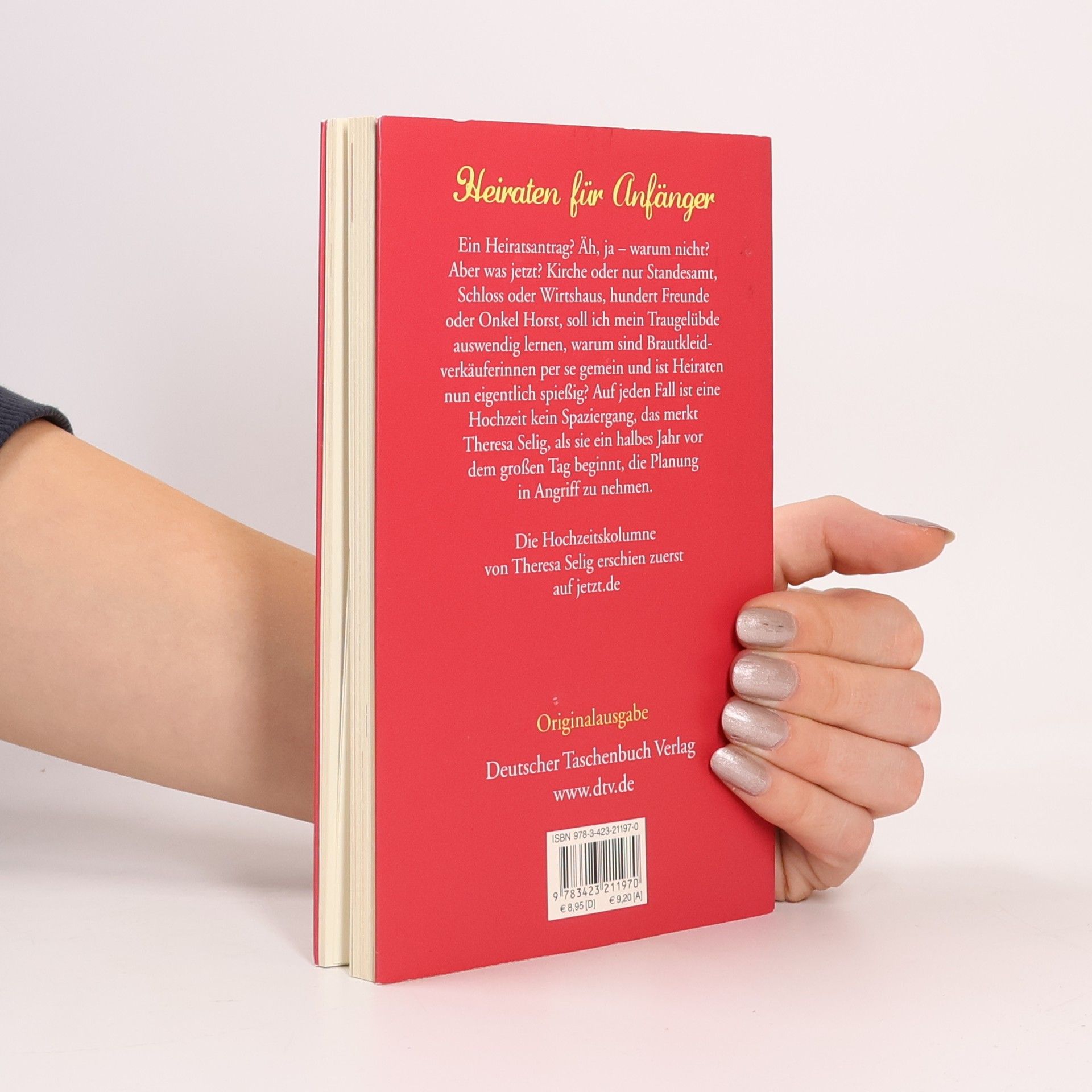 »So, so, verlobt. Macht man das heute wieder so?«   Theresa Selig beschreibt witzig und authentisch, was einer Braut während der Hochzeitsvorbereitungen durch den Kopf geht. Für Bräute und beste Freundinnen, Schwestern, Cousinen, Mitbewohnerinnen ..., von einer Braut in spe. Die reinste »Ja, so isses«-Lektüre und noch dazu Orientierungshilfe im Hochzeitsdschungel aus möglichen Locations, Arten der Feiergestaltung und der Frage, ob man Onkel Horst wirklich einladen soll. Das Buch basiert auf der sehr erfolgreichen Hochzeitskolumne ›Theresa heiratet. Jede Woche ein bisschen mehr‹ auf jetzt. de.