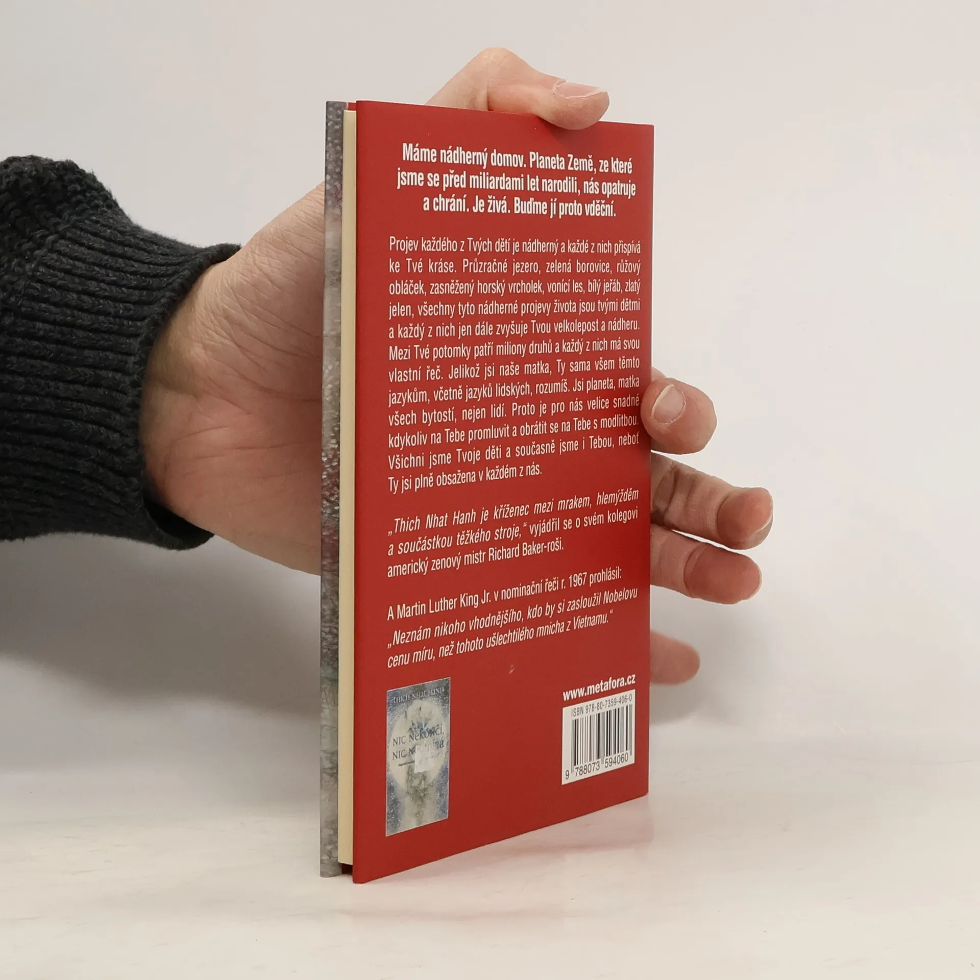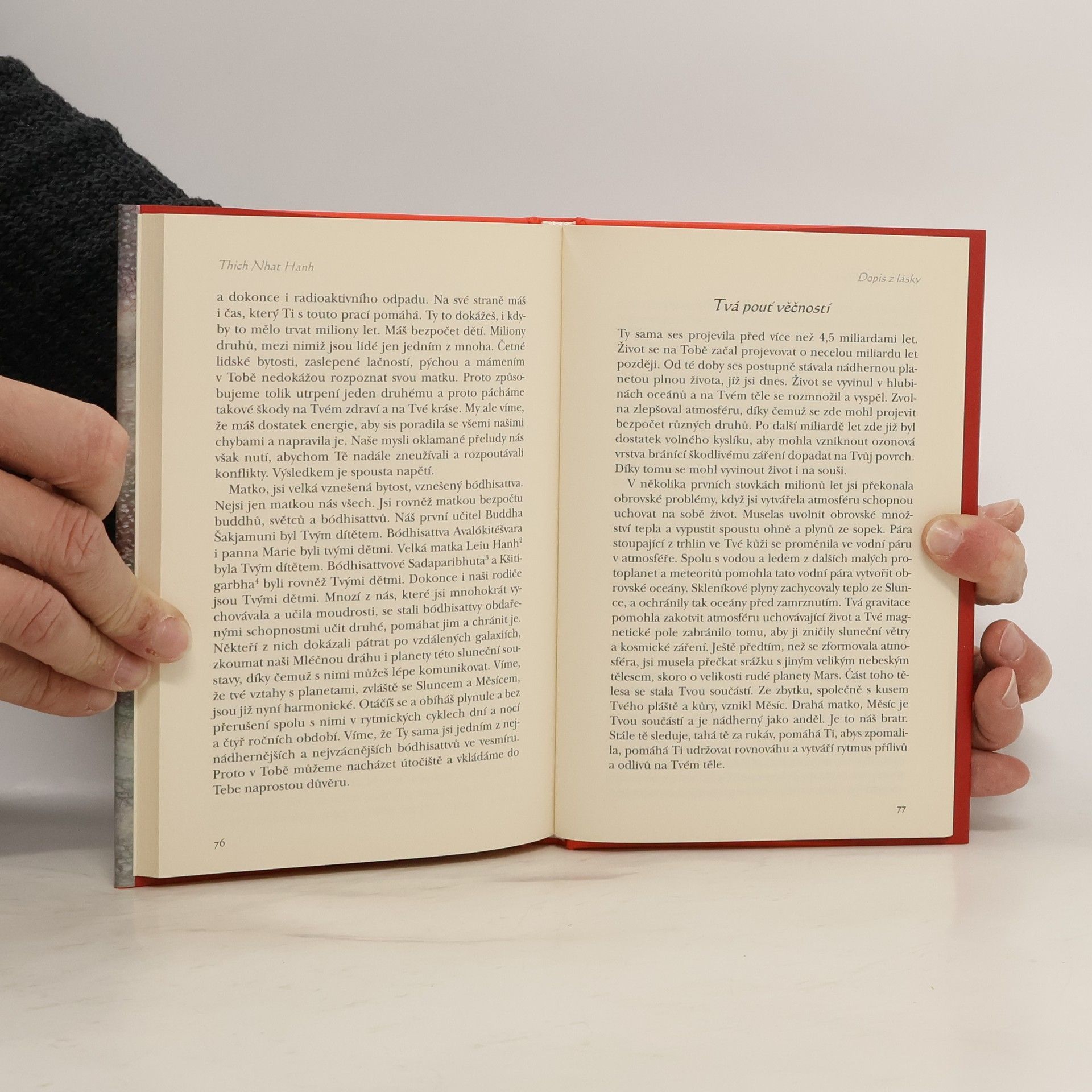 Láskyplný vzkaz Matce Zemi od jejích dětí. Autor téhle rozsahem nevelké, ale myšlenkami ohromné knihy, buddhistický mnich Thich Nhat Hanh se pustil do psaní dopisu. Na tom by nebylo nic tak zvláštního, kdyby ovšem adresátem nebyla naše planeta. Je přesvědčen, že pokud ji budeme chápat jako něco, na čem prostě jen žijeme, a nepochopíme, že jsme její nedílnou součástí, nikdy nemůžeme dosáhnout svého plného potenciálu a uzdravení - našich životů, našich duší, i celé Země. „Pokud pochopíme, že Země je živoucí bytost," říká autor, „dokážeme se uzdravit a dokážeme uzdravit i samu Zemi. ... Jestliže budete schopni pohlížet na vlastní tělo jako na zázrak, budete vnímat jako zázrak i Zemi a tělo Země se začne uzdravovat." K tomu, abychom se i my nechali unášet tímto proudem lásky, se nemusíme stát buddhisty a už vůbec ne mnichy. Přesto se můžeme naučit hlubšímu vnímání, vcítění a jednoduchým meditacím, k nimž dostaneme právě tak jednoduchý a pochopitelný návod.