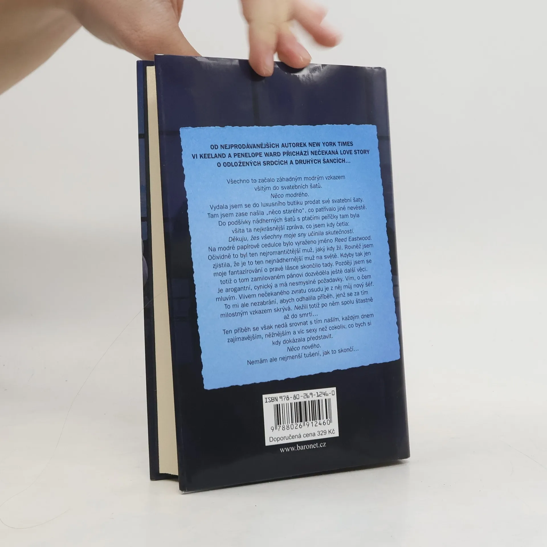 Od nejprodávanějších autorek New York Times Vi Keeland a Penelope Ward přichází nečekaná love story o odložených srdcích a druhých šancích… Všechno to začalo záhadným modrým vzkazem všitým do svatebních šatů. Něco modrého. Vydala jsem se do luxusního butiku prodat své vlastní svatební šaty. Tam jsem zase našla „něco starého“, co patřívalo jiné nevěstě. Do podšívky nádherných šatů s motivem ptačích per tam byla všita ta nejkrásnější zpráva, co jsem kdy četla: Děkuju ti, že jsi mi splnila všechny moje sny. Na modré papírové cedulce bylo vyraženo jméno Reed Eastwood. Očividně to byl ten nejromantičtější muž, jaký kdy žil. Rovněž jsem zjistila, že je to ten nejnádhernější muž na světě. Kdyby jen moje fantazírování o pravé lásce tady skončilo. Později jsem totiž o tom zamilovaném pánovi zjistila ještě další věci. Je arogantní, cynický a má nesmyslné požadavky. Vím, o čem mluvím. Vlivem nečekaného zvratu osudu je z něj můj nový šéf. To mě ale nezastaví, abych odhalila příběh, jenž se za tím milostným vzkazem skrývá. Milostným vzkazem, po němž spolu nežili šťastně až do smrti… Ten příběh se však nedá srovnat s tím naším, každým dnem zajímavějším, něžnějším a víc sexy než cokoliv, co bych si kdy dokázala představit. Něco nového. Nemám ale nejmenší tušení, jak to skončí…