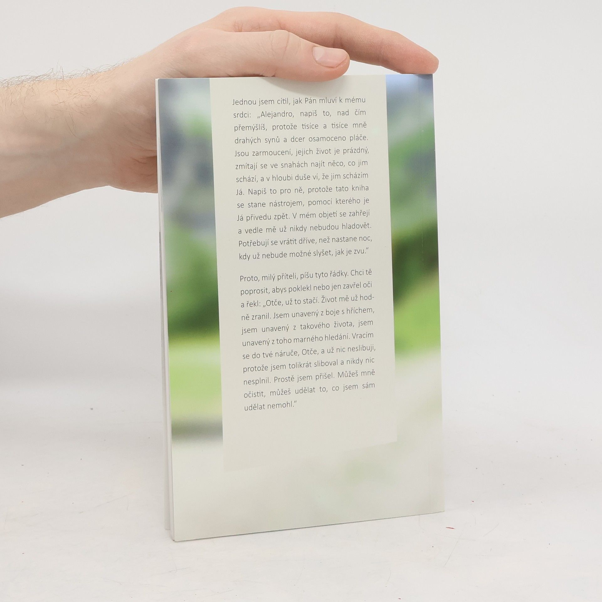 Jednou jsem cítil, jak Pán mluvil k mému srdci: „Allejandro, napiš to, nad čím přemýšlíš, protože tisíce a tisíce mě drahých synů a dcer osamoceno pláče. Jsou zarmouceni, jejich život je prázdný, zmítají se v snahách najít něco, co jim schází, a v hloubi duše ví, že jim scházím Já. Napiš to pro ně, protože tato kniha se stane nástrojem, pomocí kterého je přivedu zpět. V mém objetí se zahřejí a vedle Mě už nikdy nebudou hladovět. Potřebují se vrátit dříve, než nastane noc, kdy už nebude možné slyšet, jak je zvu." Proto milý příteli, píšu tyto řádky. Chci tě poprosit, abys poklekl, nebo jen zavřel oči a řekl: „Otče už to stačí. Život mě už hodně zranil. Jsem unavený s bojem s hříchem, jsem unavený z takového života, jsem unavený z toho marného hledání. Vracím se do Tvé náruče, Otče, a už nic neslibuji, protože jsem tolikrát sliboval a nikdy nic nesplnil. Prostě jsem přišel. Můžeš mně očistit, můžeš udělat to, co jsem sám udělat nemohl."