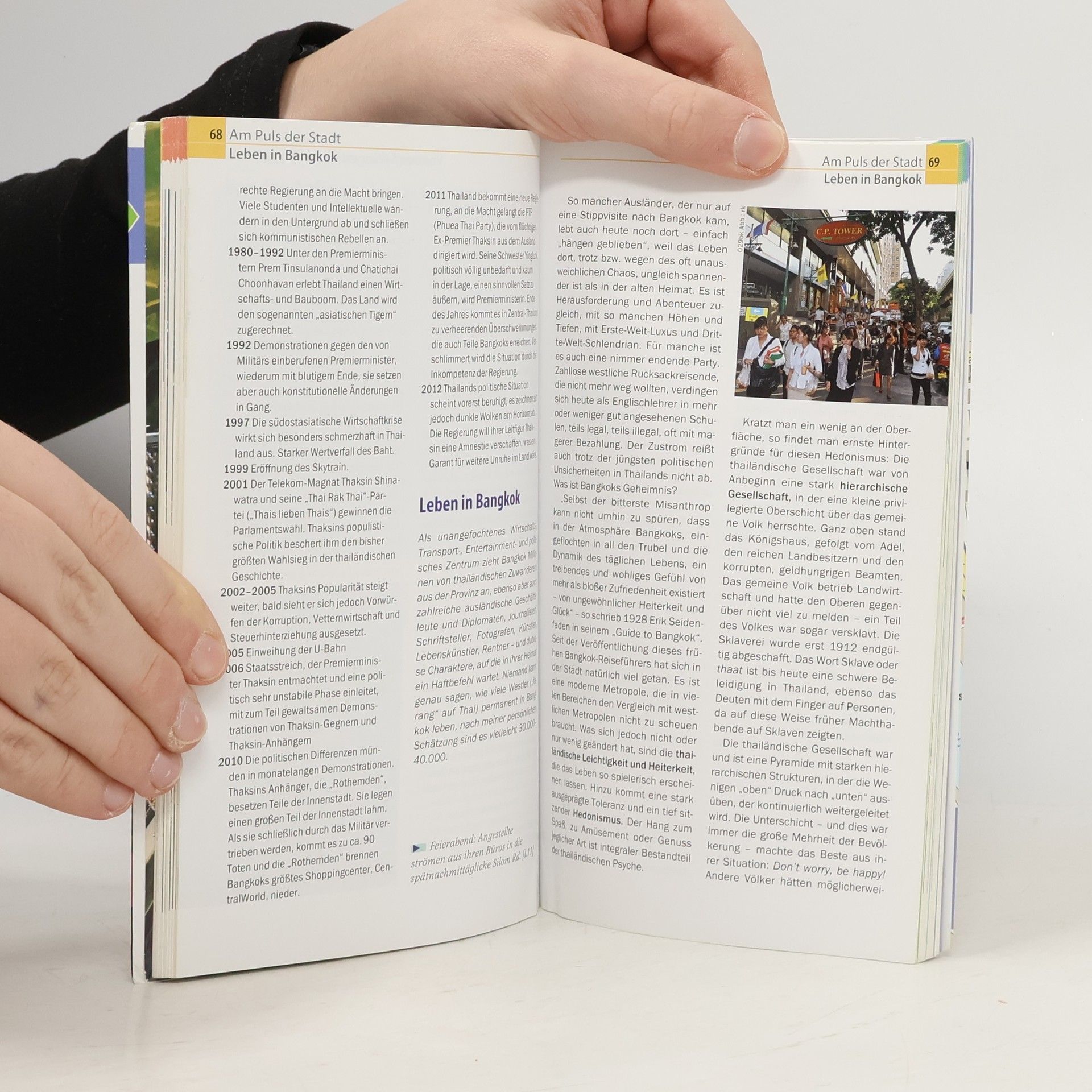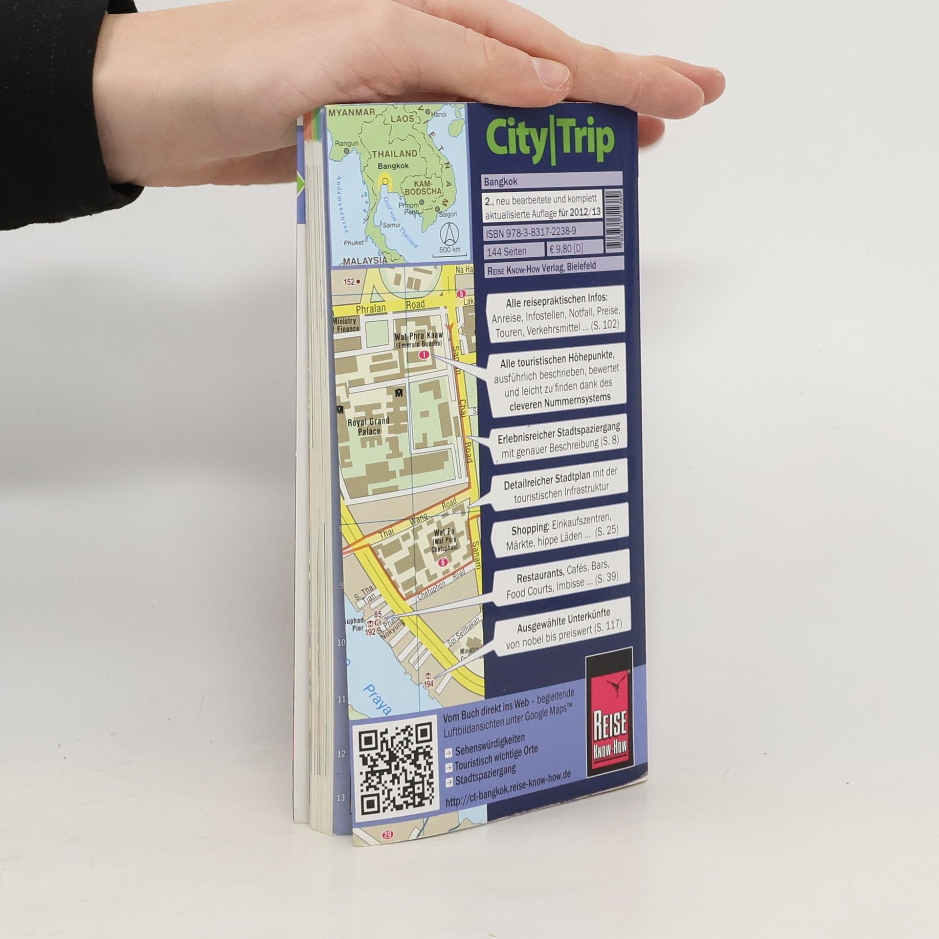 Dieser kompakte Stadtführer von Reise Know-How präsentiert Thailands Hauptstadt mit ihren extremen Gegensätzen: eine Metropole zwischen modernen Shopping-Centern und Weihrauch umhüllten Tempeln, zwischen kunstvoll gestalteten Tempeln und schummrigen Bars. Der Reiseführer begleitet die Leser auf Rundgängen zu den wichtigsten Sehenswürdigkeiten und entdeckt auch weniger bekannte Highlights. Er bietet verblüffende Insider-Infos, Tipps zum Shoppen, Essen und Ausgehen sowie Informationen zu Anreise, Unterkunft und öffentlichen Verkehrsmitteln. Entspannung, die in Bangkok oft unmöglich erscheint, wird ebenfalls thematisiert. Ein detaillierter Stadtplan (Faltplan zum Herausnehmen) erleichtert die Orientierung in der exotischen Millionenstadt. Eine kleine Sprachhilfe im Anhang enthält wichtige Wörter und Redewendungen für Touristen. Der Inhalt umfasst sorgfältige Beschreibungen der interessantesten Sehenswürdigkeiten und Stadtviertel, eine breite Palette der Gastronomie von Feinschmeckerrestaurants bis zu Mitternachtsimbissen, praktische Infos zu Anfahrt, Preisen, Stadtverkehr, Shopping und Events sowie Unterkünfte von nobel bis preiswert. Hintergrundartikel bieten Einblicke in Geschichte, Mentalität und das Leben in der Stadt. Die Ausstattung ist komplett in Farbe mit stimmungsvollen Fotos, einem GPS-genauen Stadtplan und praktischen Übersichtskarten. Neu ist ein QR-Code, der textbegleitende Luftbildansichten und Navigationshilfen z