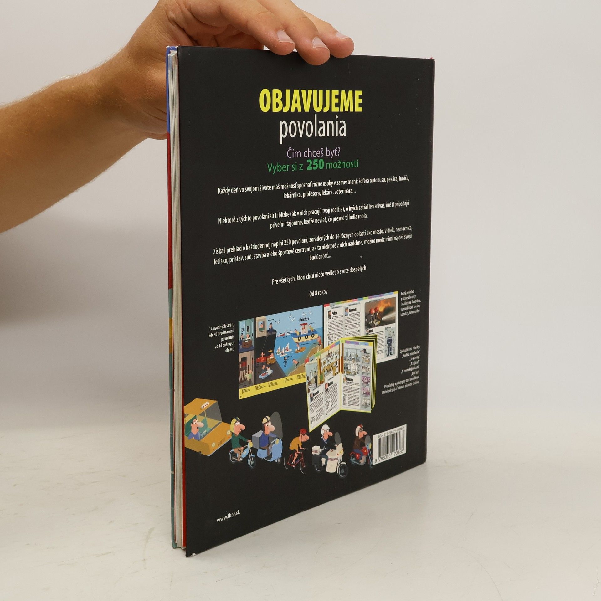 Každý deň v tvojom živote máš možnosť spoznať rôzne osoby v zamestnaní: šoféra autobusu, pekára, hasiča, lekárnika, profesora, lekára, veterinára... Niektoré z týchto povolaní sú ti blízke (ak v nich pracujú tvoji rodičia), o iných zatiaľ len snívaš, iné ti pripadajú priveľmi tajomné, keďže nevieš, čo presne tí ľudia robia. Objavujeme povolania ti ponúka prehľad o každodennom priebehu 250 povolaní zoradených do 14 rôznych oblastí ako mesto, vidiek, nemocnica, letisko, prístav, súd, stavba alebo športové centrum, ak ťa niektoré z nich nadchne, možno medzi nimi nájdeš svoju budúcnosť... Pre všetkých, ktorí chcú niečo vedieť o svete dospelých . Na 14 úvodných strán nájdete povolania zo 14 známych oblastí. Jasný prehľad a rôzne obrázky (realistické ilustrácie, humoristické kresby, komiksy, fotografie)