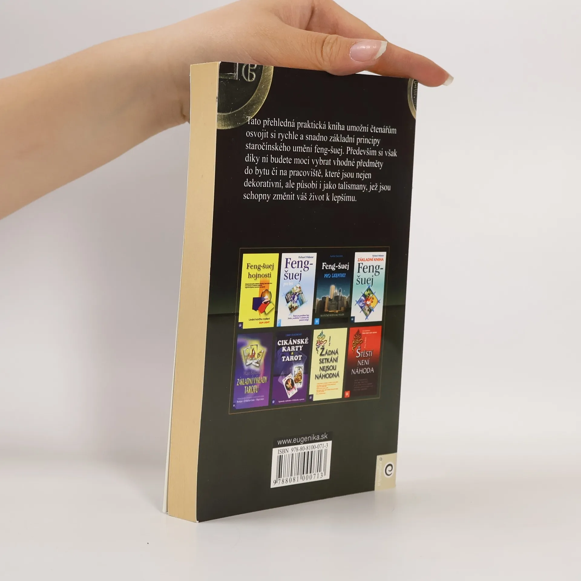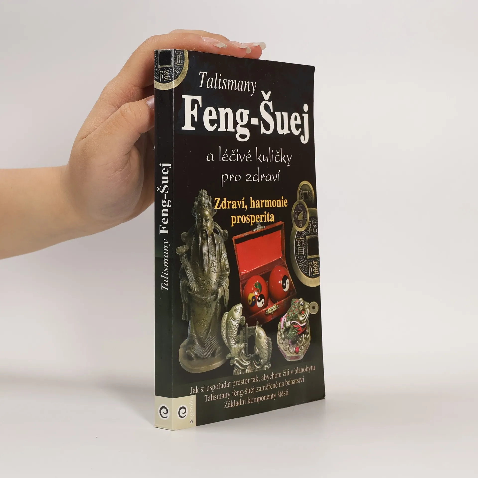 Přehledná praktická kniha umožní čtenářům osvojit si rychle a snadno základní principy staročínského umění feng-šuej. Především si však díky ní budete moci vybrat vhodné předměty do bytu či na pracoviště, které jsou nejen dekorativní, ale působí i jako talismany, jež jsou schopny změnit váš život k lepšímu. Jak si uspořádat prostor tak, abychom žili v blahobytu.Talismany feng-šuej zaměřené na bohatství. Základní komponenty štěstí .