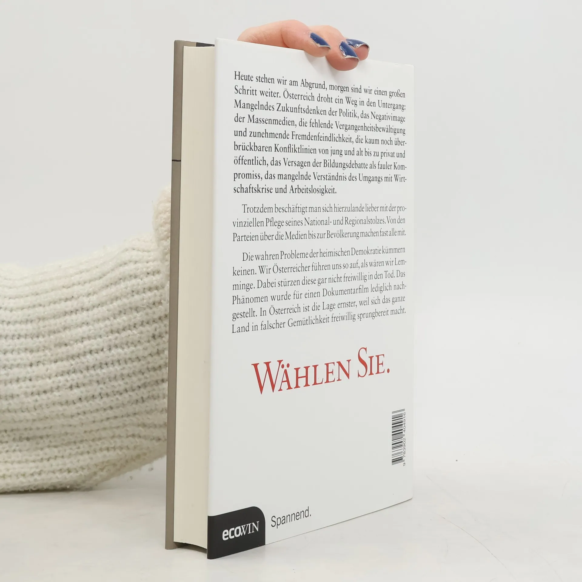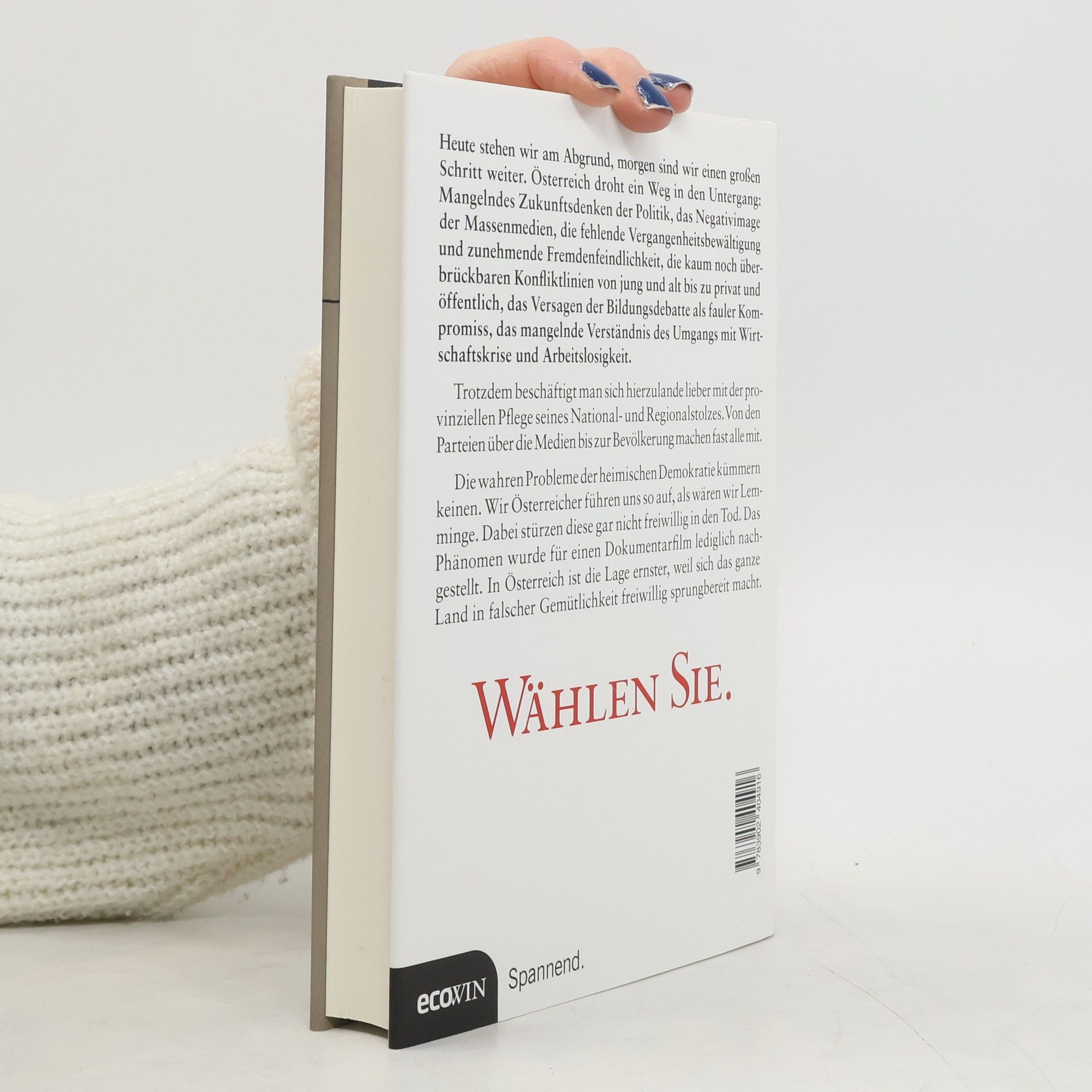 Heute stehen wir am Abgrund, morgen sind wir einen großen Schritt weiter. Österreich droht ein Weg in den Untergang: Mangelndes Zukunftsdenken der Politik, das Negativimage der Massenmedien, die fehlende Vergangenheitsbewältigung und zunehmende Fremdenfeindlichkeit, die kaum noch überbrückbaren Konfliktlinien von jung und alt bis zu privat und öffentlich, das Versagen der Bildungsdebatte als fauler Kompromiss, das mangelnde Verständnis des Umgangs mit Wirtschaftskrise und Arbeitslosigkeit. Trotzdem beschäftigt man sich hierzulande lieber mit der provinziellen Pflege seines National- und Regionalstolzes. Von den Parteien über die Medien bis zur Bevölkerung machen fast alle mit. Die wahren Probleme der heimischen Demokratie kümmern keinen. Wir Österreicher führen uns so auf, als wären wir Lemminge. Dabei stürzen diese gar nicht freiwillig in den Tod. Das Phänomen wurde für einen Dokumentarfilm lediglich nachgestellt. In Österreich ist die Lage ernster, weil sich das ganze Land in falscher Gemütlichkeit freiwillig sprungbereit macht.