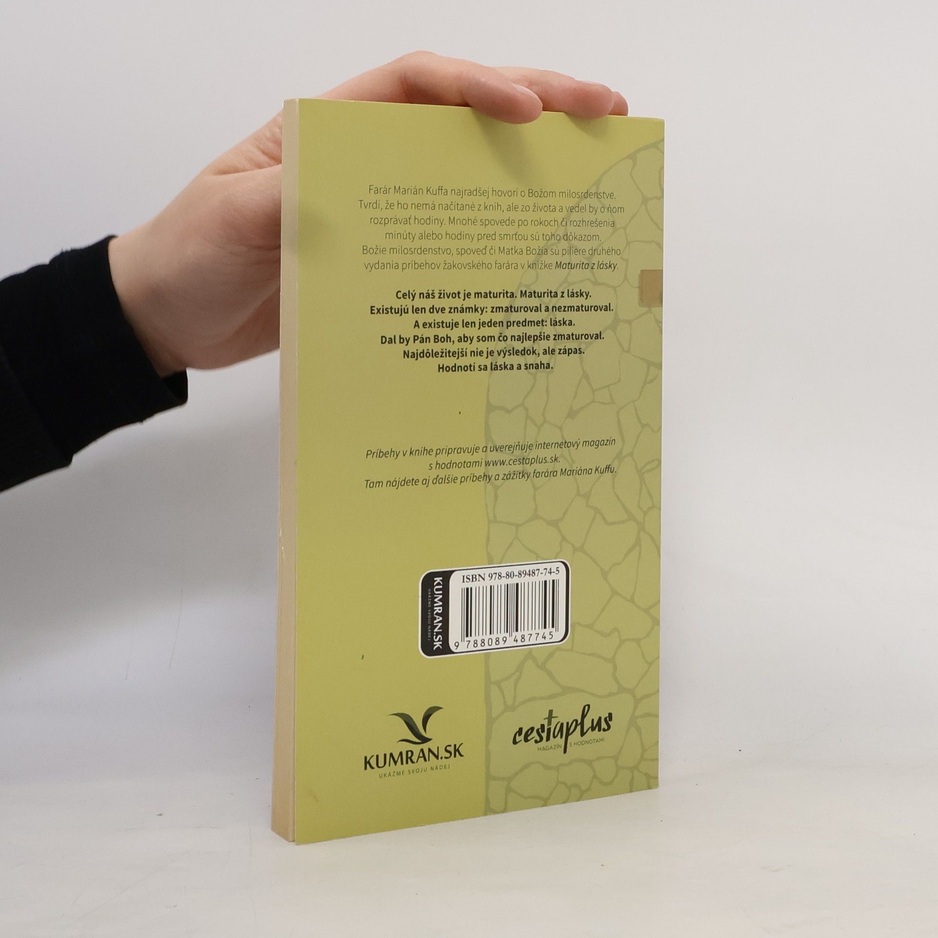 alebo Za nesmrteľnú dušu znesiem všetky kopance Farár Marián Kuffa najradšej hovorí o Božom milosrdenstve. Tvrdí, že ho nemá načítané z kníh, ale zo života a vedel by o ňom rozprávať hodiny. Mnohé spovede po rokoch či rozhrešenia minúty alebo hodiny pred smrťou sú toho dôkazom. Božie milosrdenstvo, spoveď či Matka Božia sú piliere druhého vydania príbehov žakovského farára v knižke Maturita z lásky. Celý náš život je maturita. Maturita z lásky. Existujú len dve známky: zmaturoval a nezmaturoval. A existuje len jeden predmet: láska. Dal by Pán Boh, aby som čo najlepšie zmaturoval. Najdôležitejší nie je výsledok, ale zápas. Hodnotí sa láska a snaha. Túto knihu ilustrovali väzni z leopoldovskej väznice, ľudia bez domova z Nocľahárne sv. Vincenta de Paul, deti z detského domova v Trenčíne-Zlatovciach a nevyliečiteľná pacientka z hospicu v Trenčíne.