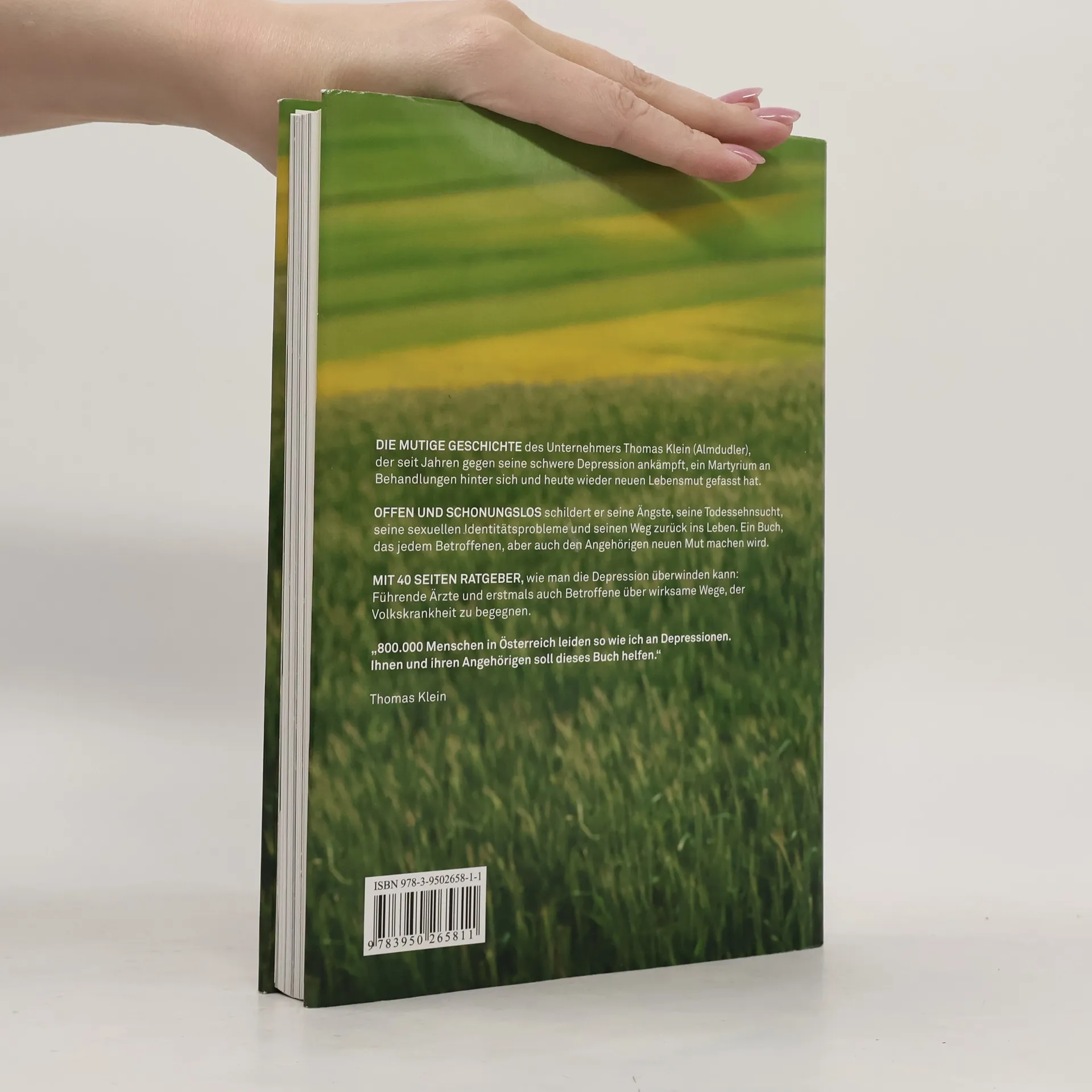Er ist eine der schillerndsten Unternehmerpersönlichkeiten Österreichs und steht in dritter Generation an der Spitze der Traditionsmarke Almdudler. Nach dem Suizid seines Vaters mit 20 Jahren übernimmt Thomas Klein als geschäftsführender Gesellschafter die Marke, modernisiert sie und trifft harte Entscheidungen, um sie aus den roten Zahlen zu führen. Trotz seines Erfolgs und der Bewunderung vieler Frauen ist er unglücklich. Seine Zerrissenheit führt zu schweren Depressionen, die sein Leben dominieren. Der Erfinder des berühmten Werbespruchs „Wenn die kann Almdudler hab’n, geh’ i wieder ham“ kämpft mit inneren Dämonen, verlässt tagelang nicht sein Bett und denkt an Selbstmord. Zum 100-jährigen Jubiläum der Firma A. & S. Klein erzählt Thomas Klein erstmals seine Lebensgeschichte. Es ist eine mutige Erzählung zwischen Schein und Sein, Hoffnung und Verzweiflung, Euphorie und Depression. Offen beschreibt er, wie der Suizid seines Vaters ihn zu zerbrechen drohte, seine sexuelle Identitätsfindung eine schmerzhafte Auseinandersetzung war und wie er aus einer in der Krise steckenden Traditionsmarke ein erfolgreiches Unternehmen machte. Ein Buch, das Menschen in ähnlicher Situation Mut macht und Wege aufzeigt, wie man Depressionen besiegen kann, ergänzt durch 40 Seiten Ratgeber von führenden Ärzten und Experten sowie Betroffenen über wirksame Strategien gegen diese Volkskrankheit, an der in Österreich rund 800.000 Menschen leiden.
