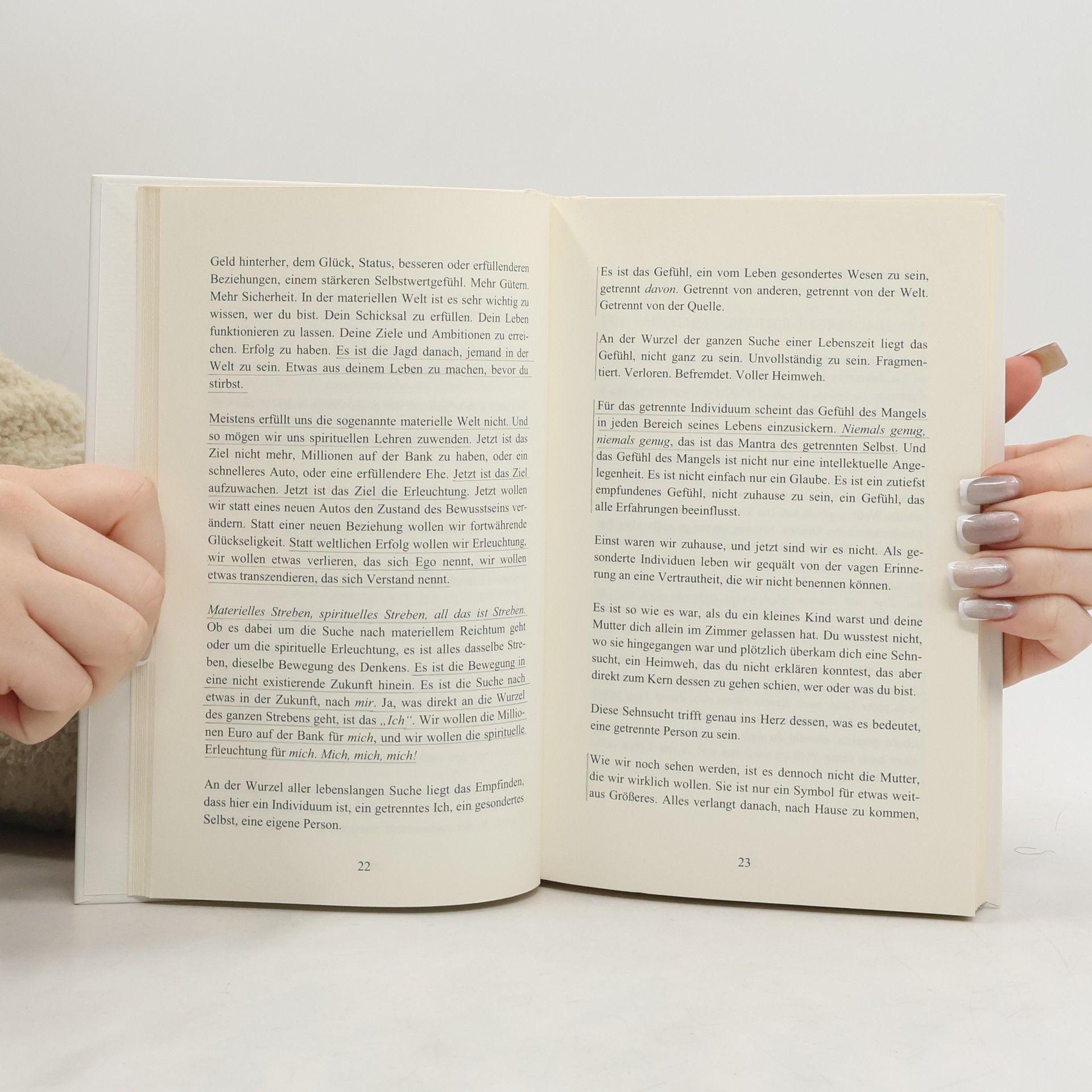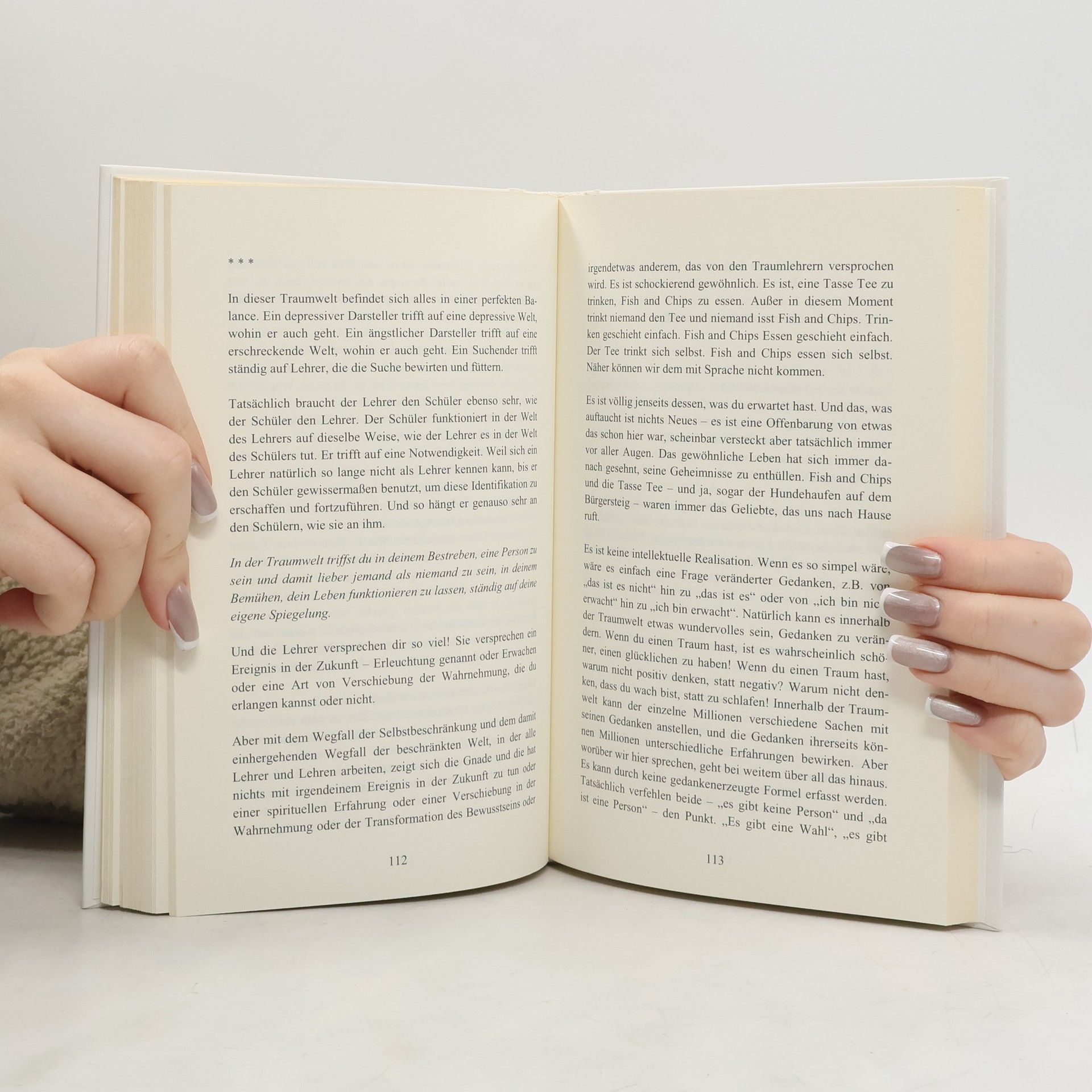„Und wenn die Abwesenheit und die Präsenz einander treffen und implodieren, wenn Leerheit und Form zueinander werden und sich verlieren, wenn das, was sieht, in das Gesehene hinein zusammenbricht, wenn Subjekt und Objekt verrückt werden, verrückte Liebende und ins Nichts entschwinden, was bleibt dann?“ . „Den Stuhl interessiert nicht, wer du zu sein glaubst. Er kümmert sich nicht darum, was du getan oder gelassen hast. Es interessiert ihn nicht, ob du deine Ziele erreicht hast oder nicht. Es ist ihm egal, ob du glaubst erleuchtet zu sein oder nicht. Es kümmert ihn nicht, ob du krank oder gesund bist, ob du Buddhist, Jude oder Christ bist, ob du alt oder jung bist, ob du verstehst oder nicht verstehst. Er bietet sich einfach nur an, vorbehaltlos. Und nicht nur der Stuhl – alle Dinge bieten sich vorbehalt-los an. Das Geheimnis ist das: Leben ist tatsächlich überhaupt kein Leben. Es ist ein Angebot. Und gerade jetzt bietet es das an. Es bietet den gegenwärtigen Augenblick an.“