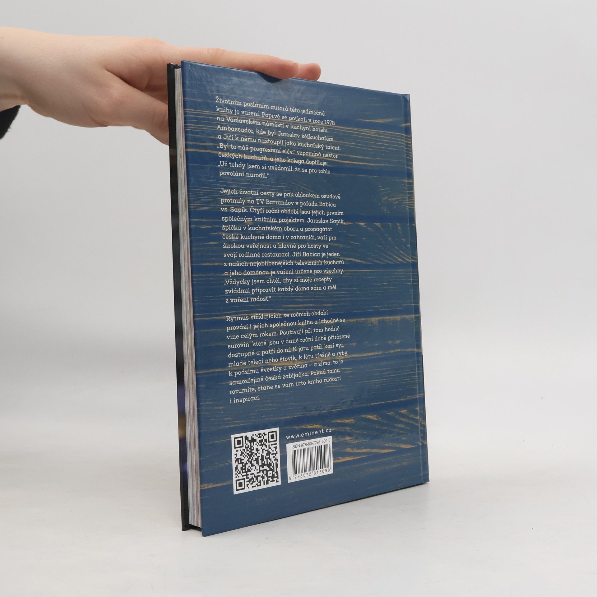 Životním posláním autorů této jedinečné knihy je vaření. Poprvé se potkali v roce 1978, na Václavském náměstí v kuchyni hotelu Ambassador, kde byl Jaroslav šéfkuchařem a Jiří k němu nastoupil jako kuchařský talent. „Byl to náš progresivní elév,“ vzpomíná nestor českých kuchařů a jeho kolega doplňuje: „Už tehdy jsem si uvědomil, že se pro tohle povolání narodil.“ Jejich životní cesty se pak obloukem osudově protnuly na Barrandově. Čtyři roční období jsou jejich prvním společným knižním projektem. Jaroslav Sapík, špička v kuchařském oboru a propagátor české kuchyně doma i v zahraničí, vaří pro širokou veřejnost a hlavně pro hosty ve svojí rodinné restauraci. Jiří Babica je jeden z našich nejoblíbenějších televizních kuchařů a jeho doménou je vaření určené pro všechny. „Vždycky jsem chtěl, aby si moje recepty zvládnul připravit každý doma sám a měl z vaření radost.“ Rytmus střídajících se ročních období provází i jejich společnou knihu a lahodně se vine celým rokem. Používají při tom hodně surovin, které jsou v dané roční době přirozeně dostupné a patří do ní. K jaru patří kozí sýr, mladé telecí nebo šťovík, k létu třešně a ryby, k podzimu švestky a zvěřina – a zima, to je samozřejmě česká zabijačka. Pokud tomu rozumíte, stane se vám tato kniha radostí i inspirací.