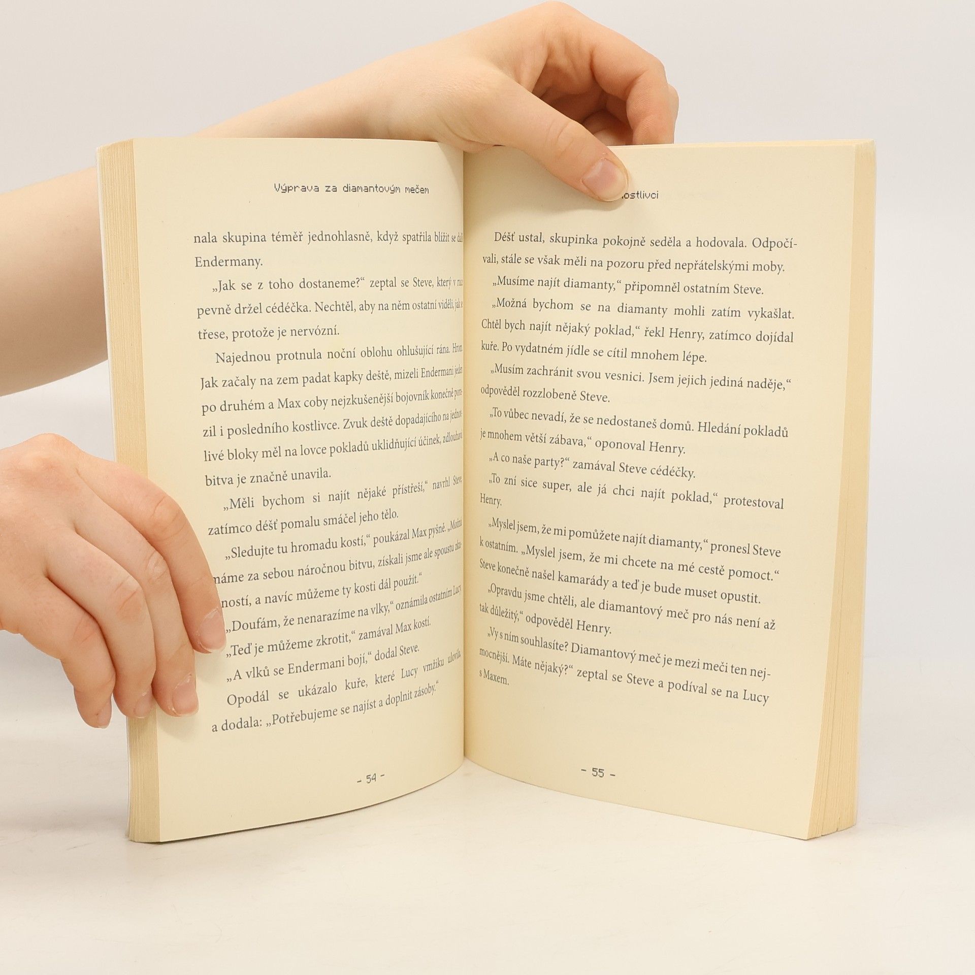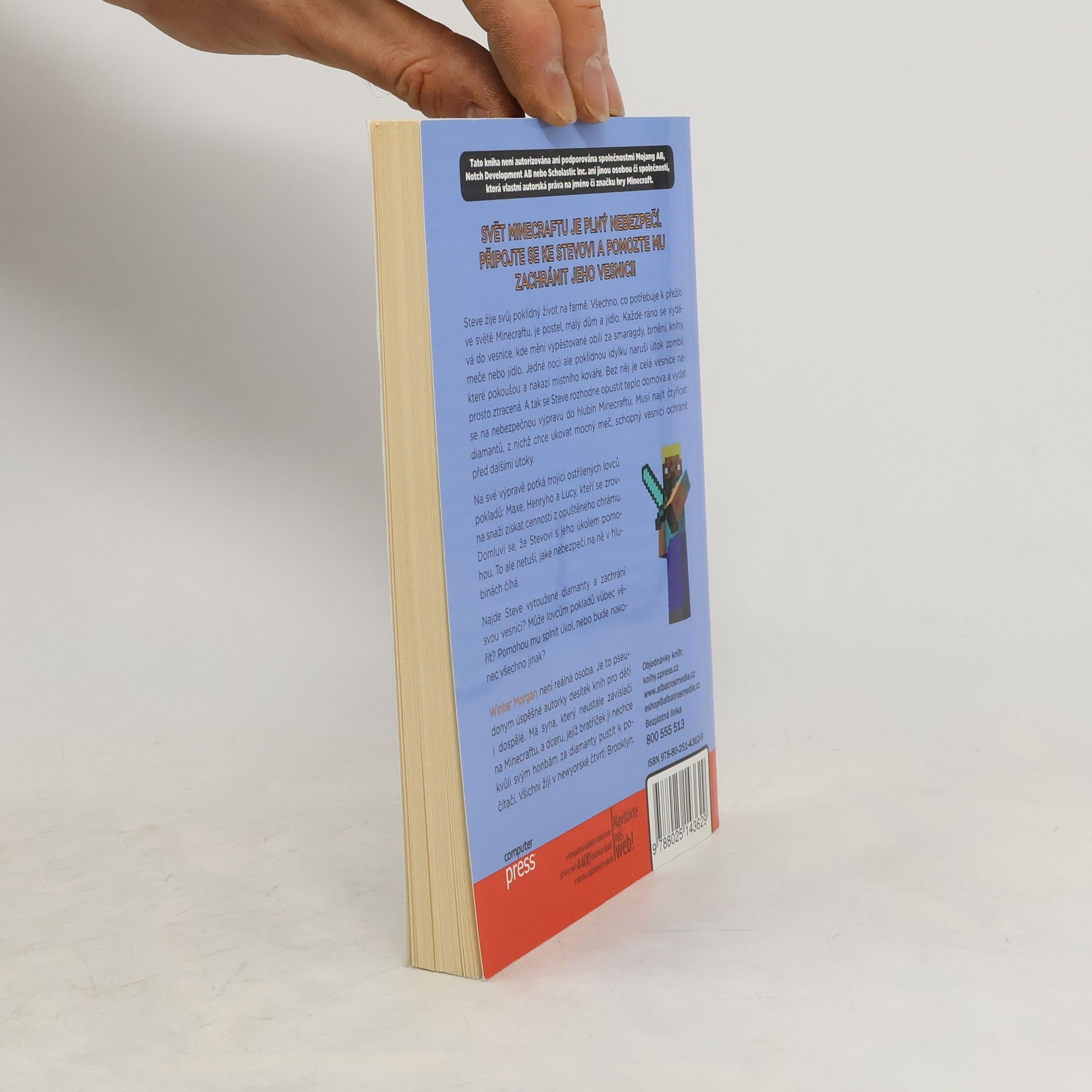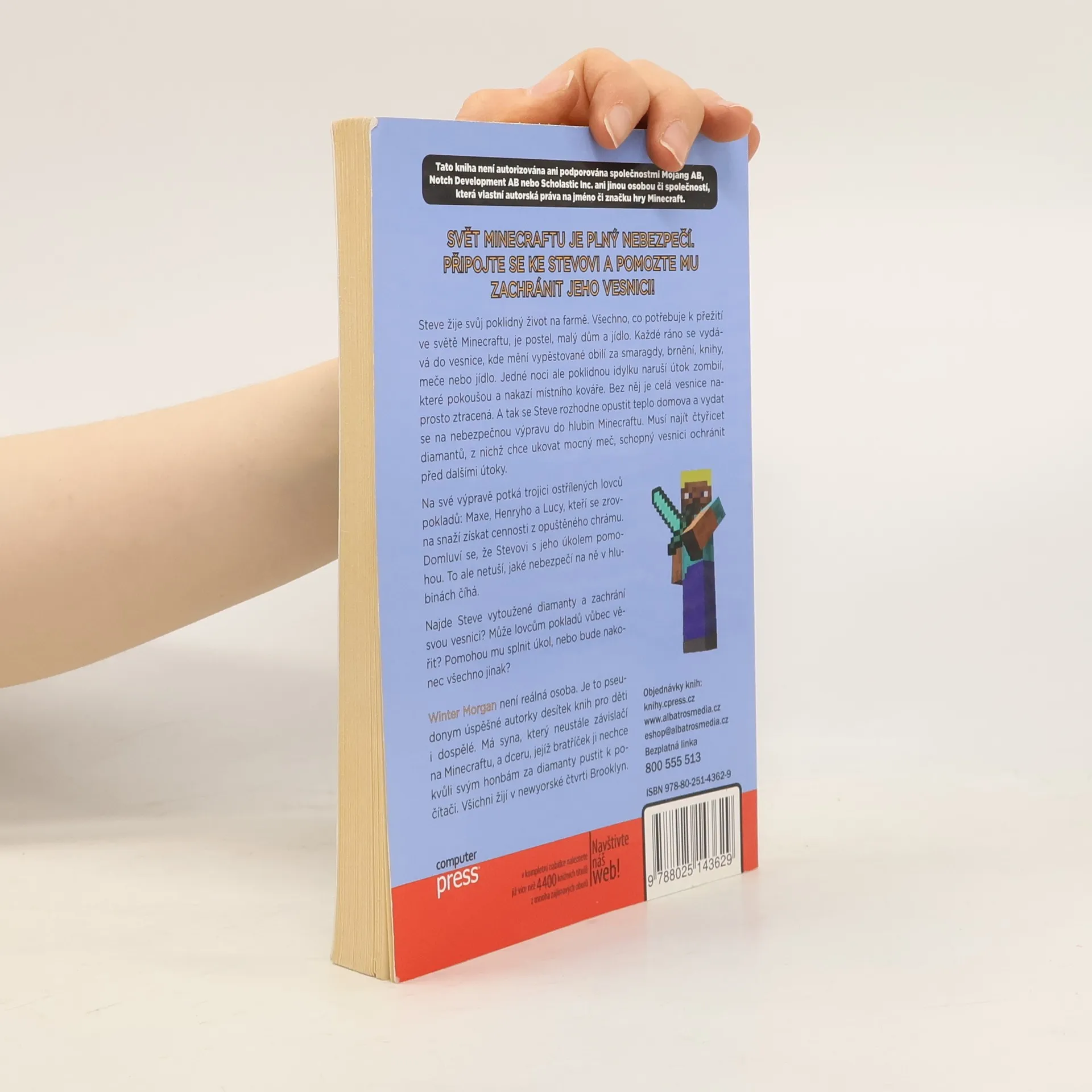 Steve žije klidný život na farmě, kde má vše potřebné k přežití: postel, malý dům a jídlo. Každé ráno navštěvuje vesnici, aby vyměnil obilí za smaragdy, brnění, knihy, meče nebo jídlo. Jedné noci však jeho idylku naruší útok zombií, které pokoušou místního kováře. Bez něj je vesnice v ohrožení, a tak se Steve rozhodne opustit domov a vyrazit na nebezpečnou výpravu do hlubin Minecraftu. Jeho cílem je najít čtyřicet diamantů, aby ukoval mocný meč, který vesnici ochrání před dalšími útoky. Na své cestě potká trojici lovců pokladů: Maxe, Henryho a Lucy, kteří se snaží získat cennosti z opuštěného chrámu. Dohodnou se, že Stevovi pomohou, aniž by tušili, jaké nebezpečí na ně čeká. Dokáže Steve najít diamanty a zachránit vesnici? Může lovcům pokladů věřit? Pomohou mu splnit úkol, nebo se vše obrátí jinak? Winter Morgan není reálná osoba, ale pseudonym úspěšné autorky knih pro děti i dospělé, která žije v Brooklynu se svým synem a dcerou.