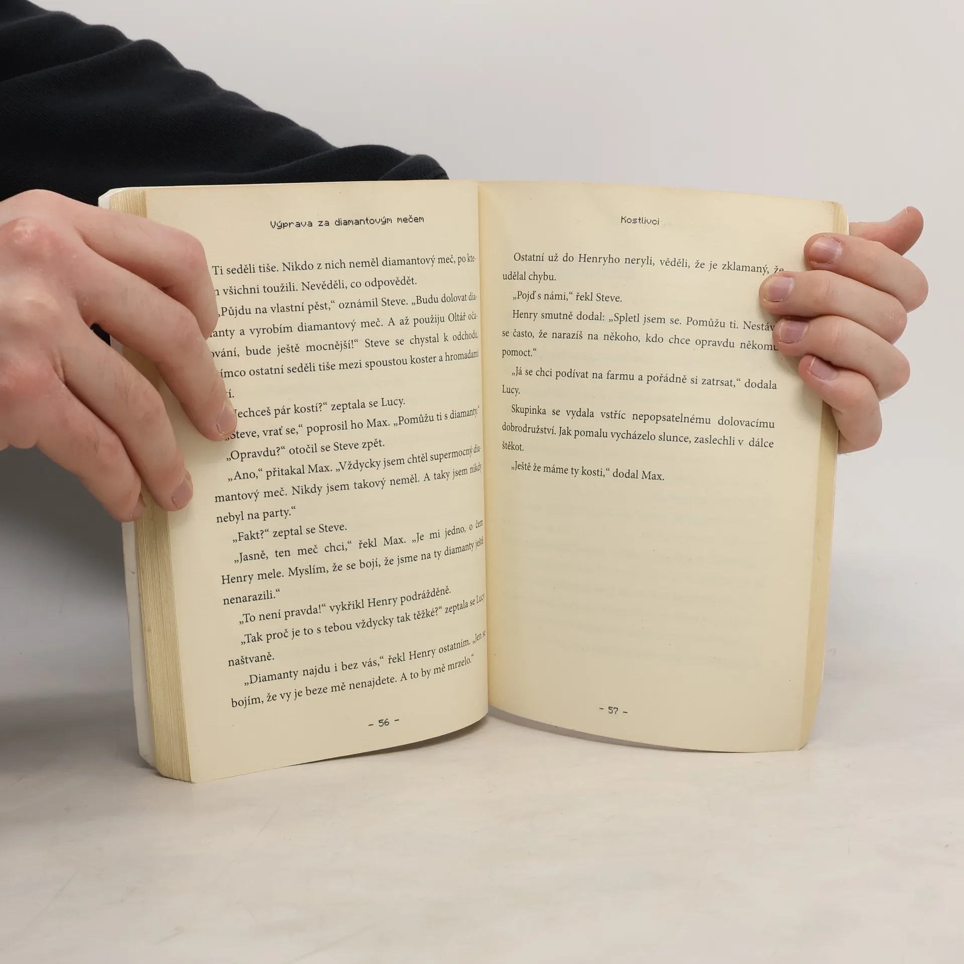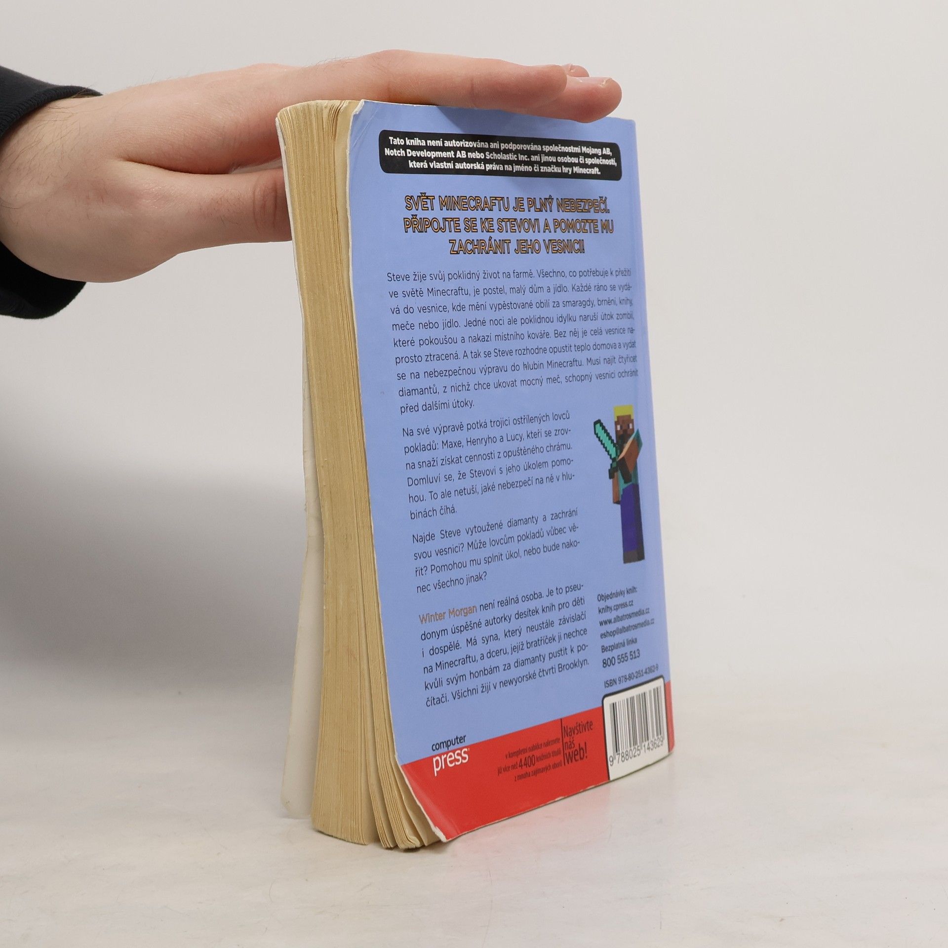 Steve žije klidný život na farmě, kde má vše potřebné k přežití: postel, malý dům a jídlo. Každé ráno navštěvuje vesnici, aby vyměnil obilí za smaragdy, brnění, knihy, meče nebo jídlo. Jedné noci však jeho idylku naruší útok zombií, které pokoušou místního kováře. Bez něj je vesnice v ohrožení, a tak se Steve rozhodne opustit domov a vyrazit na nebezpečnou výpravu do hlubin Minecraftu. Jeho cílem je najít čtyřicet diamantů, aby ukoval mocný meč, který vesnici ochrání před dalšími útoky. Na své cestě potká trojici lovců pokladů: Maxe, Henryho a Lucy, kteří se snaží získat cennosti z opuštěného chrámu. Dohodnou se, že Stevovi pomohou, aniž by tušili, jaké nebezpečí na ně čeká. Dokáže Steve najít diamanty a zachránit vesnici? Může lovcům pokladů věřit? Pomohou mu splnit úkol, nebo se vše obrátí jinak? Winter Morgan není reálná osoba, ale pseudonym úspěšné autorky knih pro děti i dospělé, která žije v Brooklynu se svým synem a dcerou.