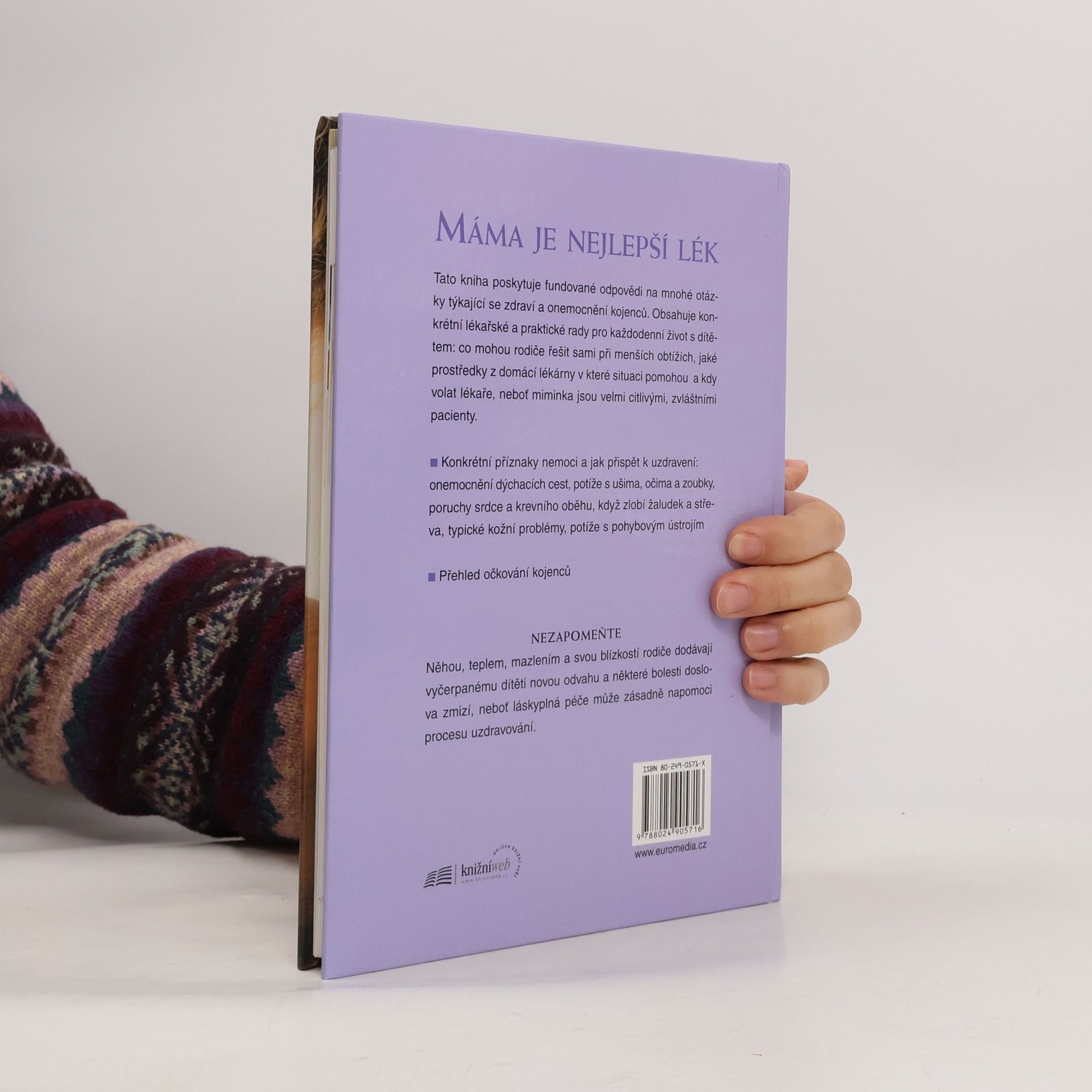 Tato kniha poskytuje fundované odpovědi na mnohé otázky týkající se zdraví a onemocnění kojenců. Obsahuje konkrétní lékařské a praktické rady pro každodenní život s dítětem: co mohou rodiče řešit sami při menších obtížích, které prostředky z domácí lékárny v které situaci pomohou a jsou-li vůbec vhodné, a kdy volat lékaře, neboť miminka jsou velmi citlivými, zvláštními pacienty. - Konkrétní příznaky nemoci a jak napomoci k uzdravení: nemocnění dýchacích cest, potíže s ušima, očima a zuby, poruchy srdce a krevního oběhu, když zlobí žaludek a střeva, typické kožní problémy, potíže s pohybovým ústrojím - Přehled očkování kojenců NEZAPOMEŇTE Něhou, teplem, mazlením a svou blízkostí rodiče dodávají vyčerpanému dítěti novou odvahu a některé bolesti doslova odfouknou, neboť láskyplná péče může zásadně napomoci procesu uzdravování.... celý text