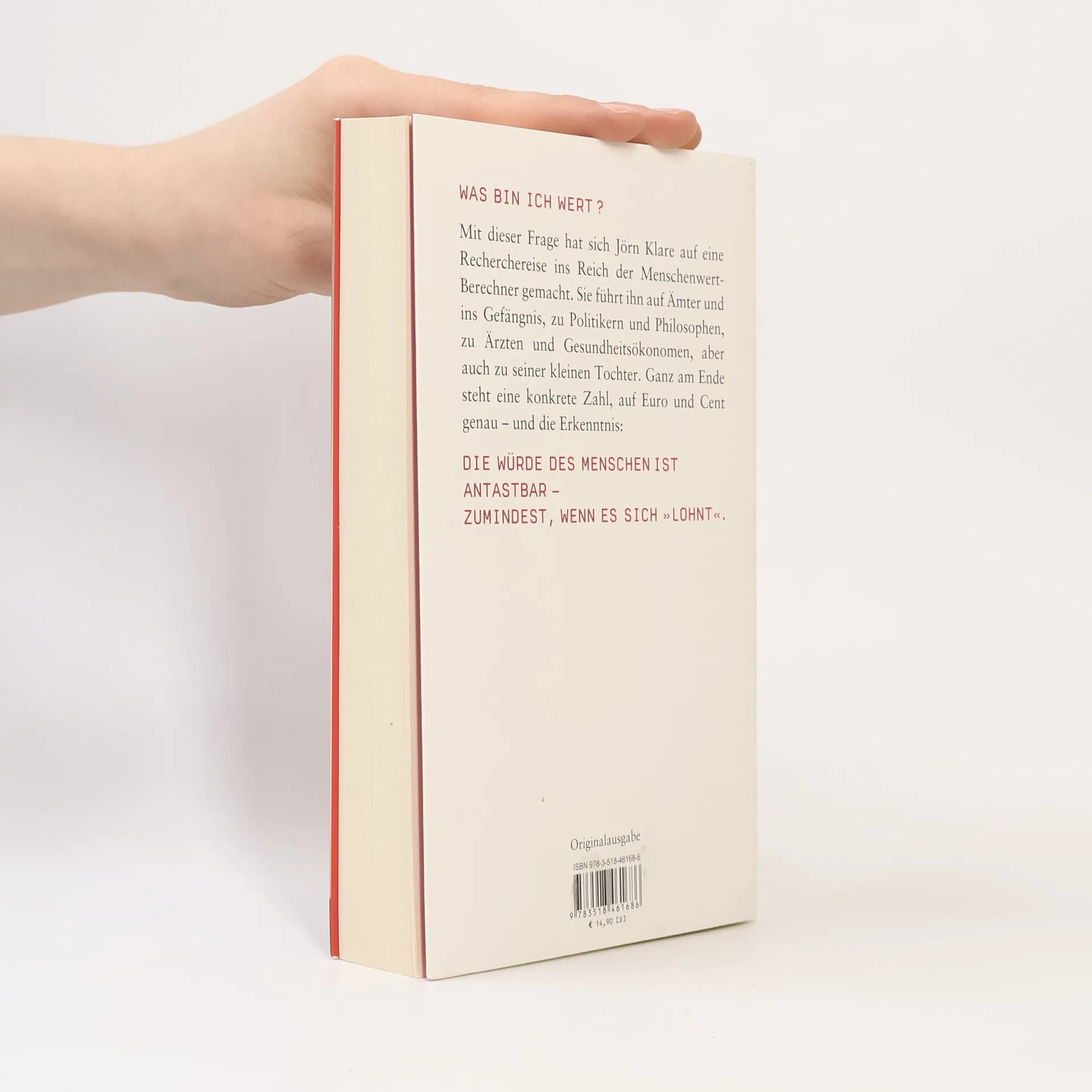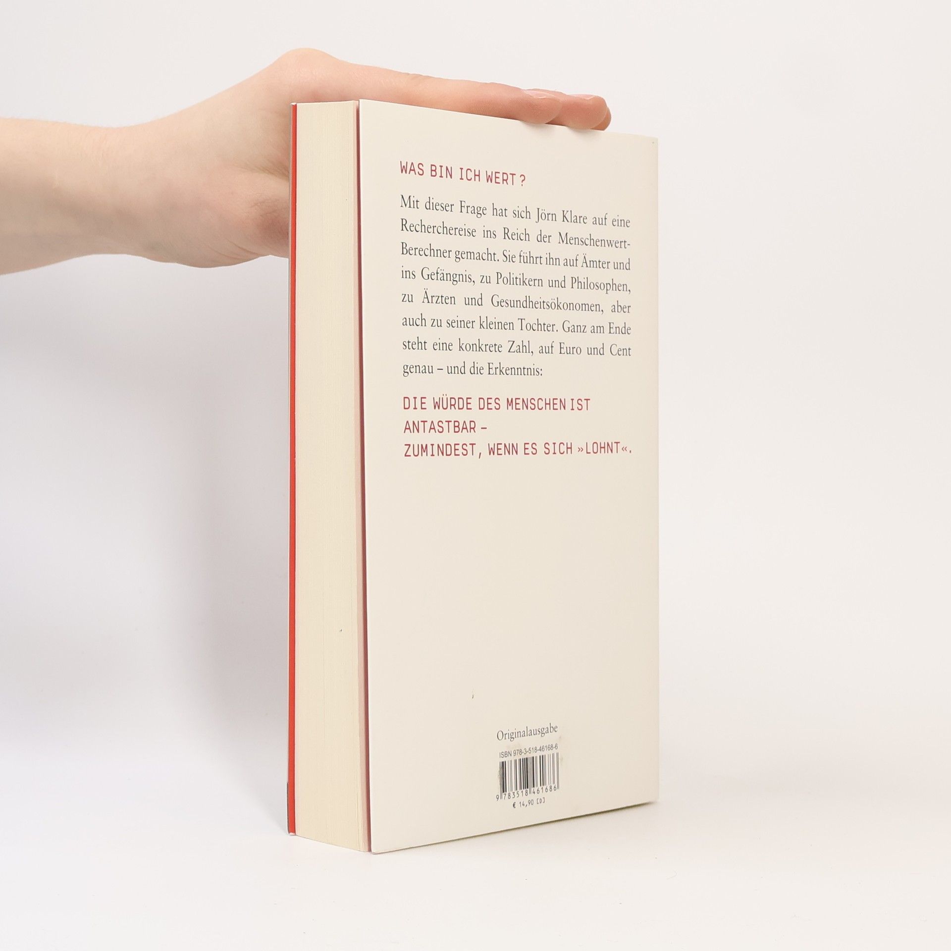 Eine Niere in Indien kostet 300 Euro, ein afrikanisches Adoptivkind 20.000 Euro, und eine Frau in Albanien ist unter Umständen schon für 800 Euro zu haben. Hieß es nicht immer, der Mensch sei keine Ware? Tatsächlich wird das Leben nicht nur in fernen Ländern ökonomisch bewertet, sondern auch in Deutschland: In Krankenhäusern und Behörden wird gefragt, ob sich eine Ampel lohnt, wenn man den Wert eines Lebens mit 1,2 Millionen Euro ansetzt. Ist es legitim, die Würde des Menschen ökonomisch zu relativieren? Jörn Klare begibt sich auf eine persönliche Recherchereise, um den Wert des Menschen zu ergründen. Diese führt ihn zu Ämtern, ins Gefängnis, zu Politikern, Philosophen, Ärzten und Gesundheitsökonomen, aber auch zu seiner kleinen Tochter. Am Ende steht eine konkrete Zahl, die Erkenntnis, dass die Würde des Menschen antastbar ist – zumindest wenn es sich „lohnt“. Der Journalist Klare sucht nach dem Wert des Menschen in einer zunehmend ökonomisierten Welt und spricht Klartext. Er kombiniert Ironie und Ernst und beleuchtet teils erstaunliche, teils unerträgliche Positionen. Wie viel würde ein Händler auf dem grauen Markt für eine Niere zahlen? Welche Summe für die Teilnahme an einem risikoreichen Medikamentenversuch? Klare präsentiert diese Fragen und Zahlen eindringlich und aufschlussreich.