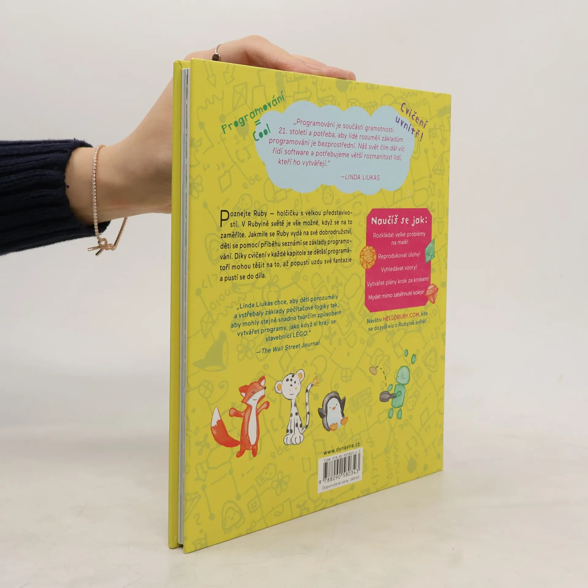 Poznejte Ruby — holčičku s velkou představivostí. V Rubyině světě je vše možné, když se na to zaměříte. Jakmile se Ruby vydá na své dobrodružství, děti se pomocí příběhu seznámí se základy programování. Díky cvičení v každé kapitole se dětští programátoři mohou těšit na to, až popustí uzdu své fantazie a pustí se do díla. Děti díky knize HELLO RUBY porozumí a vstřebají základy počítačové logiky tak, že budou moci stejně snadno tvůrčím způsobem vytvářet programy, jako když si hrají se stavebnicí nebo s LEGO kostičkami. „Programování je součástí gramotnosti 21. století a potřeba, aby lidé rozuměli základům programování je bezprostřední. Náš svět čím dál víc řídí software a potřebujeme větší rozmanitost lidí, kteří ho vytvářejí.” Linda Liukas S HELLO RUBY se děti naučí jak: - rozkládat velké problémy na malé - reprodukovat úlohy - vyhledávat vzory! - vytvářet plány krok za krokem - myslet mimo zaběhnuté koleje