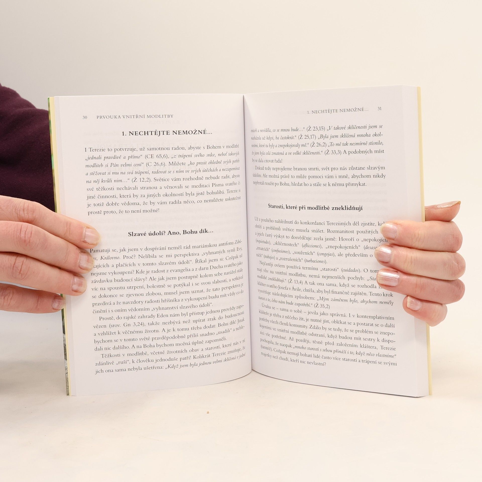 Ti, kdo se věnují vnitřní modlitbě, dobře vědí, že často přicházejí chvíle, kdy není možné meditovat úryvky z Písma svatého. Jsme unavení, plni starostí a obav, ale i radostí z toho, co se nám přihodilo nebo co nás čeká v nejbližších dnech. Co v takovém případě dělat? Tato Prvouka, která navazuje na autorovy knihy Slabikář a Čítanka vnitřní modlitby, objasňuje, jak je možné a vhodné v takových chvílích probírat svůj vlastní život s Bohem s pomocí příkladu a rad svaté Terezie z Ávily. Nejedná se tu o neplodné a sobecké zabývání se sebou, nýbrž o to, jak pod Božím pohledem porozumět vlastní minulosti, přítomnosti i výhledům do budoucnosti, jak odevzdat Pánu svůj život a jak rozpoznat, co vede ke sjednocení s Bohem. Autor nás učí nejen vnímat svá vnitřní hnutí, ale i věnovat se událostem vlastního života, jak je ve vnitřní modlitbě interpretovat a co na jejich základě dělat. Povzbuzuje k tomu, abychom si našli duchovního průvodce, a objasňuje nám známky a pravidla duchovního rozlišování.