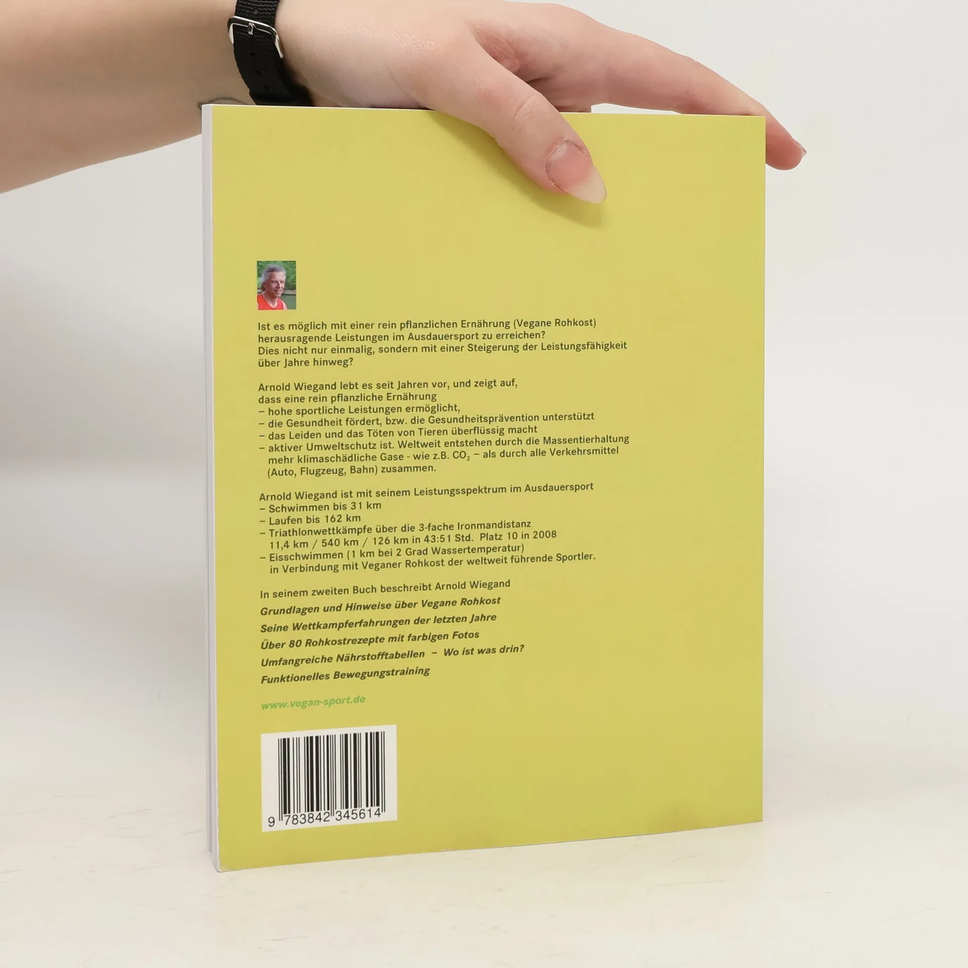 Ist es möglich mit einer rein pflanzlichen Ernährung (Vegane Rohkost) herausragende Leistungen im Ausdauersport zu erreichen? Dies nicht nur einmalig, sondern mit einer Steigerung der Leistungsfähigkeit über Jahre hinweg? Arnold Wiegand lebt es seit Jahren vor, und zeigt auf, dass eine rein pflanzliche Ernährung hohe sportliche Leistungen ermöglicht, die Gesundheit fördert, das Leiden und das Töten von Tieren überflüssig macht und aktiver Umweltschutz ist. Weltweit entstehen durch die Massentierhaltung mehr klimaschädliche Gase - wie z.B. CO2 - als durch alle Verkehrsmittel (Auto, Flugzeug, Bahn) zusammen.Arnold Wiegand ist mit seinem Leistungsspektrum im Schwimmen bis 31 km, Laufen bis 162 km, Triathlonwettkämpfe über die 3-fache Ironmandistanz und Eisschwimmen (1 km bei 2 Grad Wassertemperatur) in Verbindung mit Veganer Rohkost der weltweit führende Sportler.In seinem Buch beschreibt er Grundlagen und Hinweise über Vegane Rohkost, seine Wettkampferfahrungen der letzten Jahre, über 80 Rohkostrezepte mit farbigen Fotos, umfangreiche Nährstofftabellen und funktionelles Bewegungstraining. www.vegan-sport.de