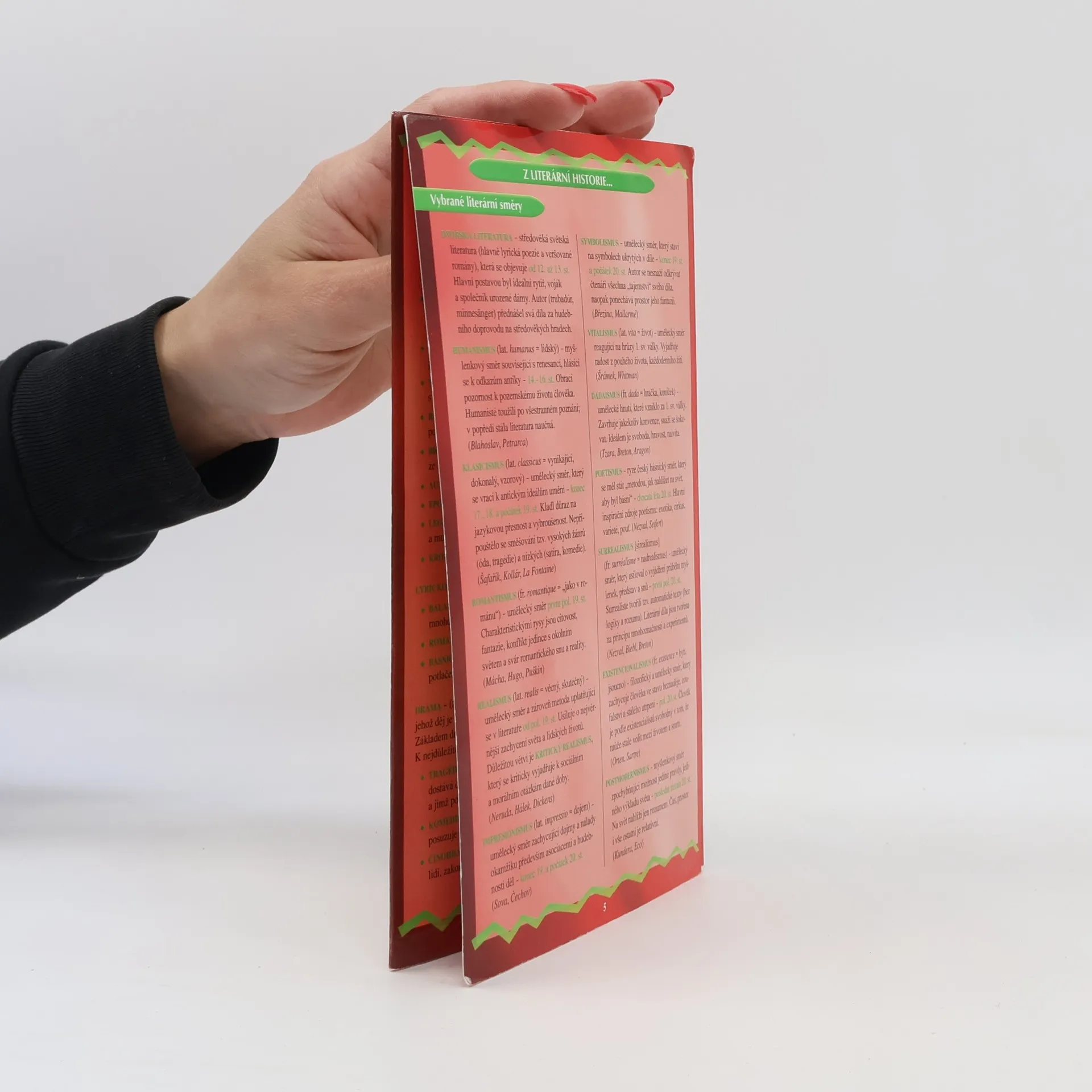 8 stran přehledně zpracovaných témat z literární teorie a světové historie. Jedinečná učební pomůcka ve formátu harmoniky nahrazuje zdlouhavé vyhledávání ve starých sešitech. Kvalitní povrchová úprava zabraňuje poškození častým užíváním. Určeno především žákům 2. stupně ZŠ, ale i studentům prvních ročníků SŠ.