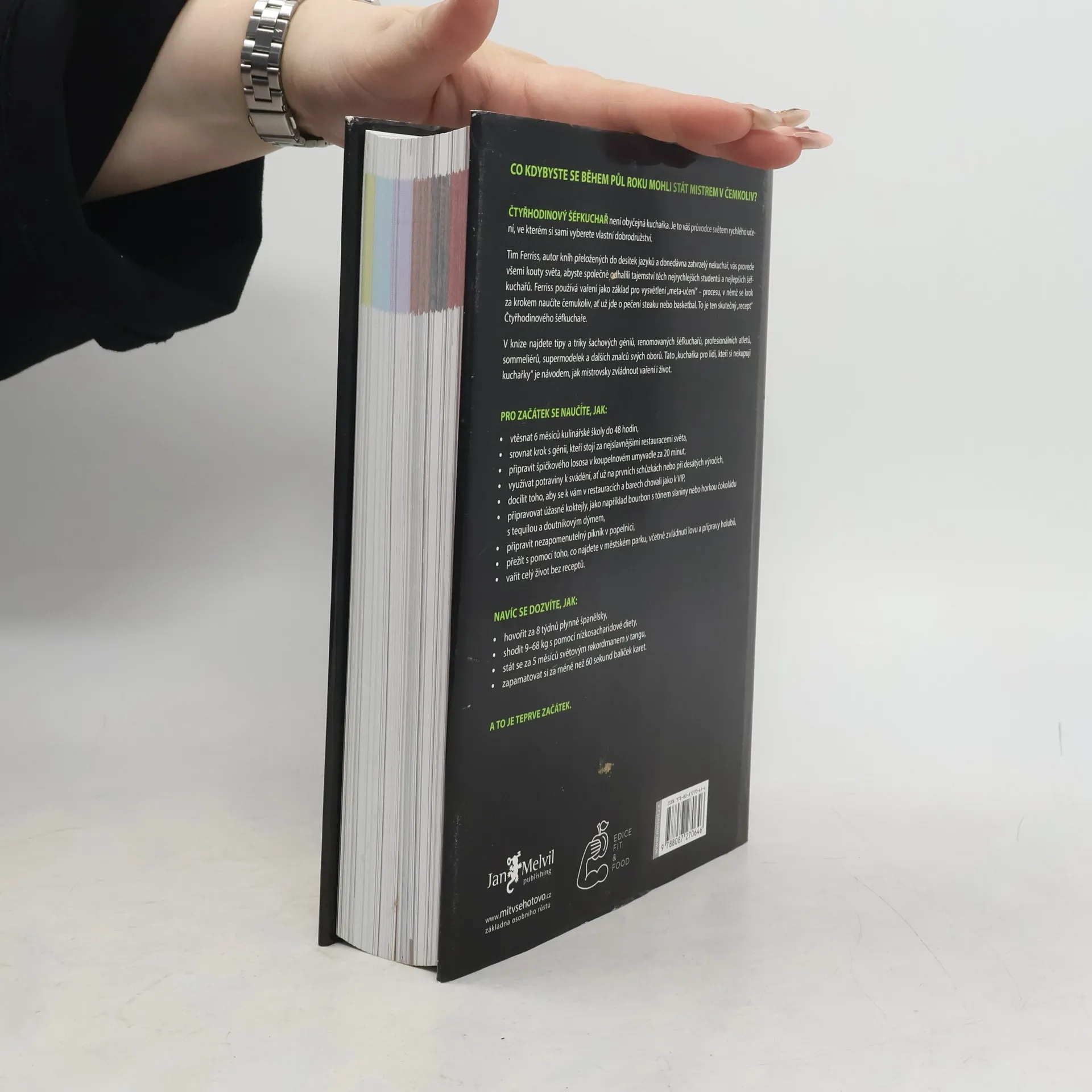 Timothy Ferriss přichází se svou dlouho připravovanou a napjatě očekávanou kuchařkou pro ty, kteří si kuchařky nikdy nekupují. Jeho přímočará cesta k cíli, známá již z předchozích bestsellerů Čtyřhodinový pracovní týden a Čtyřhodinové tělo vede v této vynalézavé knize přes všechny apekty života. Protože jak říká Tim, pokud se chcete naučit vařit, musíte se nejprve naučit učit se. Jakmile umíte tohle, můžete se naučit vařit, mluvit cizí řečí, hrát baketball, přežít v divočině… prostě stát se světovou třídou, v čem budete chtít. S Timem v roli šéfkuchaře projdete školou vaření, v níž se s každým receptem naučíte určitou dovednost, kterou následně využijete v dalším receptu. Množství tipů a triků z vás udělá vládce kuchyně, ale Ferriss, jak už má ve zvyku, se neomezuje jen na vaření doma. V části o divočině si uloví večeři, ve vědecké části pochopí molekulární kuchyni…