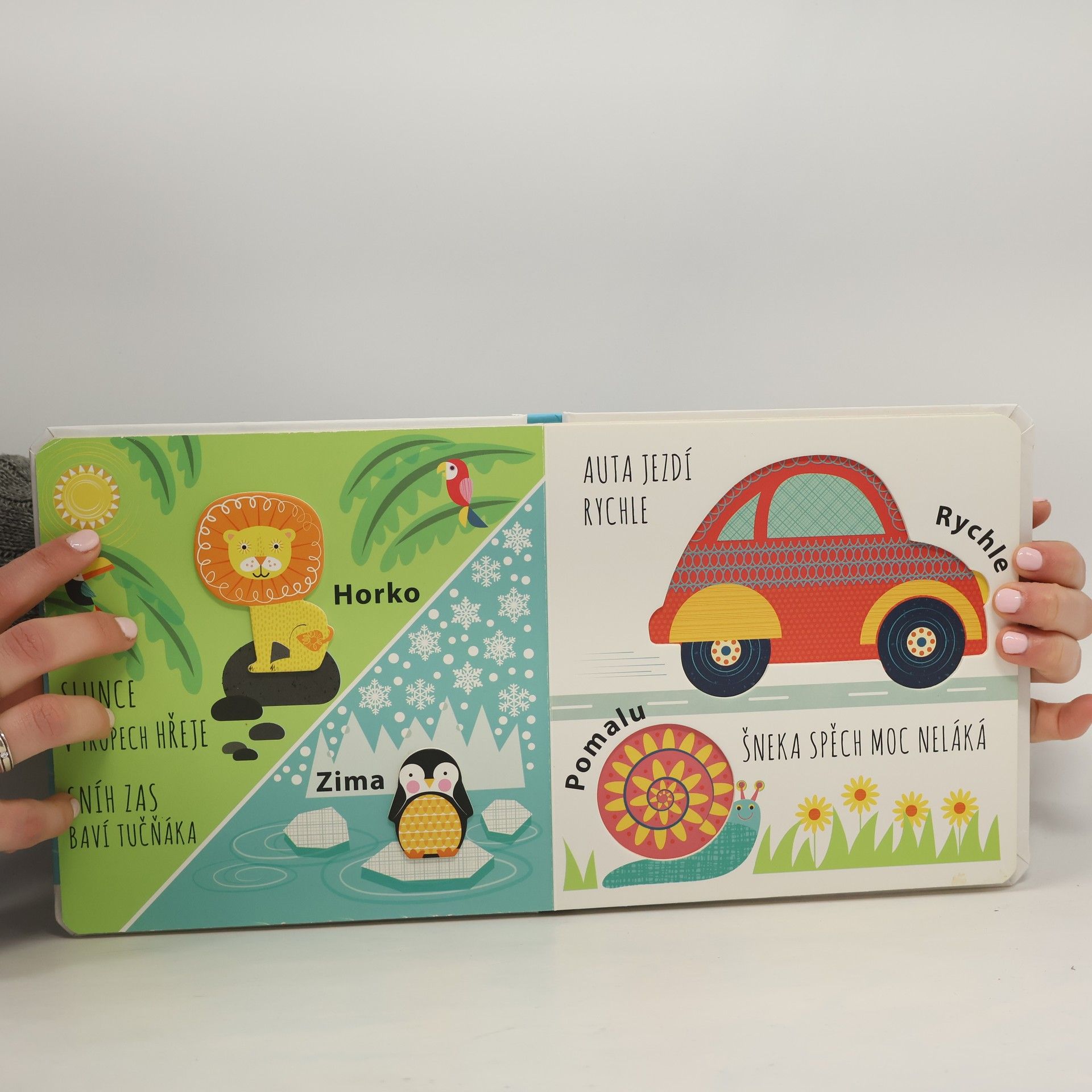 Velký, nebo malý? Uvnitř, nebo venku? Naučit se rozeznávat protiklady a přitom si sáhnout do knihy? Nyní je to možné díky tomuto reliéfnímu leporelu!