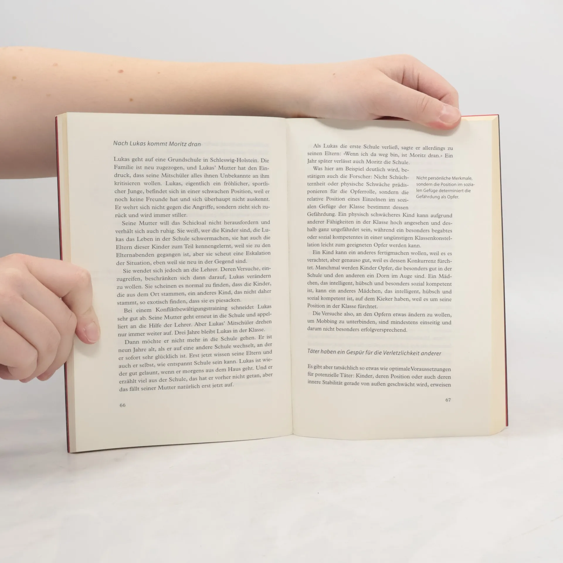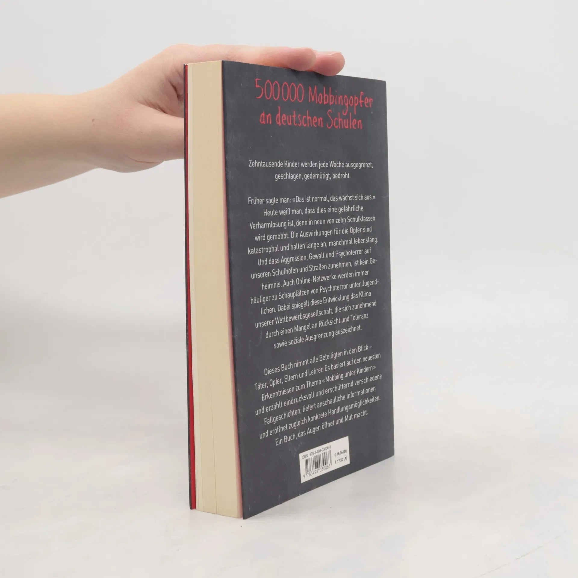 5000 000 Mobbingopfer an deutschen Schulen Zehntausende Kinder werden jede Woche ausgegrenzt, geschlagen, gedemütigt, bedroht. Früher sagte man: «Das ist normal, das wächst sich aus.» Heute weiß man, dass dies eine gefährliche Verharmlosung ist, denn in neun von zehn Schulklassen wird gemobbt. Die Auswirkungen für die Opfer sind katastrophal und halten lange an, manchmal lebenslang. Und dass Aggression, Gewalt und Psychoterror auf unseren Schulhöfen und Straßen zunehmen, ist kein Geheimnis. Auch Online-Netzwerke werden immer häufiger zu Schauplätzen von Psychoterror unter Jugendlichen. Dabei spiegelt diese Entwicklung das Klima unserer Wettbewerbsgesellschaft, die zunehmend durch einen Mangel an Rücksicht und Toleranz sowie soziale Ausgrenzung geprägt ist. Dieses Buch nimmt alle Beteiligten in den Blick – Täter, Opfer, Eltern und Lehrer. Es erklärt, wie Mobbing unter Kindern entsteht, erzählt eindrucksvoll und erschütternd verschiedene Fallgeschichten und eröffnet zugleich konkrete Handlungsmöglichkeiten. Ein Buch, das Augen öffnet und Mut macht, nicht länger wegzuschauen. «Das Buch zeigt, wie die Lust am Mobbing entsteht und was gegen die Grausamkeit hilft.» Stern