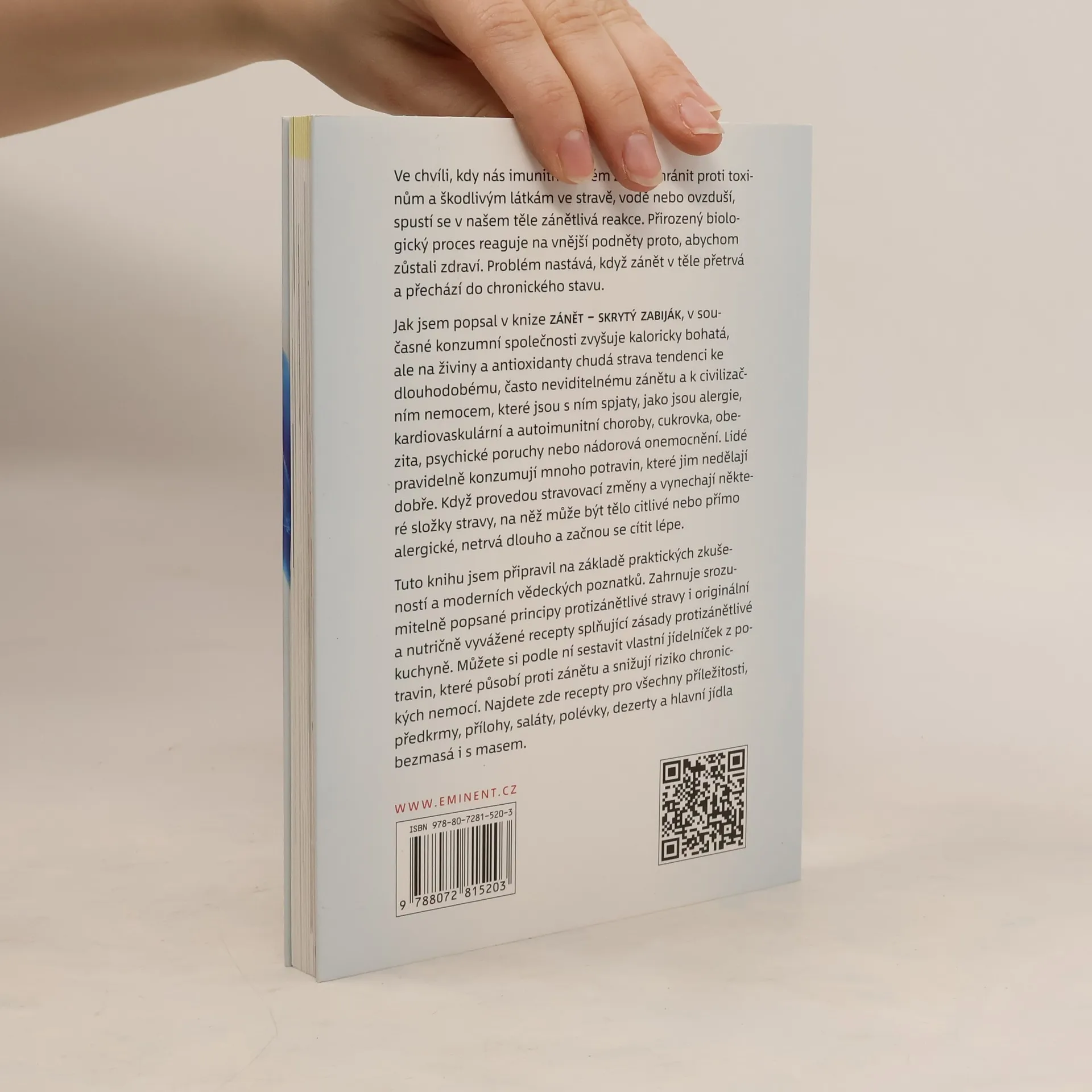Ve chvíli, kdy nás imunitní systém začne chránit proti toxinům a škodlivým látkám ve stravě, vodě nebo ovzduší, spustí se v našem těle zánět. Jako přirozený biologický proces reaguje na vnější podněty proto, abychom zůstali zdraví. Problém nastává tehdy, když v těle přetrvává a přechází do chronického stavu. Jak autor popsal ve své knize Zánět - skrytý zabiják, zvyšuje kaloricky bohatá, na živiny a antioxidanty chudá strava v současné konzumní společnosti tendenci k dlouhodobému a často neviditelnému zánětu a s ním spojených civilizačních nemocí, jako jsou alergie, autoimunitní nemoci, cukrovka, obezita, srdečněcévní nemoci, psychické poruchy nebo nádorová onemocnění. Lidé pravidelně konzumují mnoho potravin, které jim nedělají dobře. Po provedení stravovacích změn a vynechání některých druhů, na které může tělo být citlivé nebo přímo alergické, zpravidla netrvá dlouho a začnou se cítit lépe. Tuto knihu jsem autor připravoval na základě praktických zkušeností a moderních vědeckých poznatků. Zahrnuje srozumitelně popsané principy protizánětlivé stravy i originální a nutričně vyvážené recepty splňující zásady protizánětlivé stravy. Je návodem, který vám pomůže sestavit si vlastní jídelníček z potravin, které působí protizánětlivě a snižují riziko chronických nemocí. Najdete zde recepty pro všechny příležitosti, předkrmy, přílohy, saláty, polévky, hlavní jídla bezmasá i s masem a dezerty.