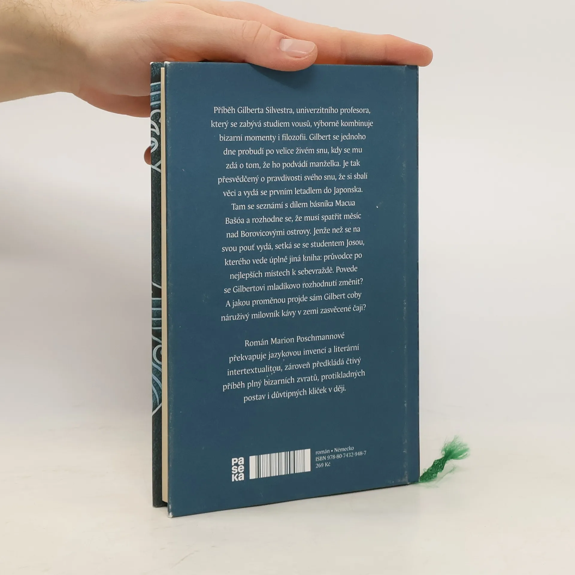 Příběh Gilberta Silvestra, univerzitního profesora, který se zabývá studiem vousů ve filmech, výborně kombinuje bizarní momenty i filozofii. Gilbert se jednoho dne probudí po velice živém snu, v němž se mu zdá o tom, že ho podvádí manželka. Profesor je tak přesvědčený o pravdivosti svého snu, že si sbalí věci a vydá se prvním letadlem do Japonska. Tam se seznámí s dílem básníka Macua Bašóa a rozhodne se, že musí spatřit měsíc nad Borovicovými ostrovy. Jenže ještě než se na svou pouť vydá, setká se se studentem Josou, kterého na cestách vede úplně jiná kniha: průvodce po nejlepších místech k sebevraždě. Povede se mu mladíkovo rozhodnutí změnit? A jakou proměnou projde sám Gilbert coby náruživý milovník kávy v zemi zasvěcené čaji? Román Marion Poschmannové překvapuje jazykovou invencí a literární intertextualitou, zároveň předkládá čtivý příběh plný bizarních zvratů, postav i důvtipných kliček v ději. V Německu je Poschmannová opěvována nejen kritiky, ale především čtenáři.