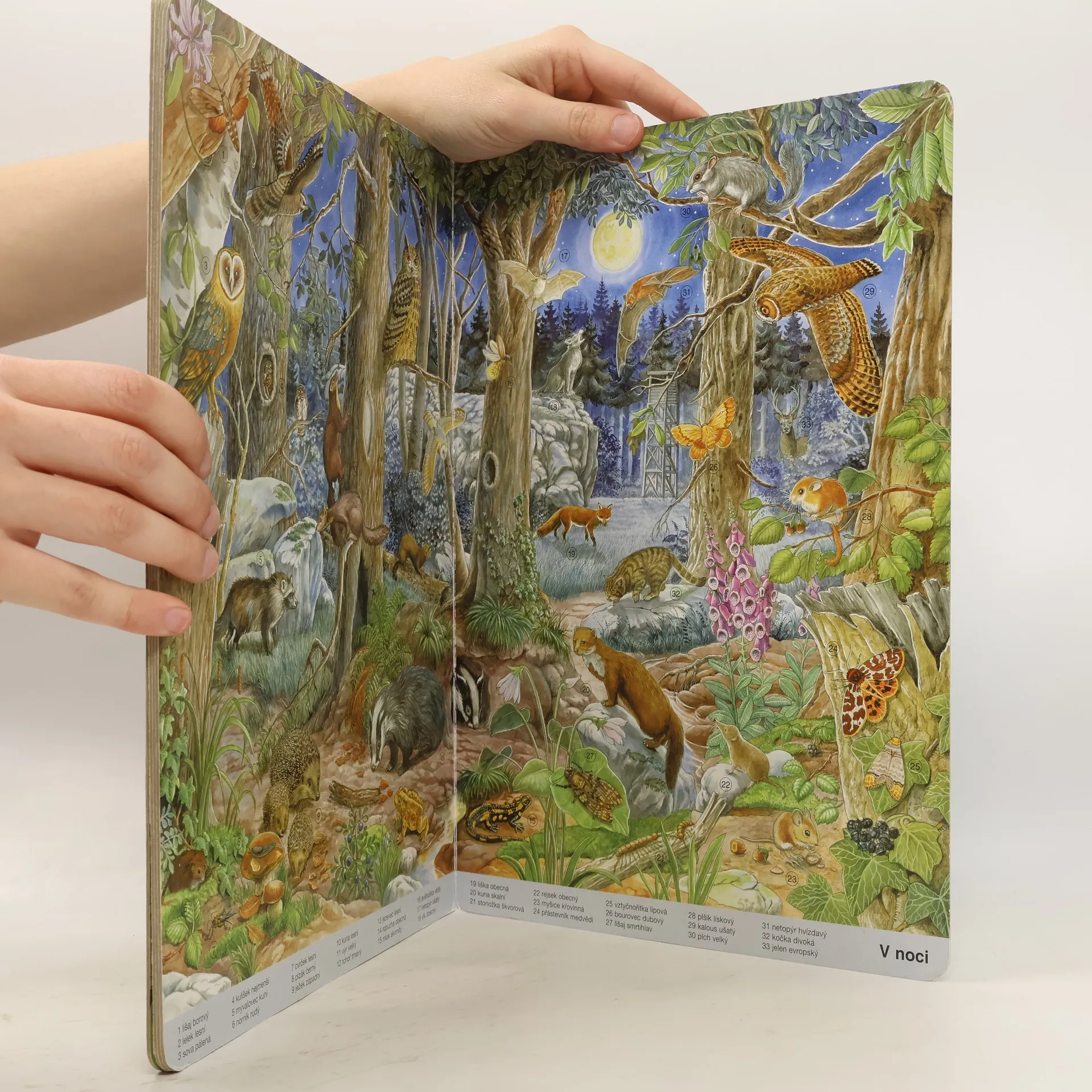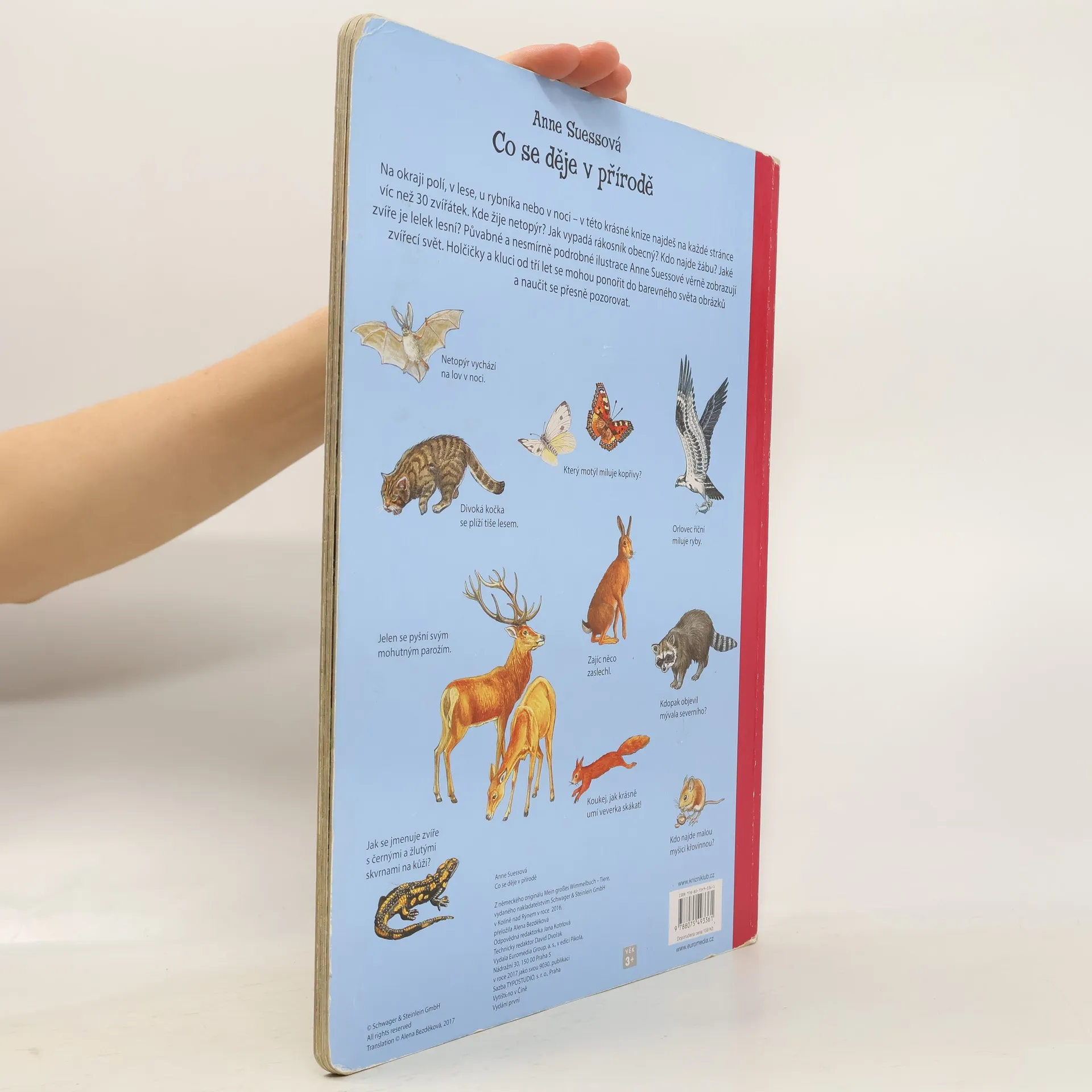 Na okraji polí, v lese, u rybníka nebo v noci – v této krásné knize najdeš na každé stránce víc než 30 zvířátek. Kde žije netopýr? Jak vypadá rákosník obecný? Kdo najde žábu? Jaké zvíře je lelek lesní? Půvabné a nesmírně podrobné ilustrace Anne Suessové věrně zobrazují zvířecí svět. Holčičky a kluci od tří let se mohou ponořit do barevného světa obrázků a naučit se přesně pozorovat.