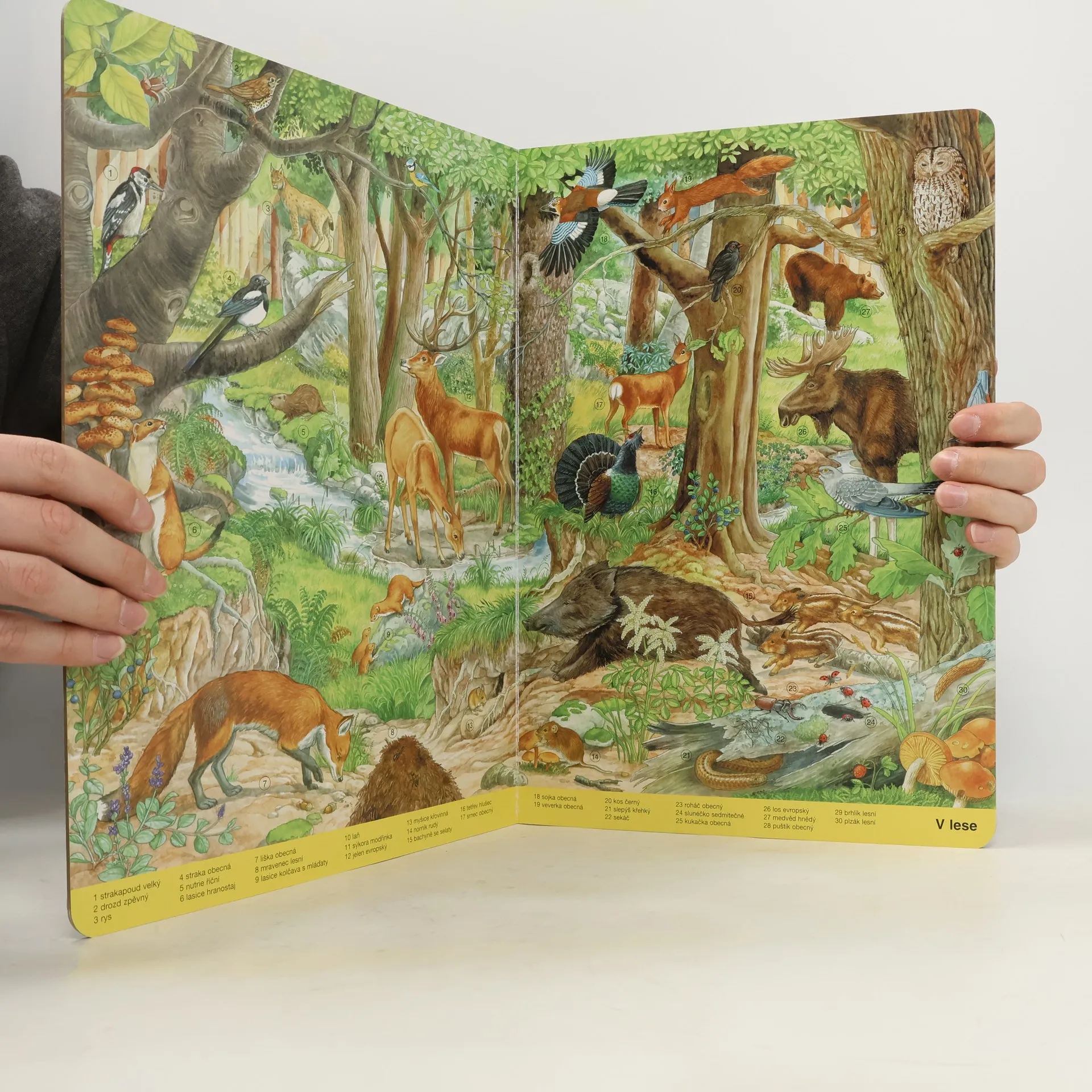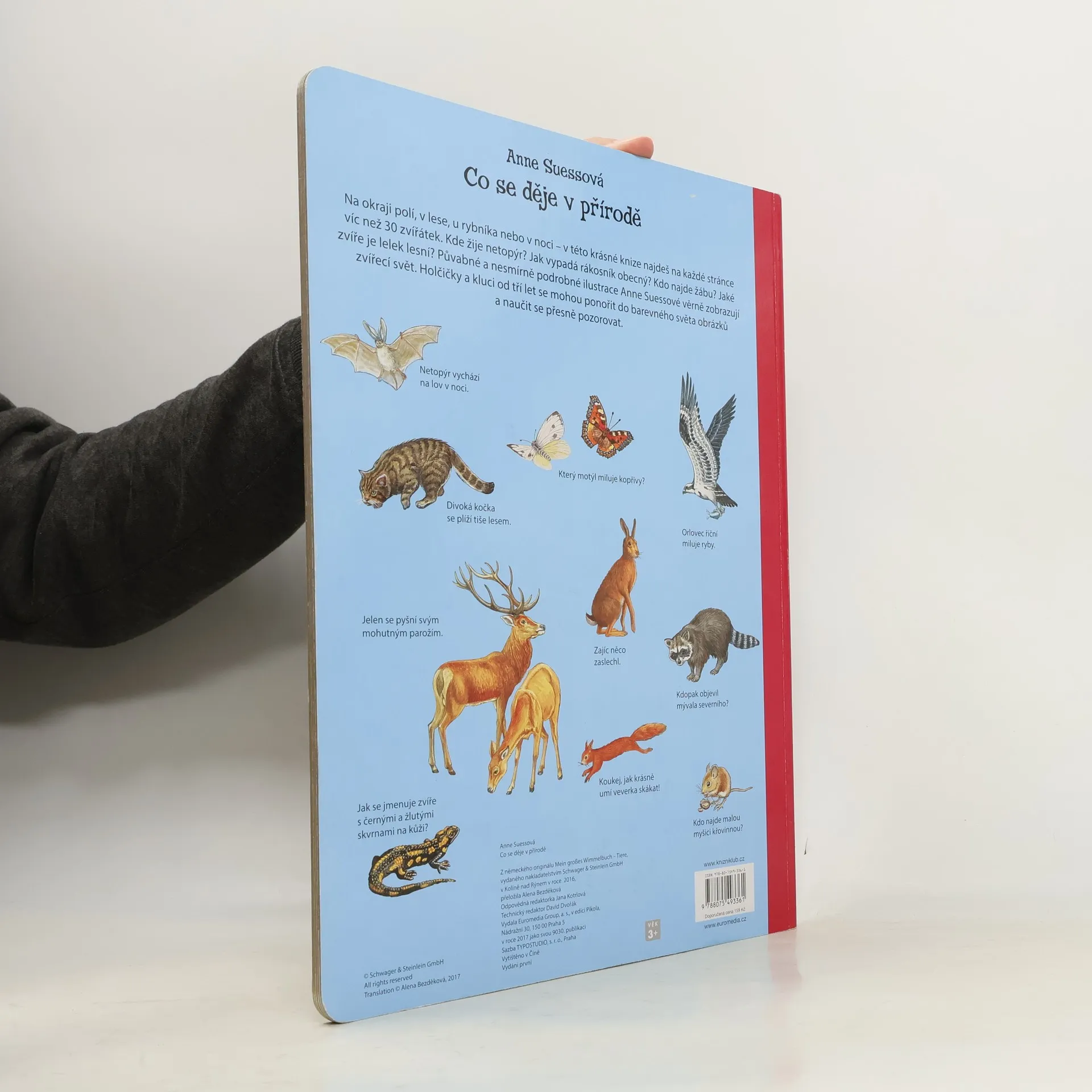 Na okraji polí, v lese, u rybníka nebo v noci – v této krásné knize najdeš na každé stránce víc než 30 zvířátek. Kde žije netopýr? Jak vypadá rákosník obecný? Kdo najde žábu? Jaké zvíře je lelek lesní? Půvabné a nesmírně podrobné ilustrace Anne Suessové věrně zobrazují zvířecí svět. Holčičky a kluci od tří let se mohou ponořit do barevného světa obrázků a naučit se přesně pozorovat.