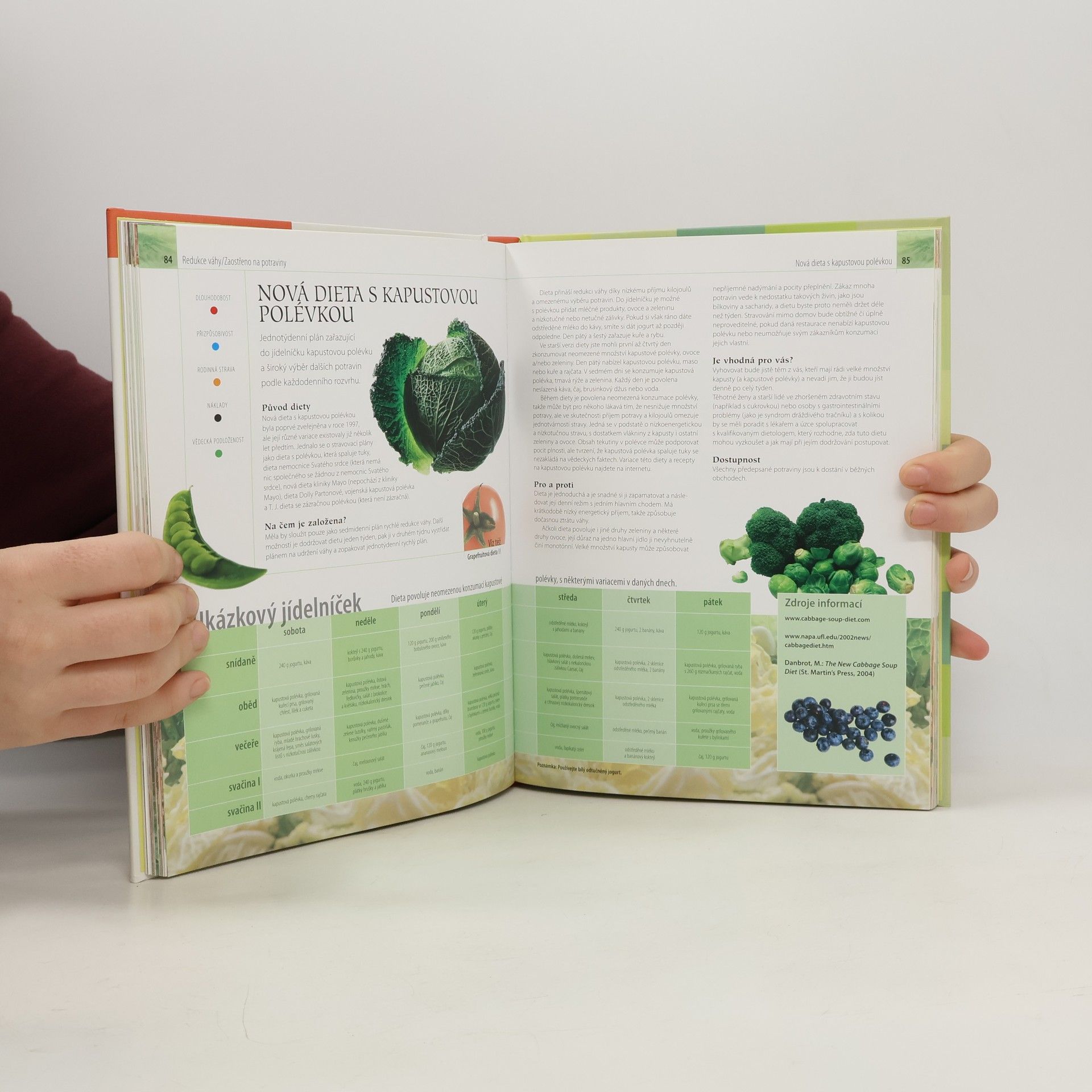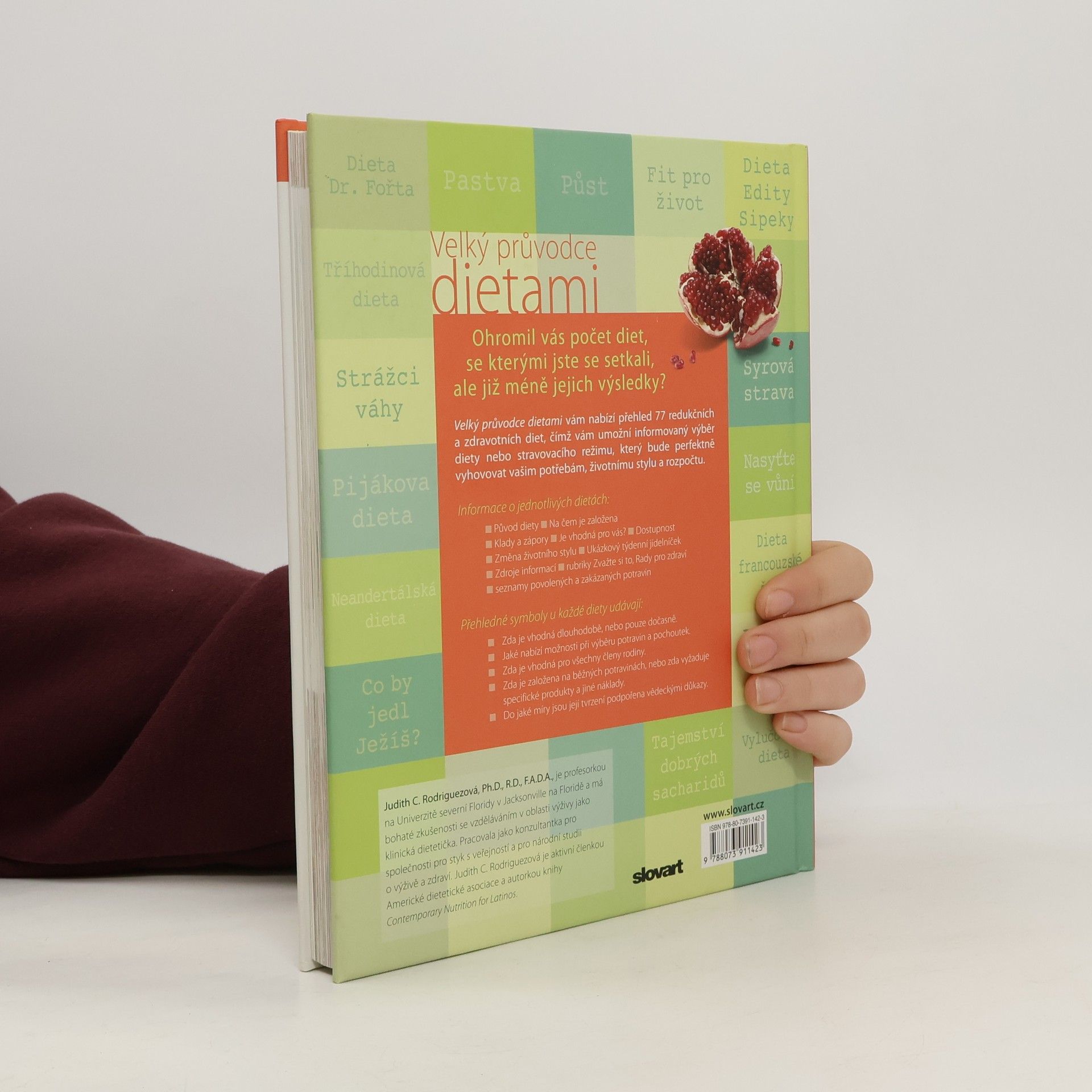 Kniha nabízí přehled 77 redukčních a zdravotních diet, čímž umožňuje informovaný výběr diety nebo stravovacího režimu, který bude vyhovovat konkrétním potřebám, životnímu stylu a rozpočtu. Informace o jednotlivých dietách: - původ diety, na čem je založena - klady a zápory, dostupnost - změna životního stylu, ukázkový týdenní jídelníček - zdroje informací - seznamy povolených a zakázaných potravin Symboly u každé diety udávají: - zda je vhodná dlouhodobě, nebo pouze dočasně - jaké nabízí množství při výběru potravin a pochoutek - zda je vhodná pro všechny členy rodiny - zda je založena na běžných potravinách, nebo zda vyžaduje specifické produkty a jiné náklady - do jaké míry jsou její tvrzení podpořena vědeckými důkazy