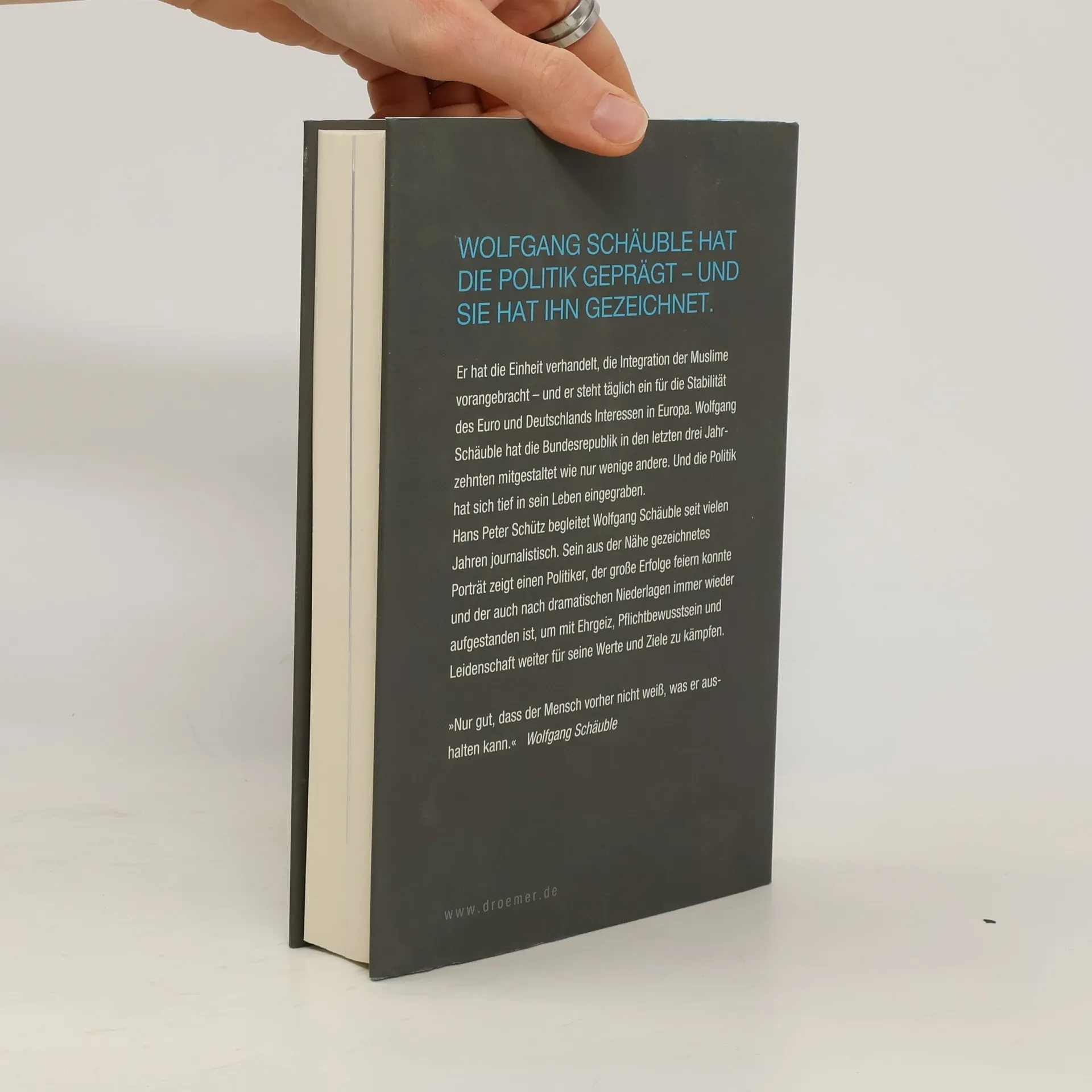 Wolfgang Schäuble gehört seit 40 Jahren zur deutschen Politik: als Manager der Einheit, Wächter der inneren Sicherheit, Troubleshooter der Finanzkrise. Doch seine Karriere kennt auch Brüche. Er ist gescheitert, als er Kanzler und Präsident werden wollte. Und das Land war Zeuge, wie die Vita Schäubles mit dem Attentat in zwei Leben gespalten wurde. Hans Peter Schütz war dabei, als ein geistig Verwirrter die Schüsse abfeuerte. Seither verbindet den Journalisten und den Politiker eine besondere Beziehung. Schütz kann für diese Biographie auf eine Fülle bislang unbekannter Informationen über das Leben des Politikers zurückgreifen. Wolfgang Schäuble erfreut sich zwar großen Respekts, doch geöffnet hat er sich selten. Schütz schildert Schäubles Bruch mit Helmut Kohl, das schwierige Verhältnis zu Angela Merkel, aber auch die Ehe der Schäubles vor und nach dem Attentat. So lernt der Leser den Politiker und Menschen Schäuble neu und anders kennen.