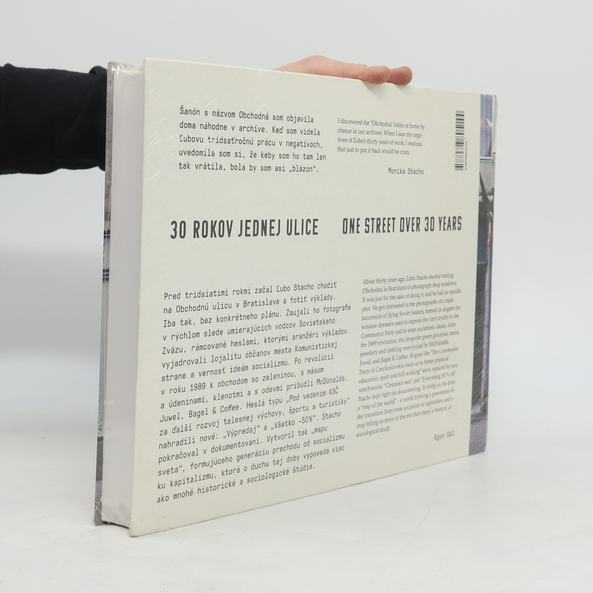 Unikátna fotokniha mapujúca 30 rokov politických, spoločenských a vizuálnych zmien vo výkladoch na Obchodnej ulici v Bratislave. Ľubo Stacho od roku 1984 nafotil vyše 5 000 záberov výkladov na Obchodnej ulici v Bratislave. Päťsto tých najcharakteristickejších v chronologickom zoradení umožňuje nahliadnuť do minulosti našej krajiny cez príbeh jednej z najzaujímavejších bratislavských ulíc. Koniec normalizácie, rady na pomaranče, nástup perestrojky, November ‘89, ranný kapitalizmus, rekonštrukcie a prestavby v 90. rokoch, globalizačné vplyvy, sezónne výpredaje, ale aj čakania „na prenájom“ počas hospodárskej krízy. Viacvrstevnatosť projektu pripomenie ľuďom, ktorí to zažili, ako sa naša spoločnosť vyvíjala, a mladšej generácii naopak umožňuje spoznať jej príbeh cez vizuálne atraktívne svedectvo. V knihe sú texty približujúce Obchodnú ulicu a celý projekt z rôznych pohľadov – historika a kurátora fotografie Aurela Hrabušického, kurátorky súčasného umenia Petry Hanákovej, historičky architektúry Henriety Moravčíkovej a sociológa Miroslava Tížíka. Autorom grafického dizajnu knihy je Boris Meluš.