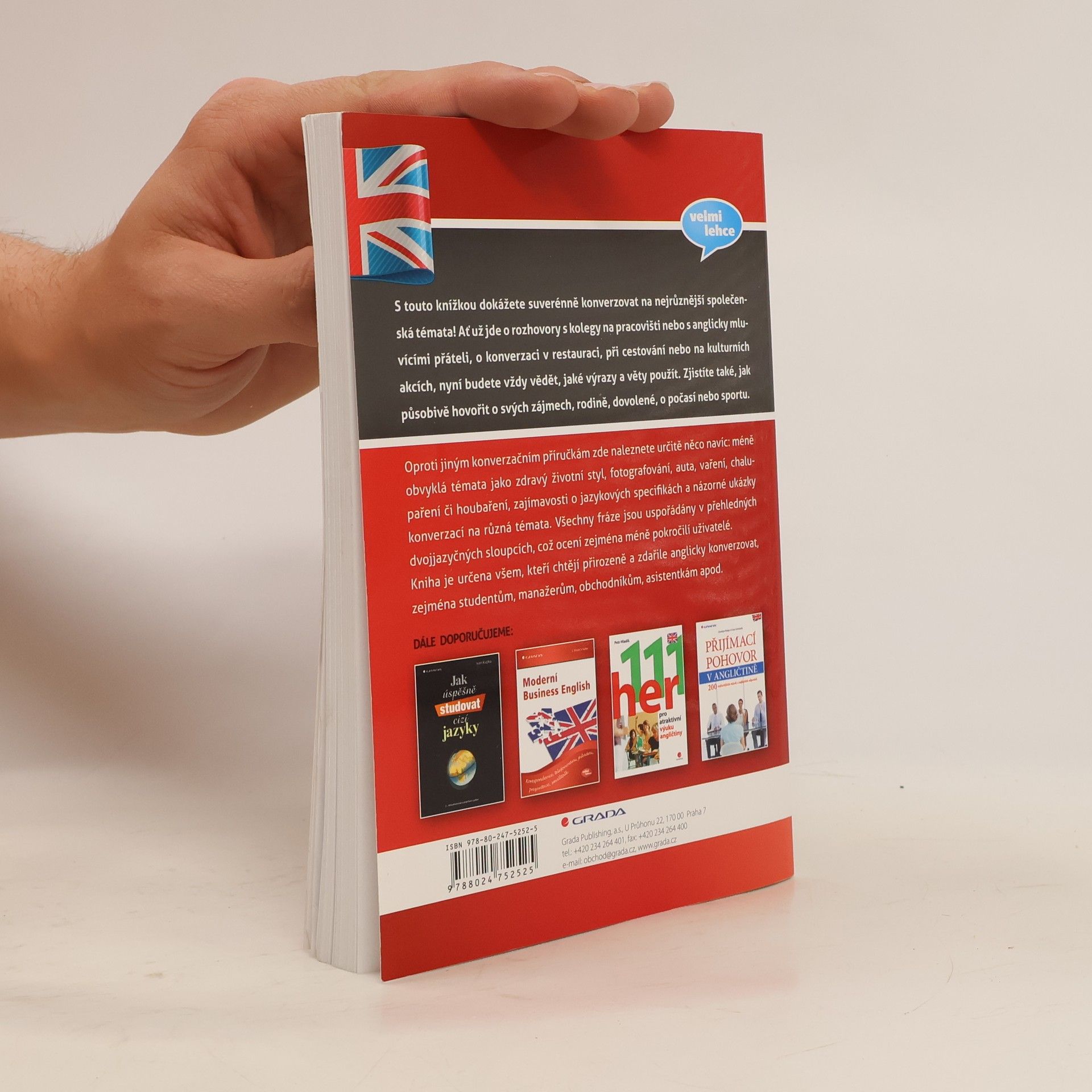 S touto knížkou dokážete suverénně konverzovat na nejrůznější společenská témata! Ať už jde o rozhovory s kolegy na pracovišti nebo s anglicky mluvícími přáteli, o konverzaci v restauraci, při cestování nebo na kulturních akcích, nyní budete vždy vědět, jaké výrazy a věty použít. Zjistíte také, jak působivě hovořit o svých zájmech, rodině, dovolené, o počasí nebo sportu. Oproti jiným konverzačním příručkám zde naleznete určitě něco navíc: méně obvyklá témata jako zdravý životní styl, fotografování, auta, vaření, chalupaření či houbaření, zajímavosti o jazykových specifikách a názorné ukázky konverzací na různá témata. Všechny fráze jsou uspořádány v přehledných dvojjazyčných sloupcích, což ocení zejména méně pokročilí uživatelé. Kniha je určena všem, kteří chtějí přirozeně a zdařile anglicky konverzovat, zejména studentům, manažerům, obchodníkům, asistentkám apod.