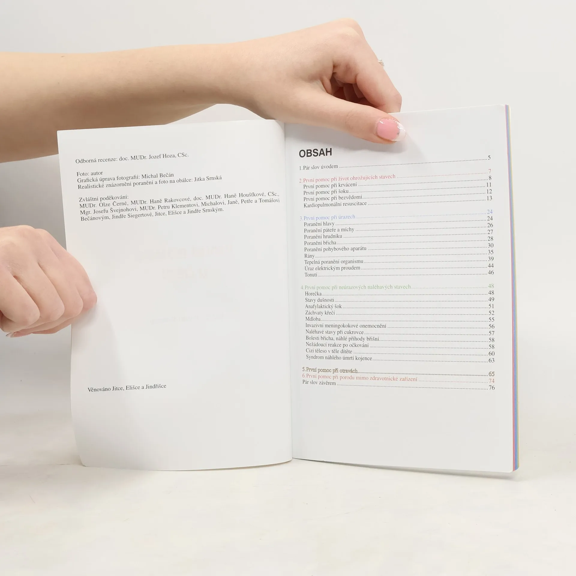 Tato publikace je určena rodičům a všem dospělým osobám, kteří se o děti starají (kromě domácností ji ocení například i pedagogové a vychovatelé dětí). Kniha poskytuje základní informace o stavech, při kterých dochází k ohrožení zdraví dítěte a poučí čtenáře jak těmto stavům předejít. Obsahuje jednoduchý a dostatečný návod jak takové situace řešit a jak postupovat v rámci první pomoci.Publikace je přehledná a velmi srozumitelně napsaná, doplněná bohatou obrazovou barevnou dokumentací (96 obrázků a schémat).Kniha by tedy neměla chybět v žádné knihovničce!