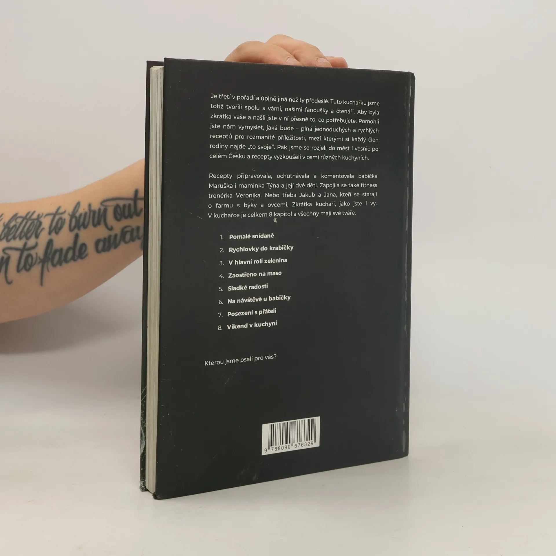 Máme za sebou pěkný kus cesty. Slíbili jsme, že připravíme kuchařku podle vašich přání. Tak jsme pracovali 8 měsíců, ujeli 1 438 kilometrů, vařili v osmi kuchyních po různých koutech Česka – a nezapomněli se radit s vámi. Děkujeme vám za pomoc a podporu! V kuchařce najdete od každého něco – péct budete s mámou Týnou a jejími dětmi. S babičkou Maruškou a její vnučkou ochutnáte tradiční recepty v netradiční podobě. A s fitness trenérkou Verčou se podíváte na to, jaké recepty si můžete zabalit s sebou do krabičky. V celkem 8 kapitolách najdete 110 receptů pro různé příležitosti.