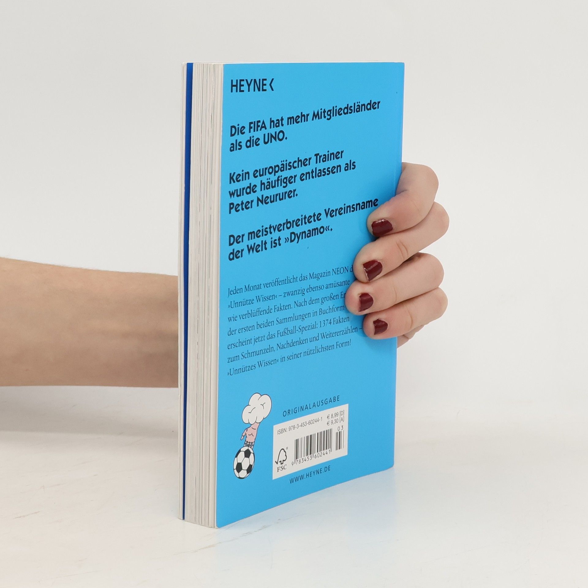 74 Prozent aller Männer wären gerne selbst Fußballprofis – um eine La-Ola-Welle zu starten, sind mindestens 30 Leute nötig – der brasilianische Klub Íbis ist mit 0,88 erzielten Toren pro Jahr der schlechteste Fußballverein der Welt. Monatlich liefert NEON in der Kultrubrik »Unnützes Wissen« 20 so amüsante wie verblüffende Fakten, die von der Fangemeinde jedes Mal sehnsüchtig erwartet werden. Nach dem Megaerfolg des unnützen Wissens in Buchform kommt jetzt unnützes Fußballwissen: Ob zum Schmunzeln, Nachdenken oder Weitererzählen – unnützes Wissen in seiner nützlichsten Form! Ausstattung: durchgehend 4c