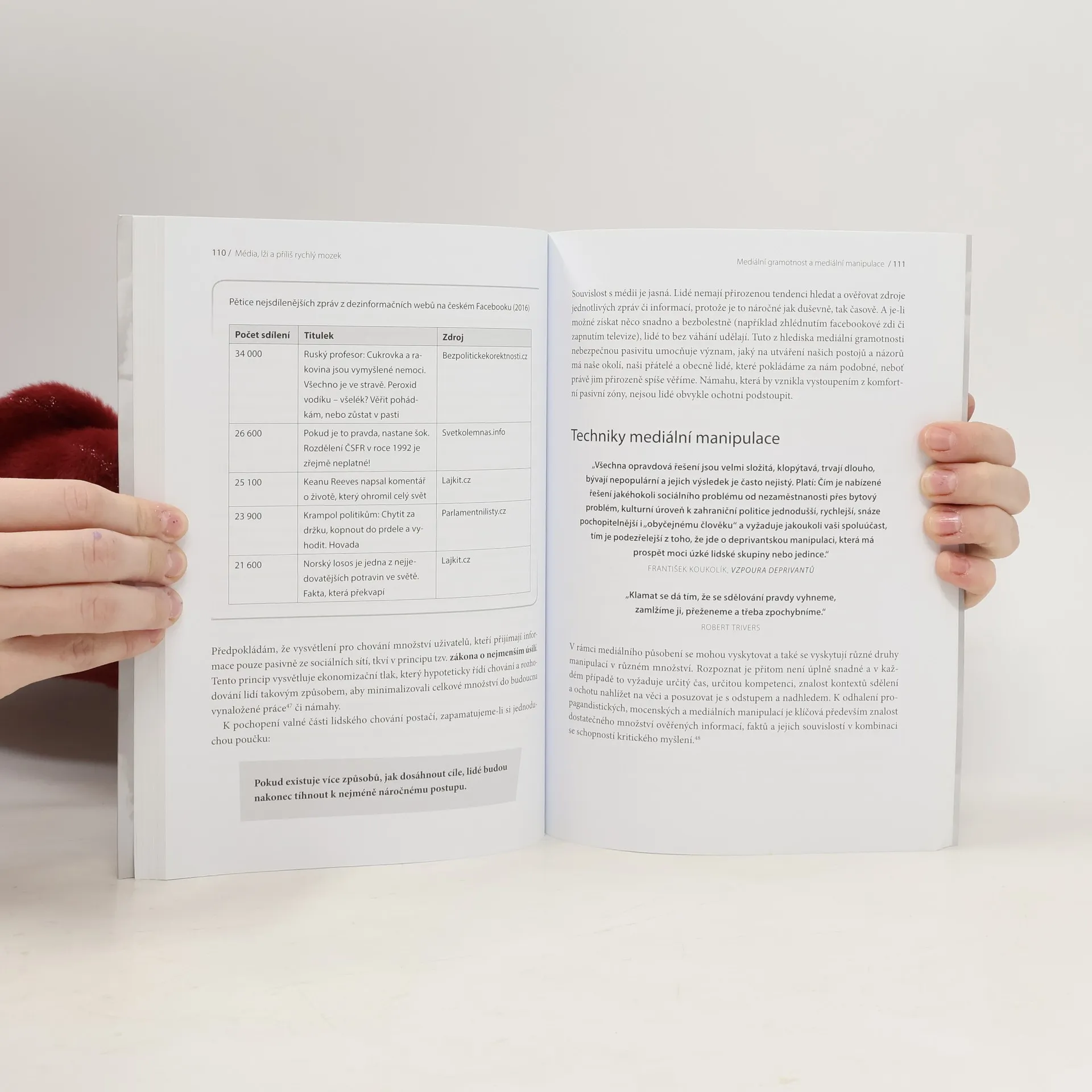 - Jak jsme manipulováni a nevíme o tom? - Co jsou to hoaxy? - Ukazují média svět takový, jaký skutečně je? - Proč nám politici lžou? - Co je to mediální gramotnost? - Proč je potřeba kritické myšlení? - A jak si s námi zahrává mozek? To jsou jen některé z aktuálních otázek, na které najdete odpovědi v této knize. Jejím autorem je spoluzakladatel webu manipulatori.cz, který se snaží podporovat nezávislé a kritické myšlení a odkrývat mediální lži. V první části knihy odhalíte zákonitosti našeho chování a rozhodování. Zjistíte, proč naše přání tak často formují budoucnost, pochopíte, jak nás ovlivňuje naše vlastní iracionalita, proč podléháme skupinové hlouposti a jak snadno se dopouštíme myšlenkových chyb. Druhá část knihy se věnuje žhavé současnosti. Zaměřuje se na běžně užívané argumentační fauly a na odhalení manipulativních a propagandistických postupů v politice i médiích. Poznáte zákulisí mediálního průmyslu a výroby zpráv i techniky, jak námi média mohou manipulovat. A v neposlední řadě porozumíte tomu, jak odhalovat falešné zprávy, poznat pravdu od lži a nepodlehnout konspiračnímu myšlení.