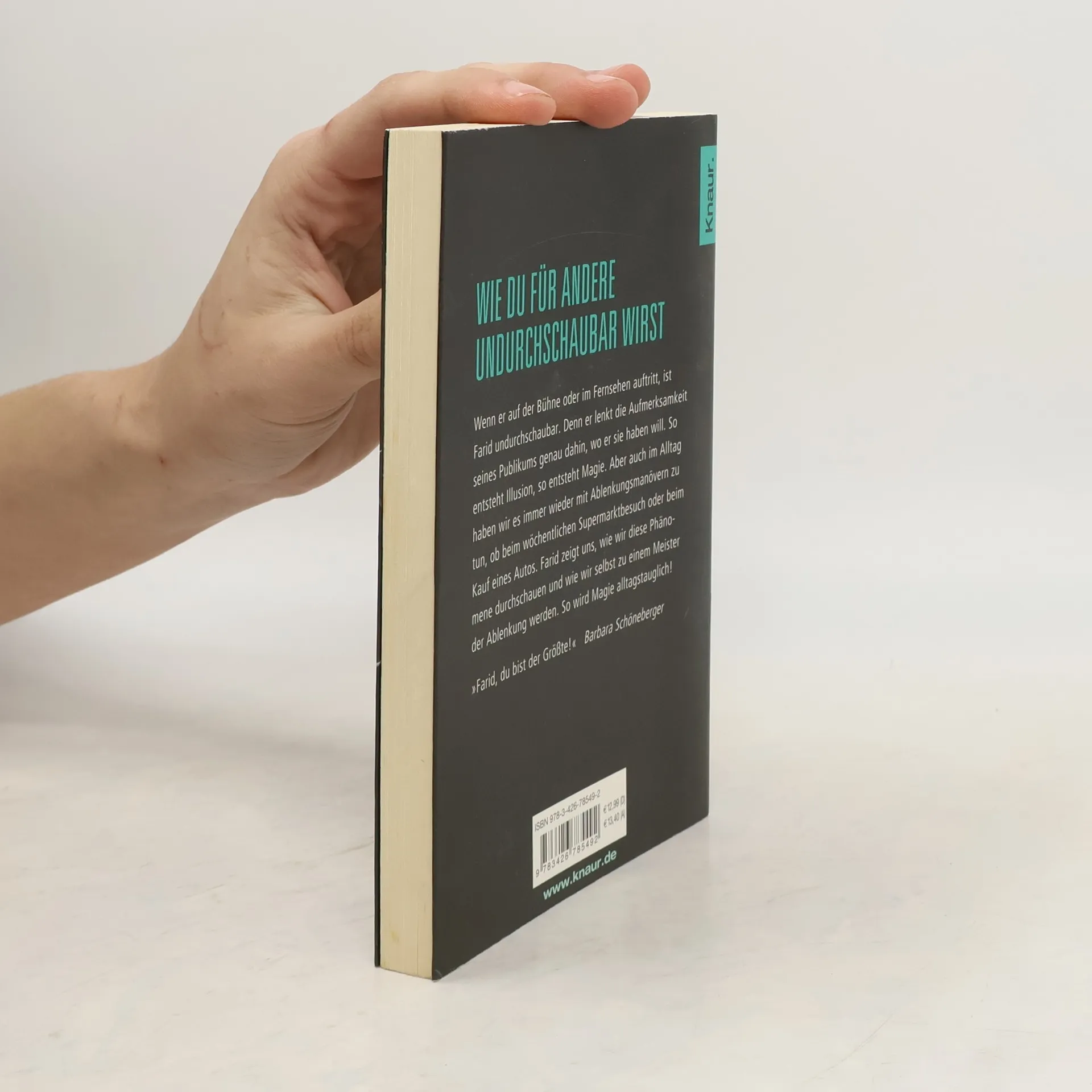 Wie du für andere undurchschaubar wirst Wenn er auf der Bühne oder im Fernsehen auftritt, ist Farid undurchschaubar. Denn er lenkt die Aufmerksamkeit seines Publikums genau da hin, wo er sie haben – oder nicht haben – will. So entsteht Illusion, so entsteht Magie. Aber auch im Alltag haben wir es immer wieder mit Ablenkungsmanövern zu tun, ob beim wöchentlichen Supermarktbesuch oder beim Kauf eines Autos. Farid zeigt uns, wie wir diese Phänomene durchschauen und wie wir selbst zu einem Meister der Ablenkung werden. So wird Magie alltagstauglich! „Farid, du bist der Größte!“ Barbara Schöneberger