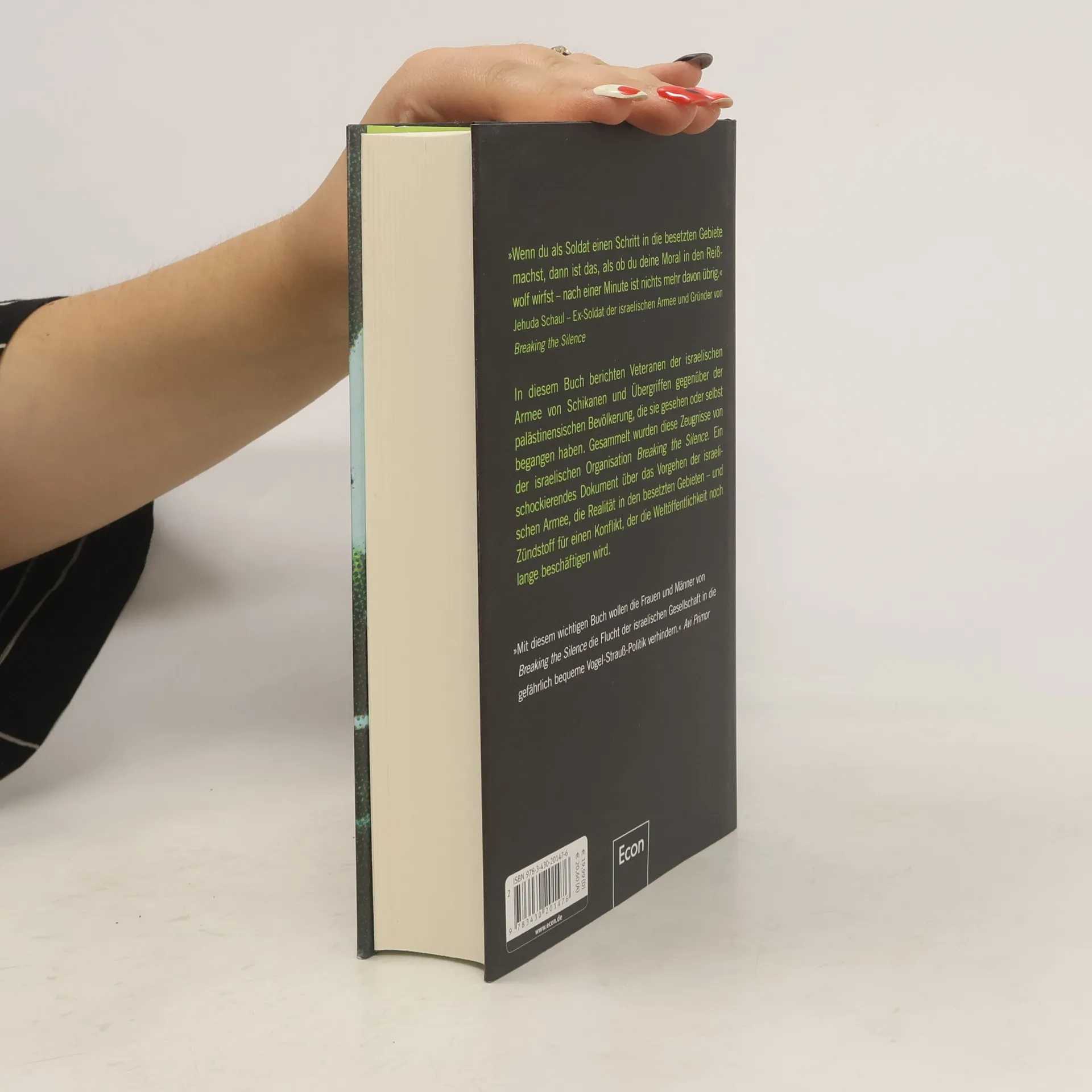 »Wenn du als Soldat einen Schritt in die besetzten Gebiete machst, dann ist das, als ob du deine Moral in den Reißwolf wirfst – nach einer Minute ist nichts mehr davon übrig.« Jehuda Schaul – Ex-Soldat der israelischen Armee und Gründer von Breaking the Silence In diesem Buch berichten Veteranen der israelischen Armee von Schikanen und Übergriffen gegenüber der palästinensischen Bevölkerung, die sie gesehen oder selbst begangen haben. Gesammelt wurden diese Zeugnisse von der israelischen NGO Breaking the Silence. Ein schockierendes Dokument über das Vorgehen der israelischen Armee, die Realität in den besetzten Gebieten – und Zündstoff für einen Konflikt, der die Weltöffentlichkeit noch lange beschäftigen wird.