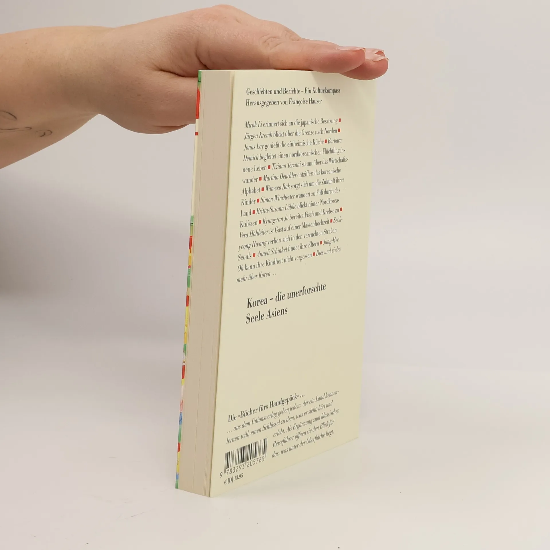 Mirok Li erinnert sich an die japanische Besatzung Jürgen Kremb blickt über die Grenze nach Nordkorea Jonas Ley genießt die einheimische Küche Barbara Demick begleitet einen nordkoreanischen Flüchtling ins neue Leben Tiziano Terzani staunt über das Wirtschaftswunder Martina Deuchler entziffert das koreanische Alphabet Wan-Seo Bak sorgt sich um die Zukunft ihrer Kinder Simon Winchester wandert zu Fuß durch das Land Britta-Susann Lübke blickt hinter Nordkoreas Kulissen Kyung-ran Jo bereitet Fisch und Krebse zu Vera Hohleiter ist Gast auf einer Massenhochzeit Seok-yeong Hwang verliert sich in den verruchten Straßen Seouls Anneli Schinkel findet ihre Eltern Jung-Hee Oh kann ihre Kindheit nicht vergessen Dies und vieles mehr über Korea …