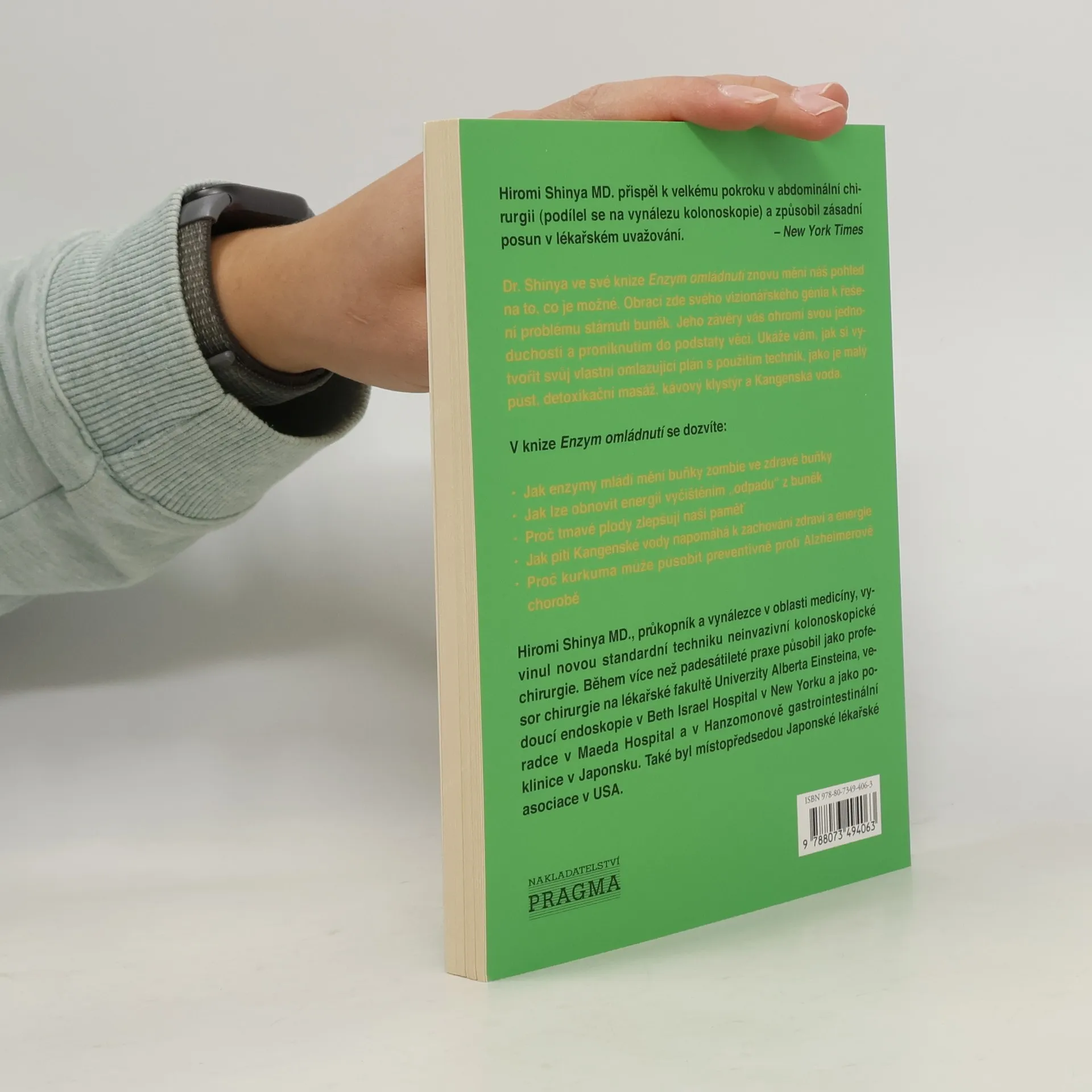Světově uznávaný gastroenterolog Hiromi Shinya, proslulý objevem kolonoskopie, představuje svou další knihu Enzym omládnutí, která se ve světě stala bestsellerem. Svými knihami se snaží vést lidi ke změně jídelníčku, který podle jeho slov může za vážná onemocnění jako Alzheimerova choroba nebo rakovina. Ukazuje, že zlepšením přijímané stravy a zavedením jednoduchých půldenních půstů můžeme podpořit regenerační a omlazující schopnost našich buněk. Kniha je snadným návodem, jak můžeme sami zlepšit nejen fyzické, ale také psychické zdraví.