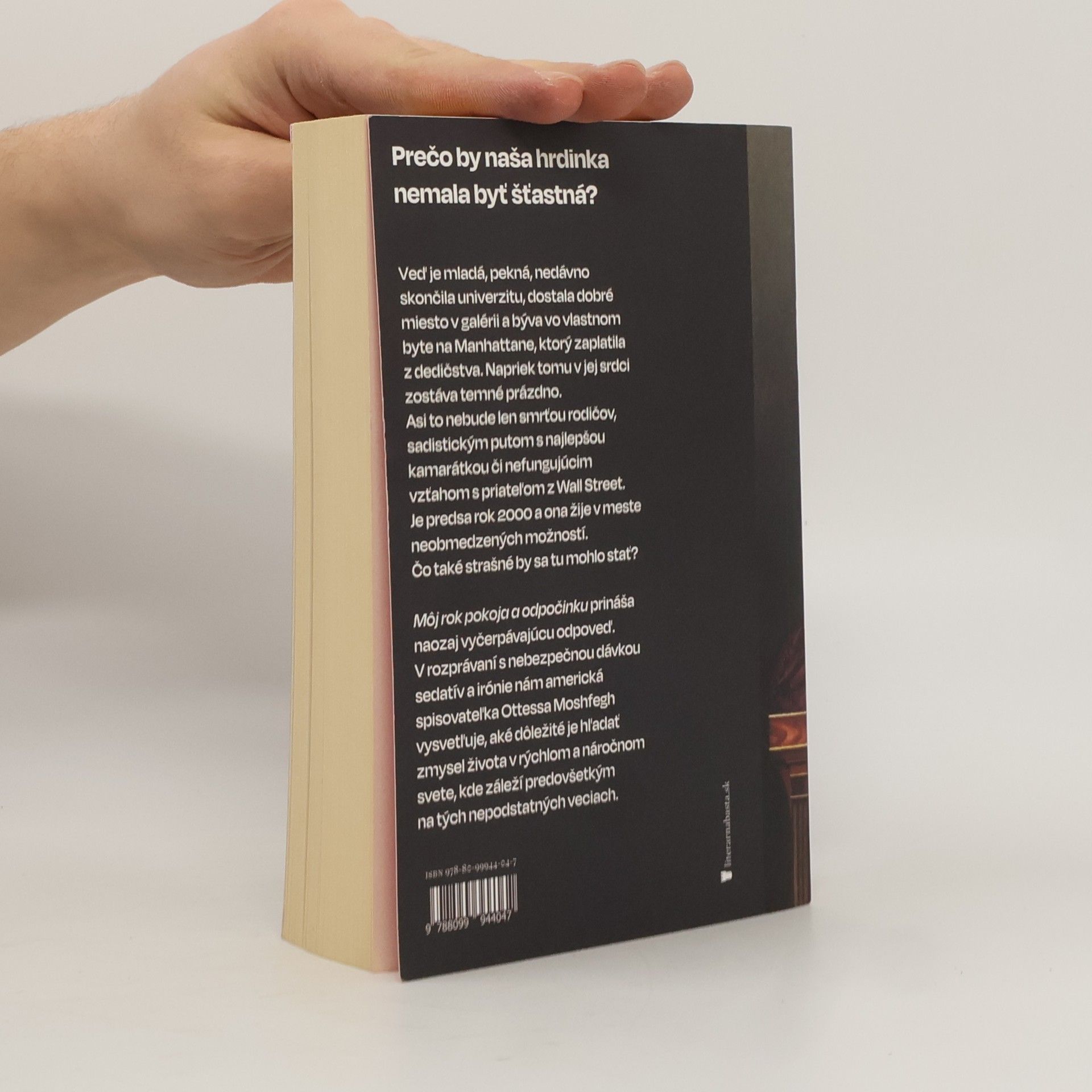 Prečo by naša hrdinka nemala byť šťastná? Veď je mladá, pekná, nedávno skončila univerzitu, dostala dobré miesto v galérii a býva vo vlastnom byte na Manhattane, ktorý zaplatila z dedičstva. Napriek tomu v jej srdci zostáva temné prázdno. Asi to nebude len smrťou rodičov, sadistickým putom s najlepšou kamarátkou či nefungujúcim vzťahom s priateľom z Wall Street. Je predsa rok 2000 a ona žije v meste neobmedzených možností. Čo také strašné by sa tu mohlo stať? Môj rok pokoja a odpočinku prináša naozaj vyčerpávajúcu odpoveď. V rozprávaní s nebezpečnou dávkou sedatív a irónie nám americká spisovateľka Ottessa Moshfegh vysvetľuje, aké dôležité je hľadať zmysel života v rýchlom a náročnom svete, kde záleží predovšetkým na tých nepodstatných veciach.